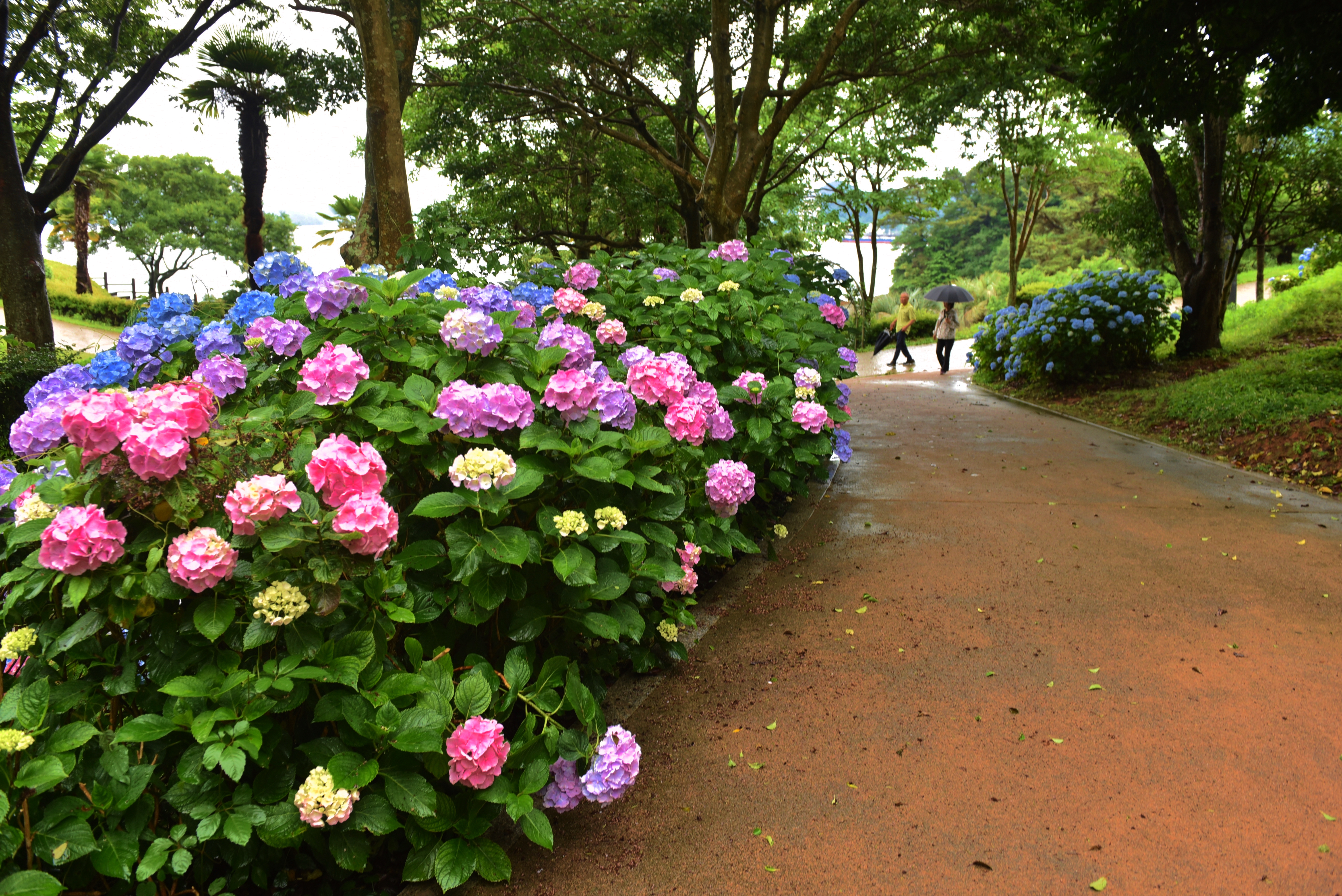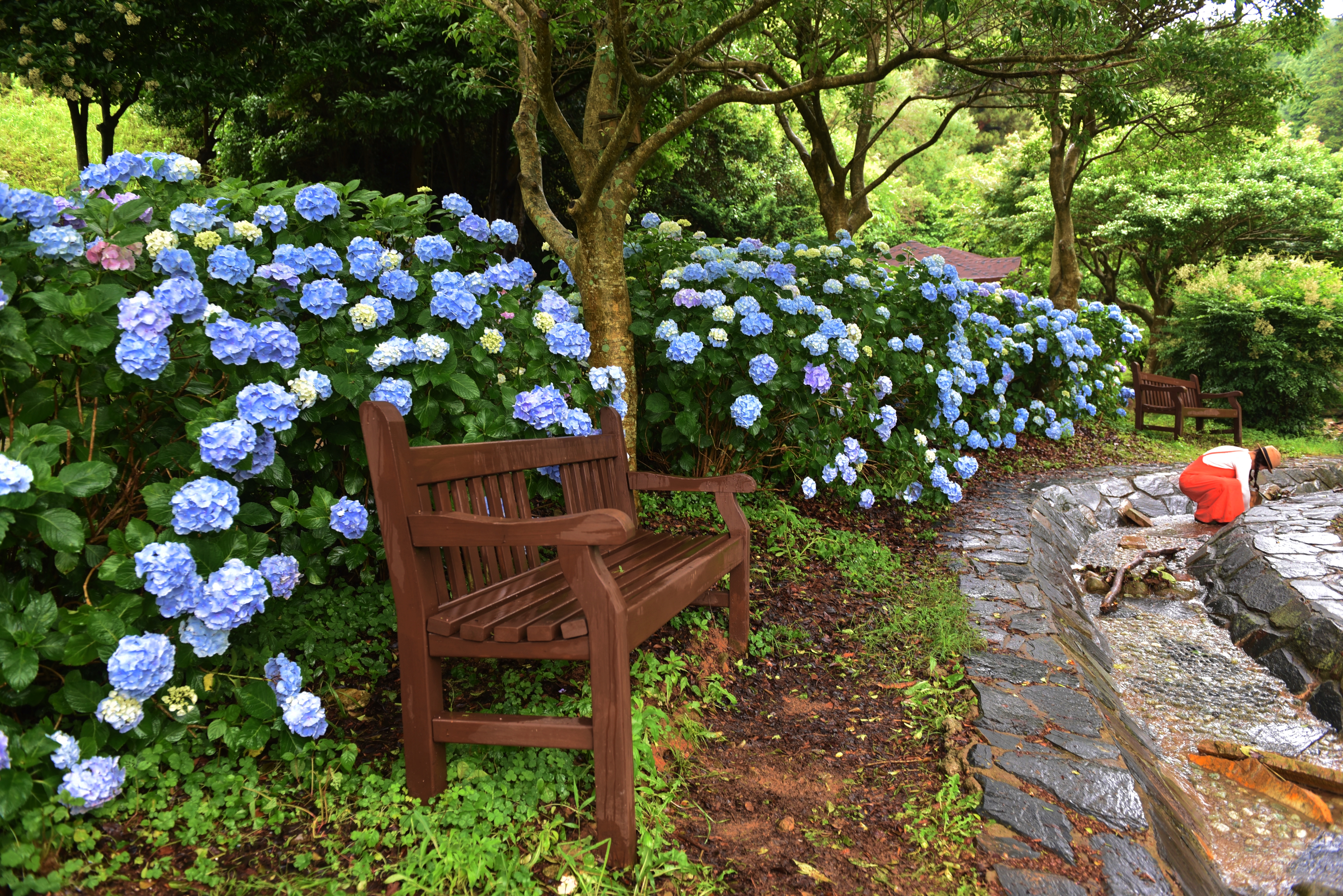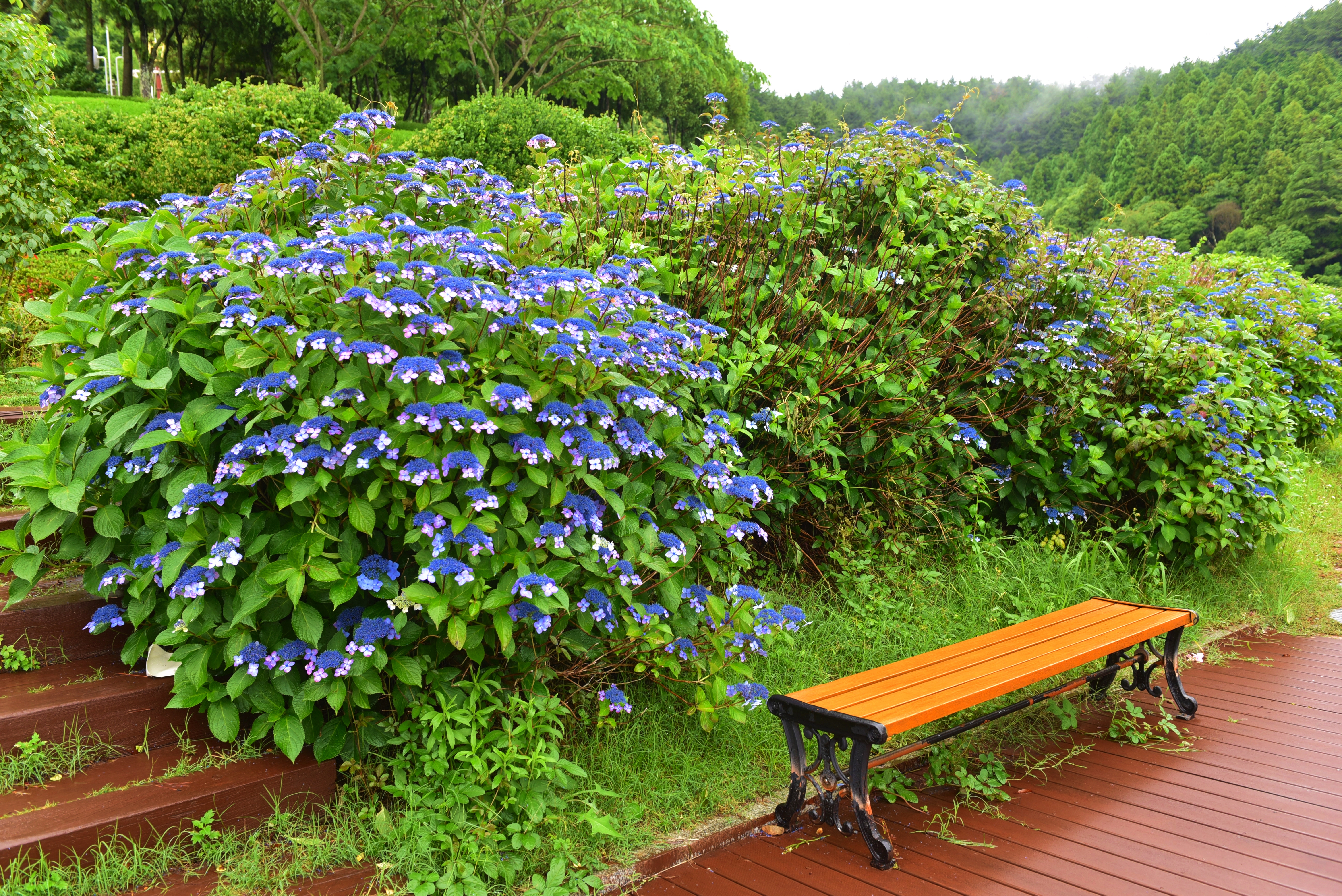 벤치 포토존과 어우러진 수국꽃길의 풍광