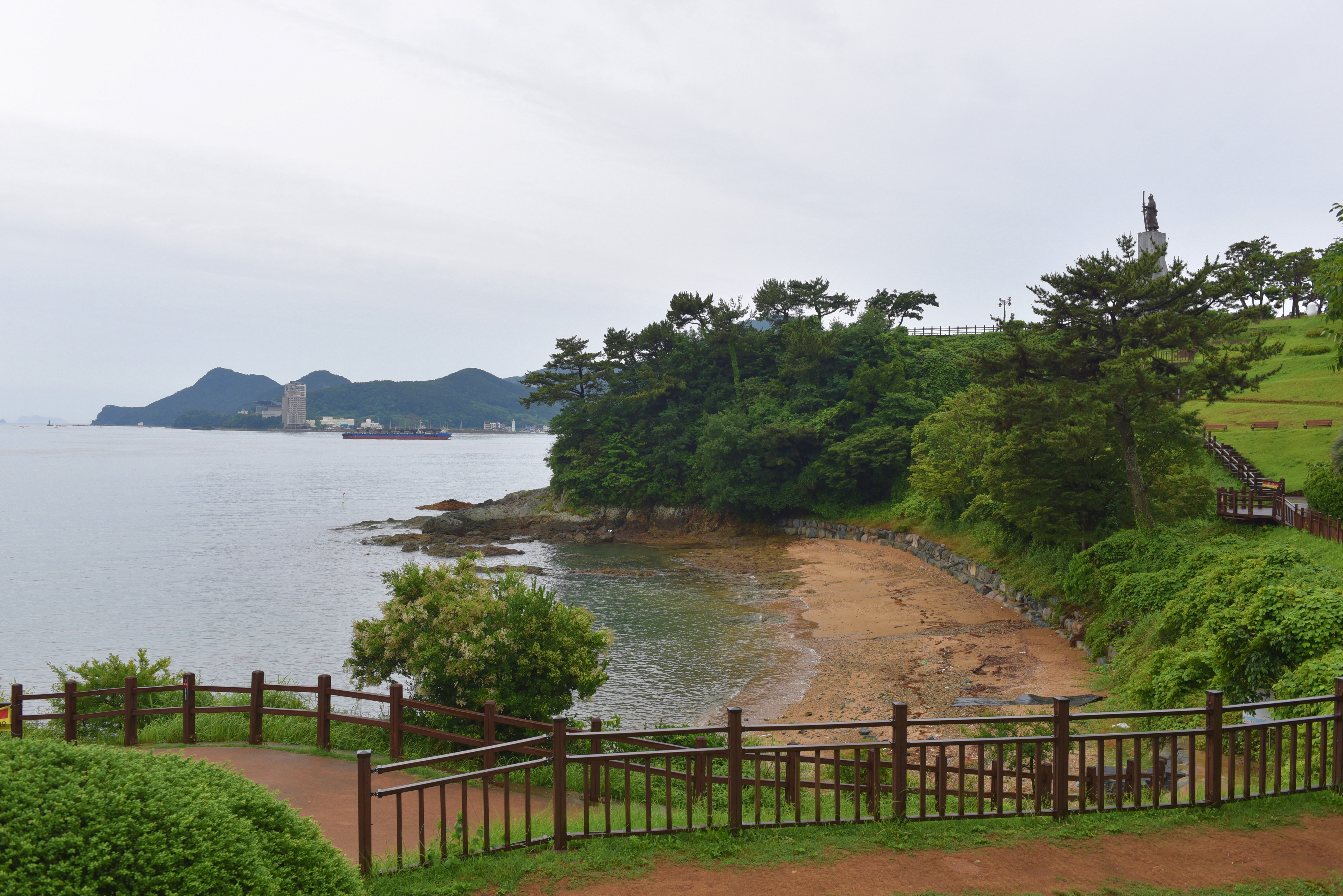 공원 해변과 멀리 미륵산 쪽을 담고...