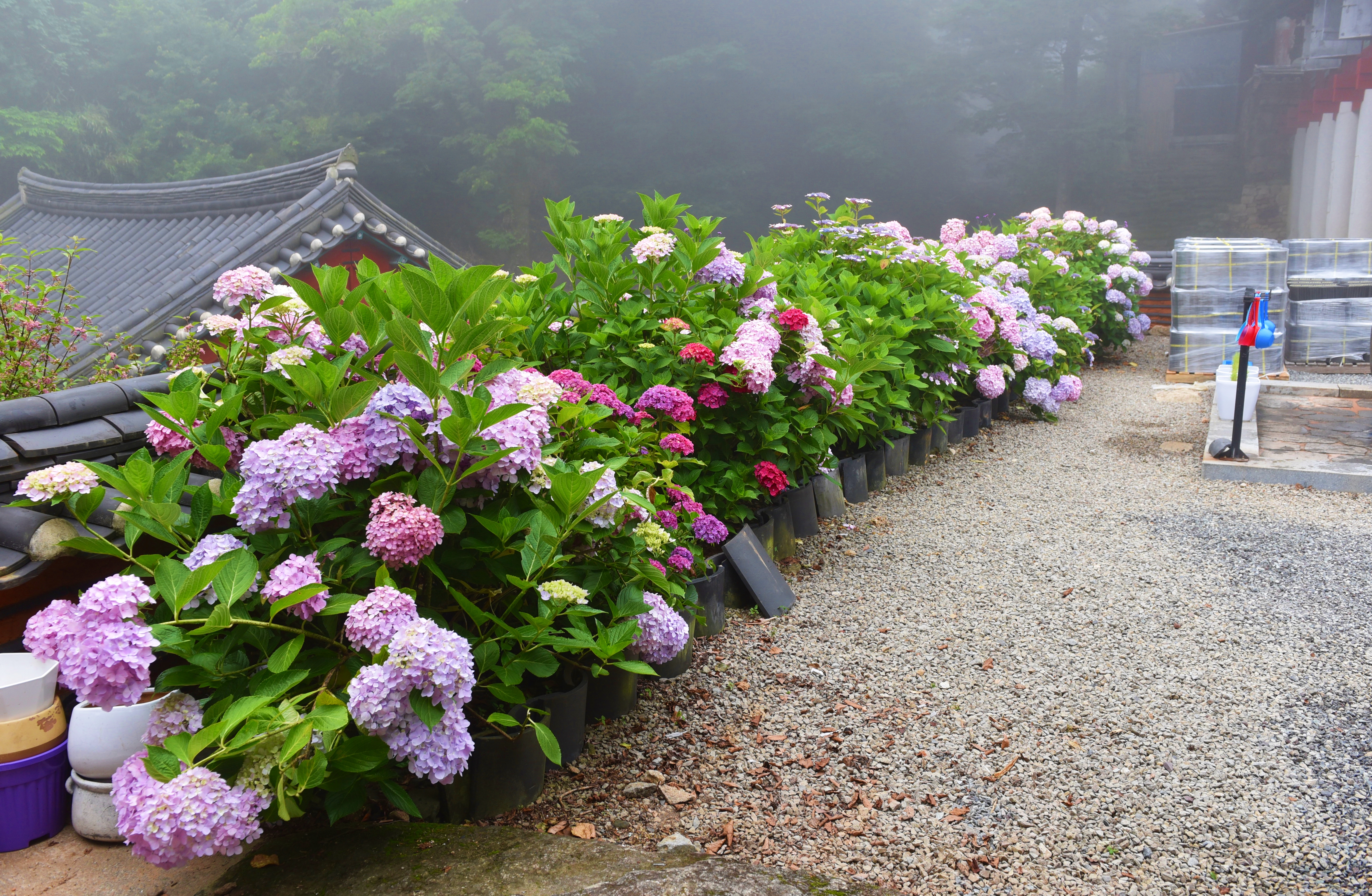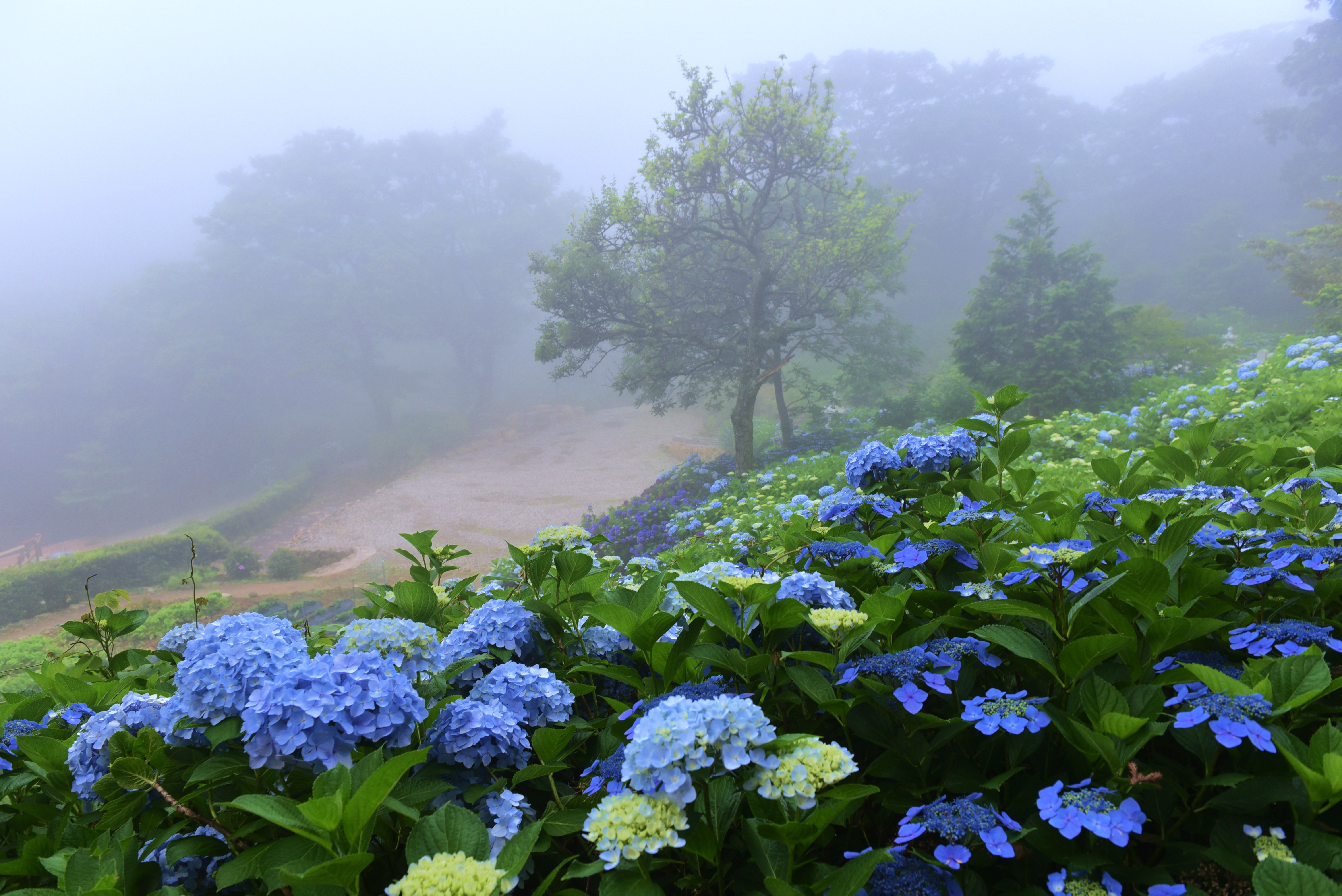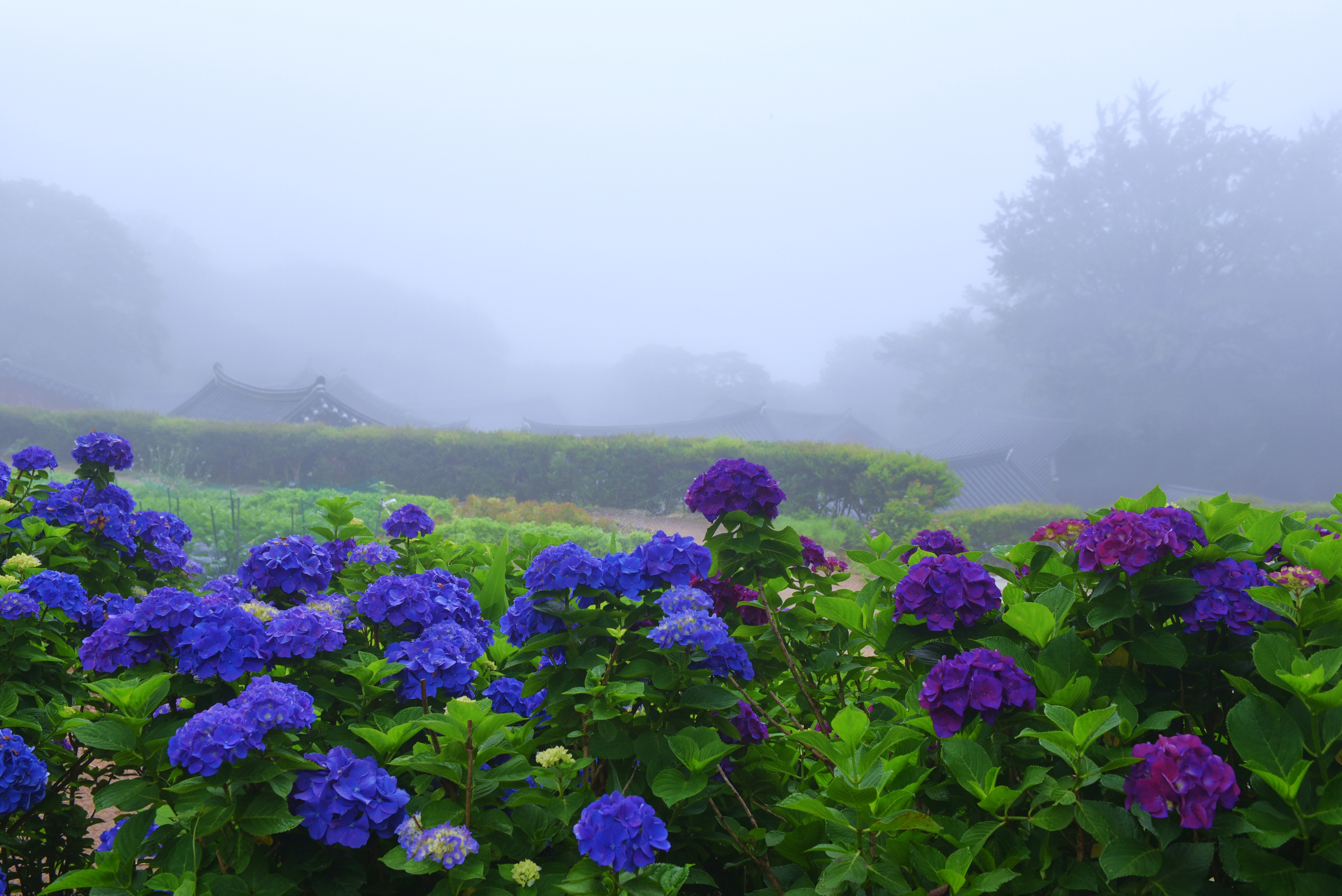 짙은 안개와 수국이 어우러진
