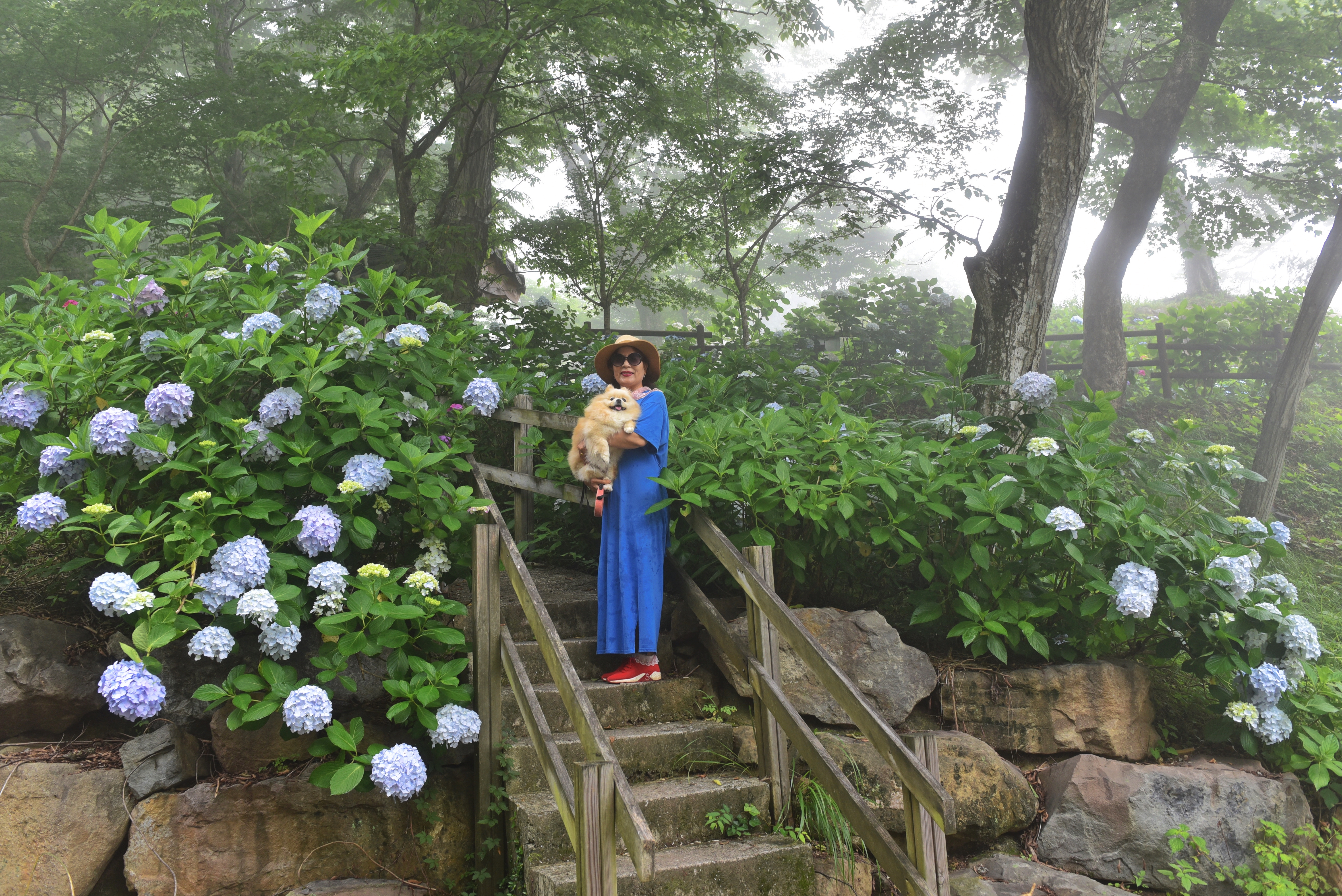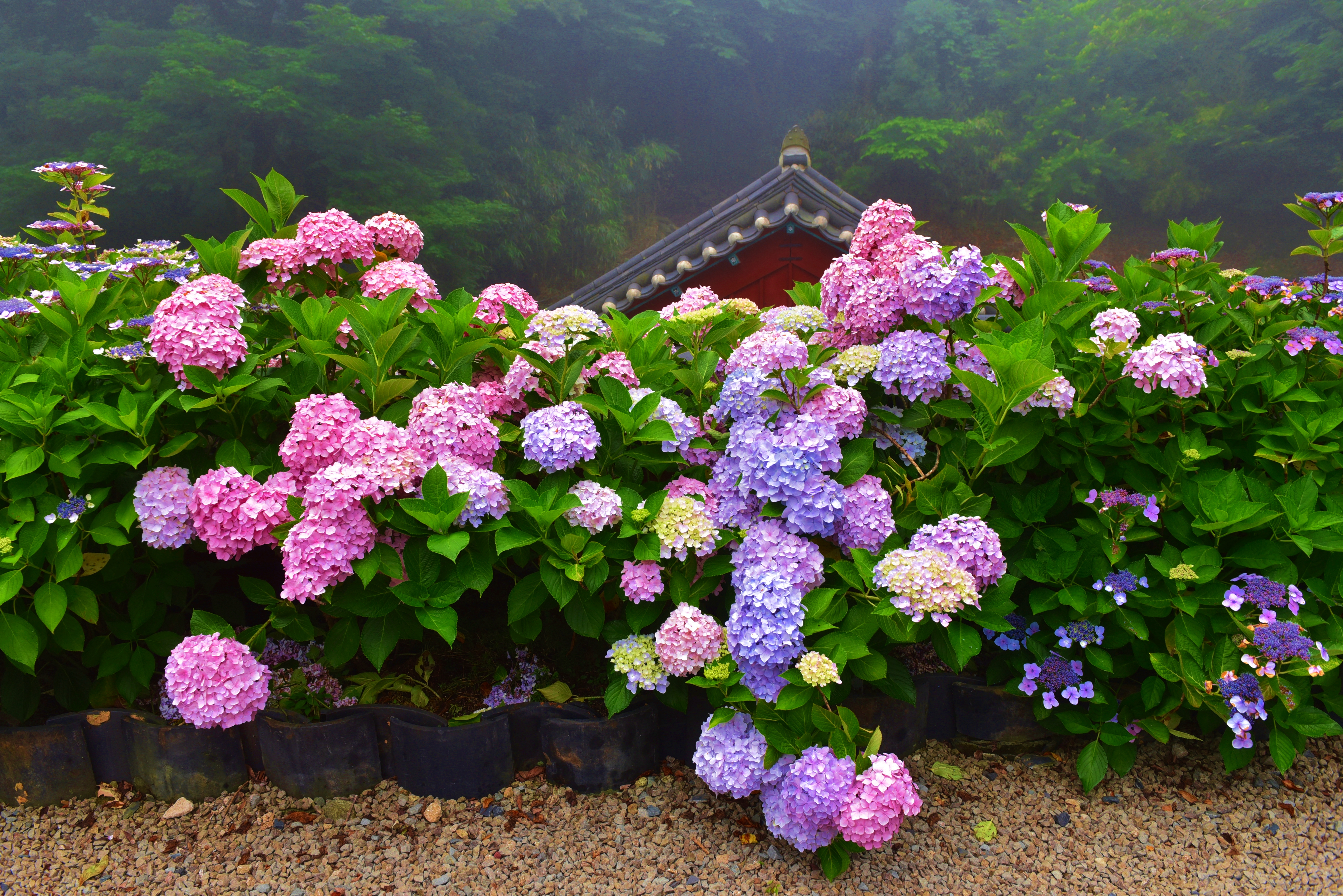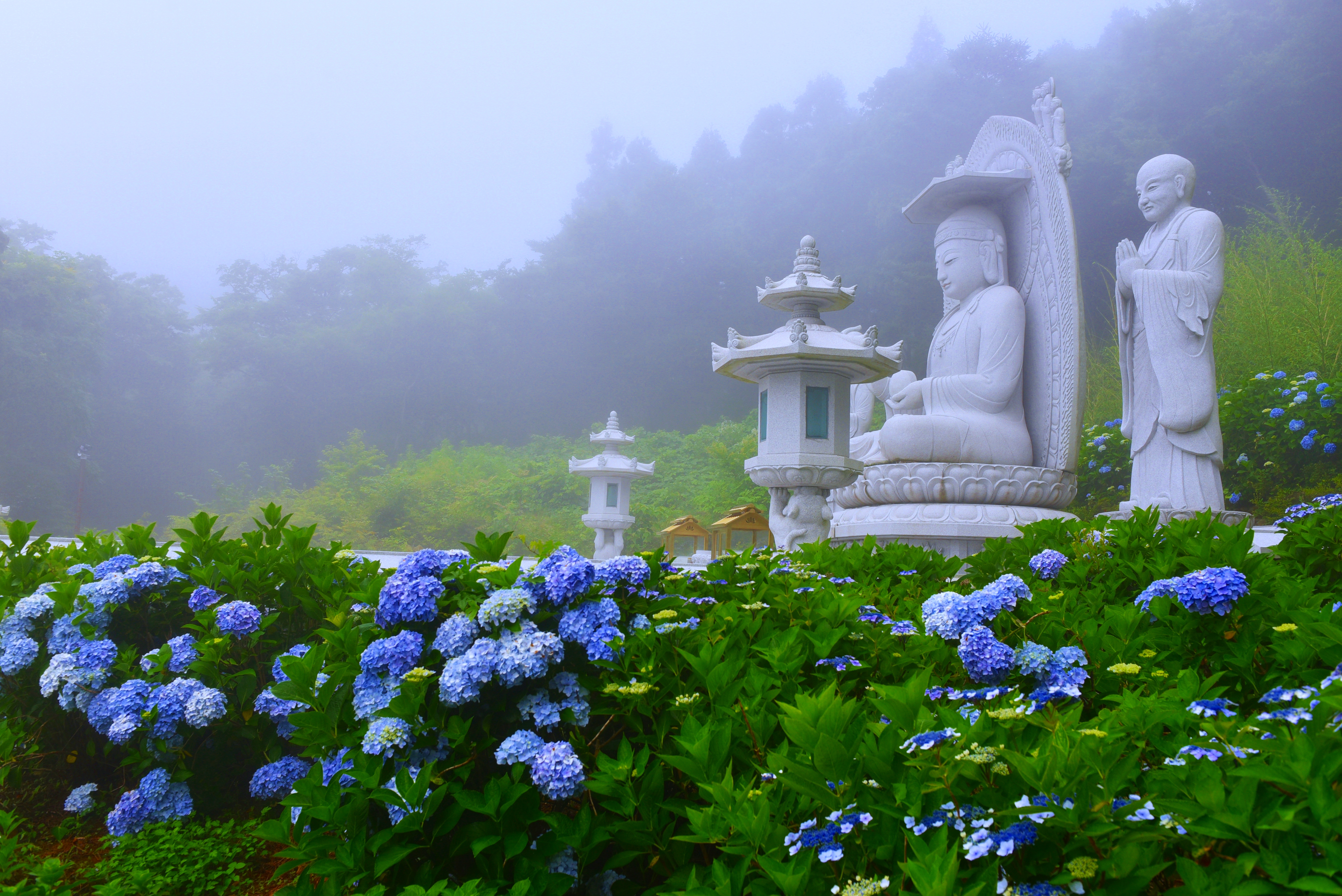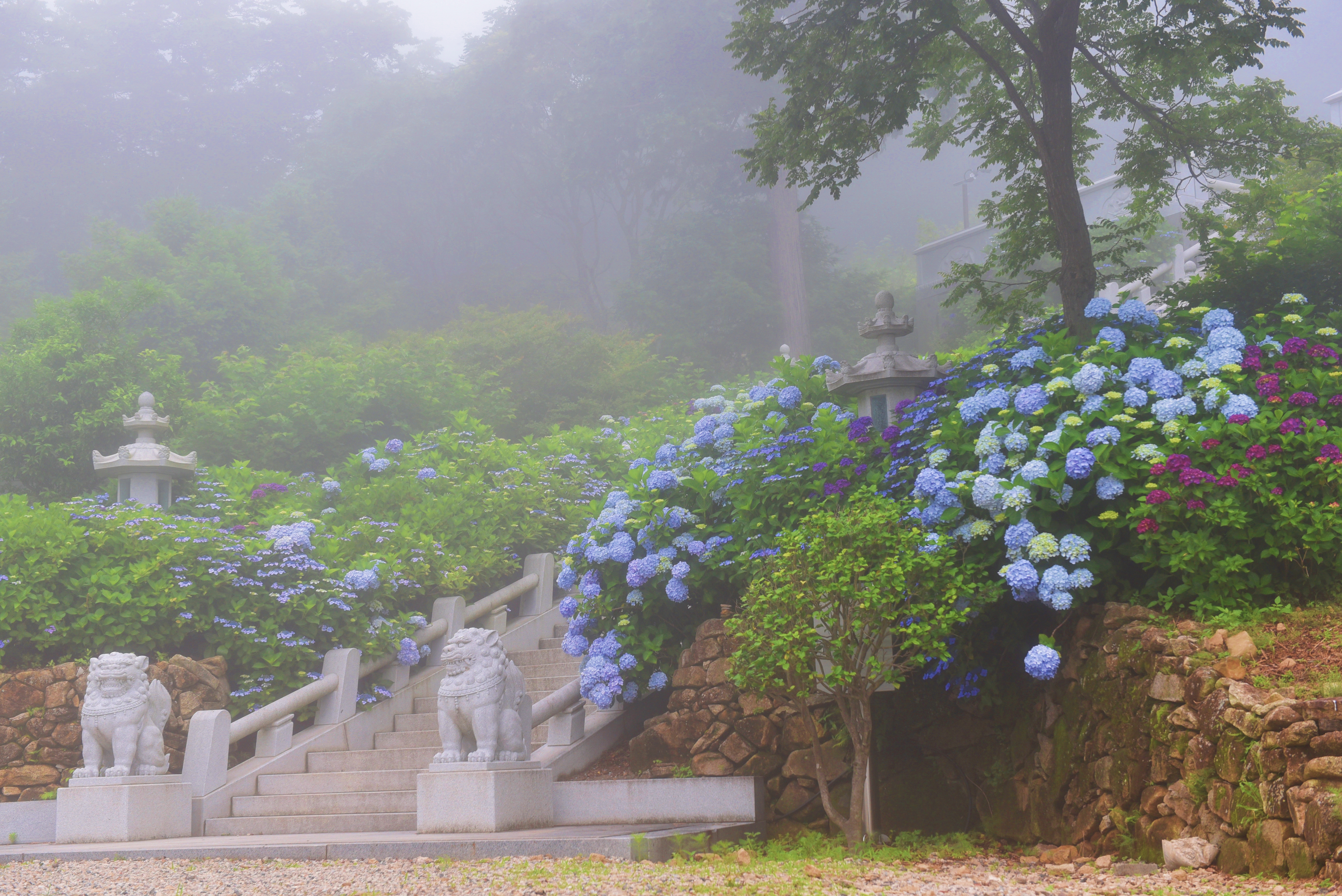 짙은 안개와 수국이 어우러진