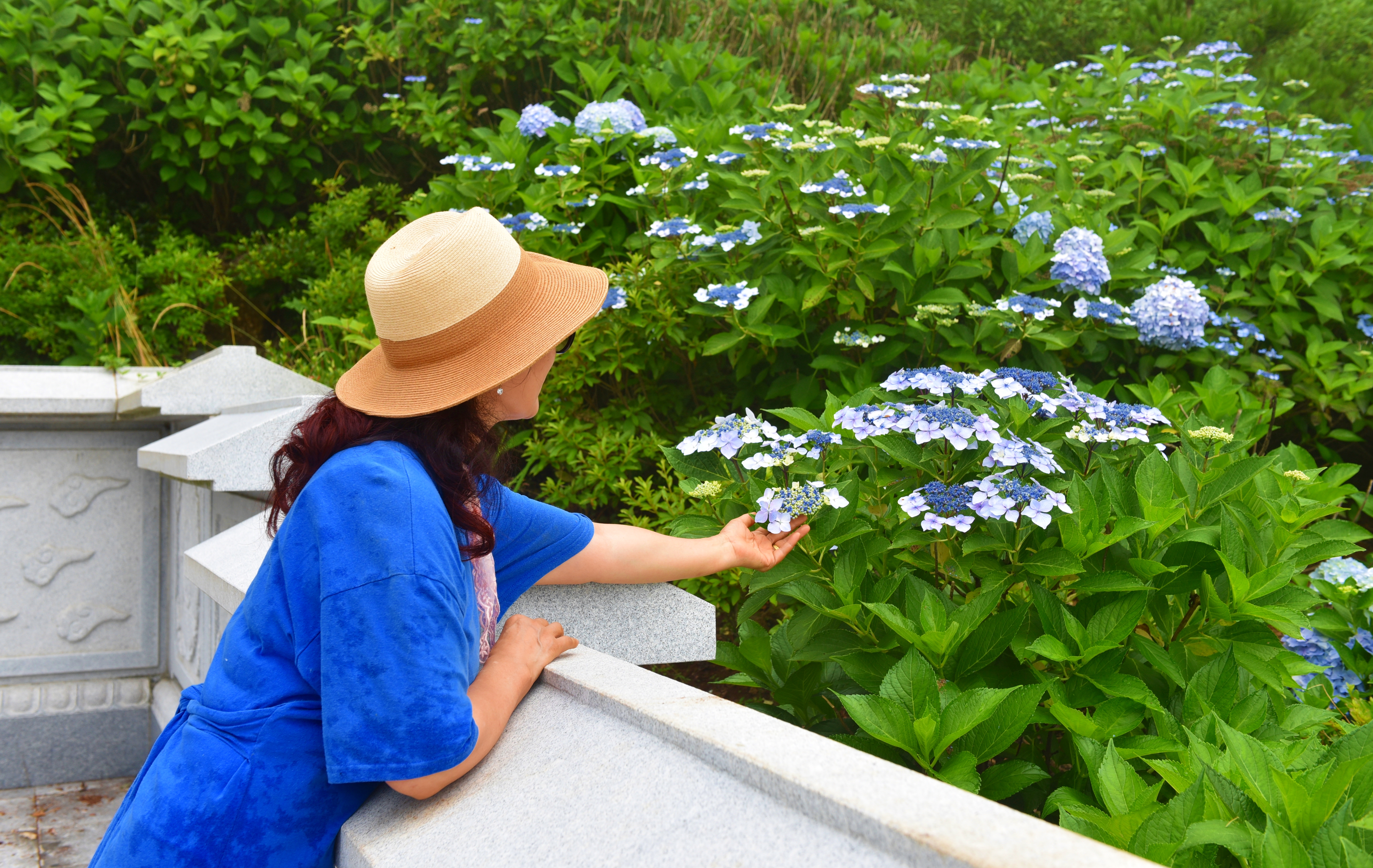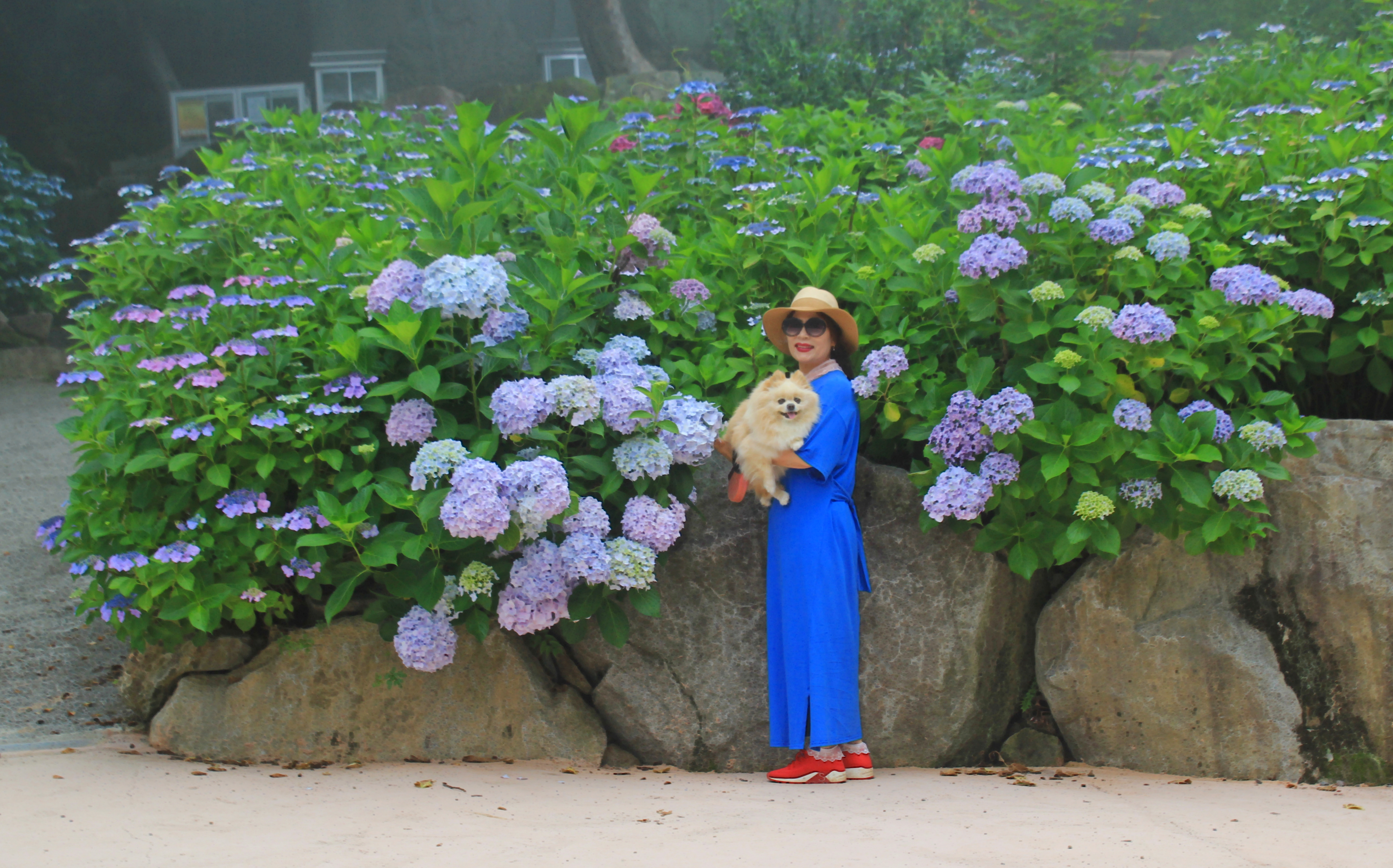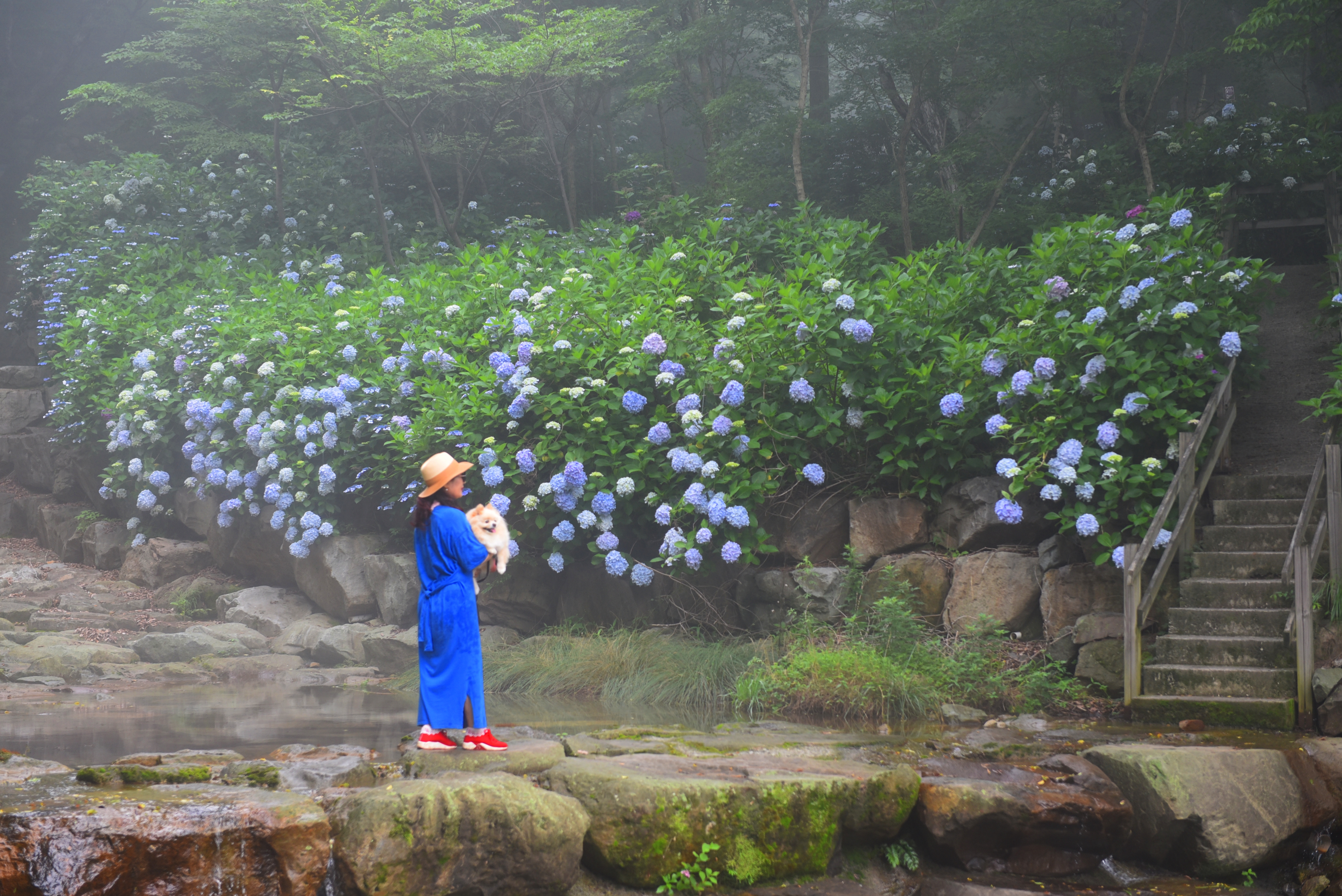 계단 쪽 풍성하게 핀 수국을 배경으로...