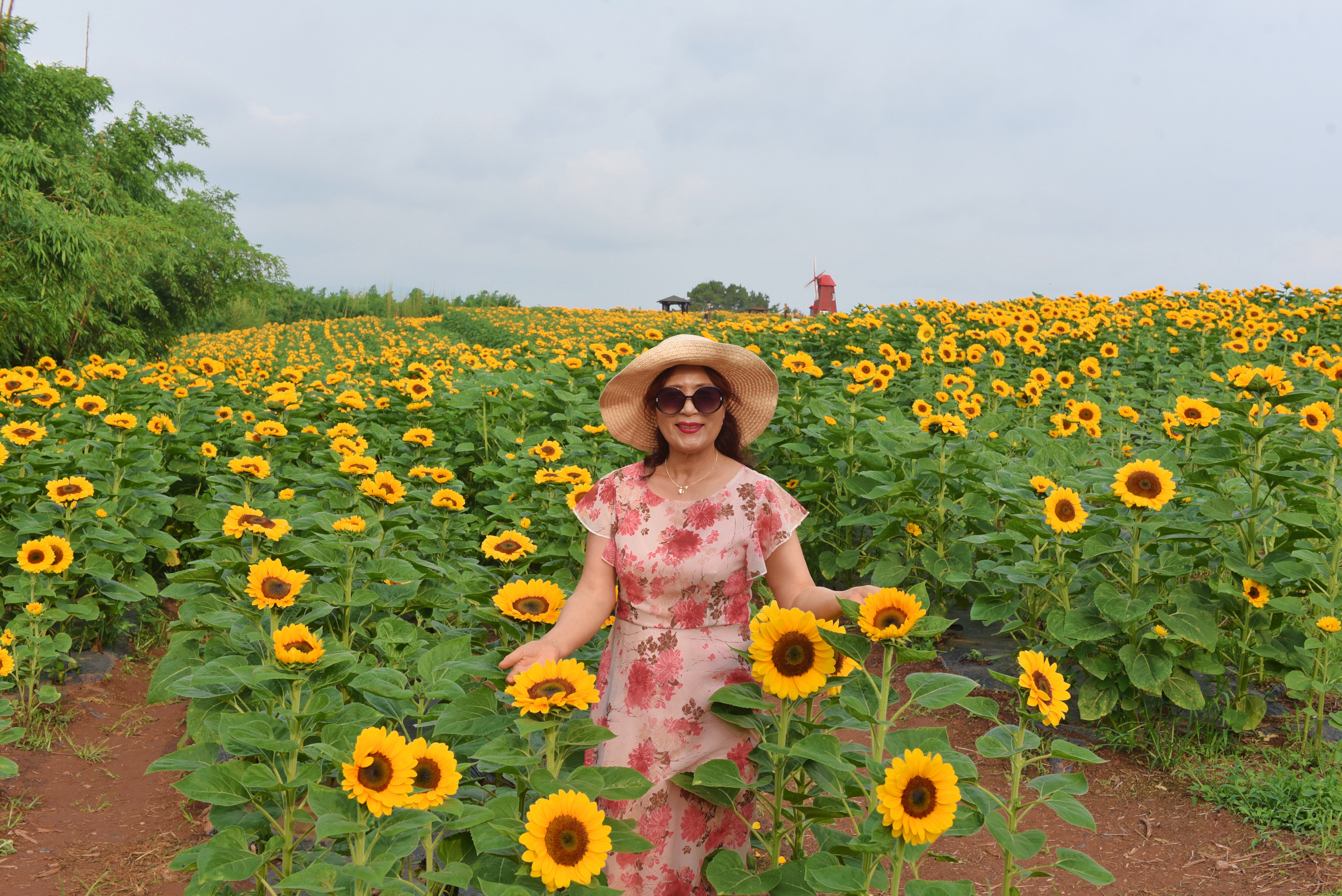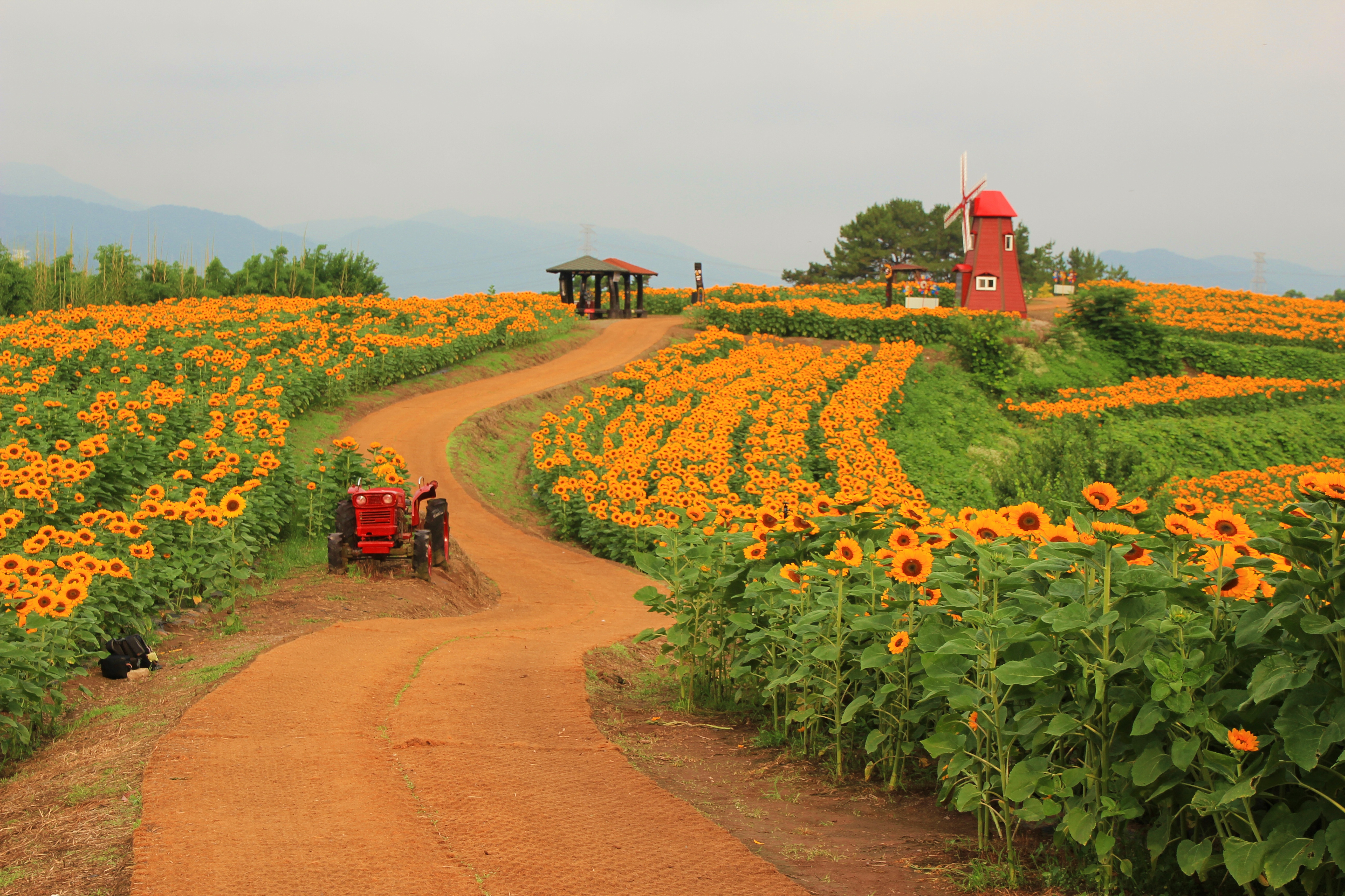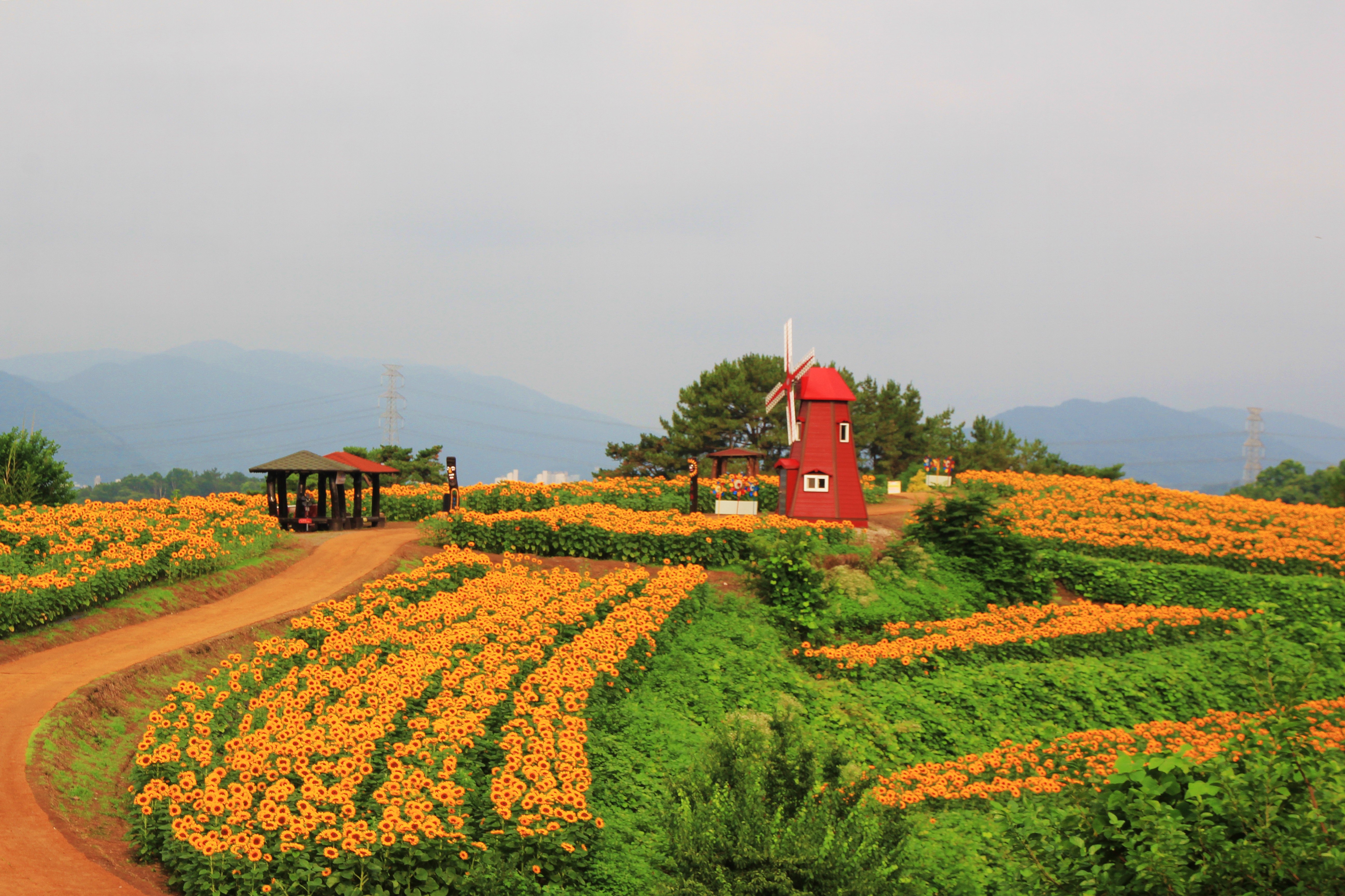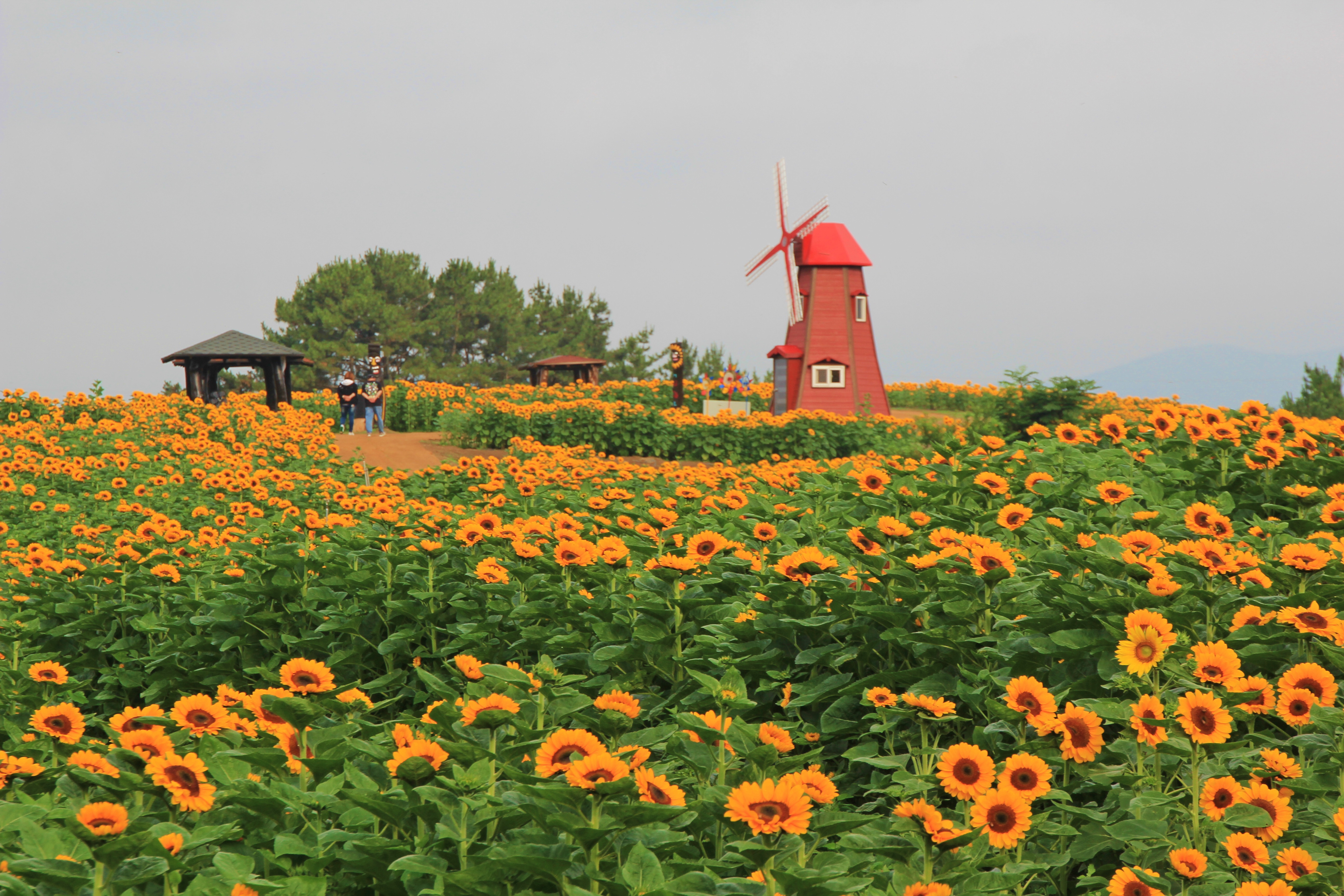정자 쉼터와 빨강 풍차를 배경으로 꽃밭에서...