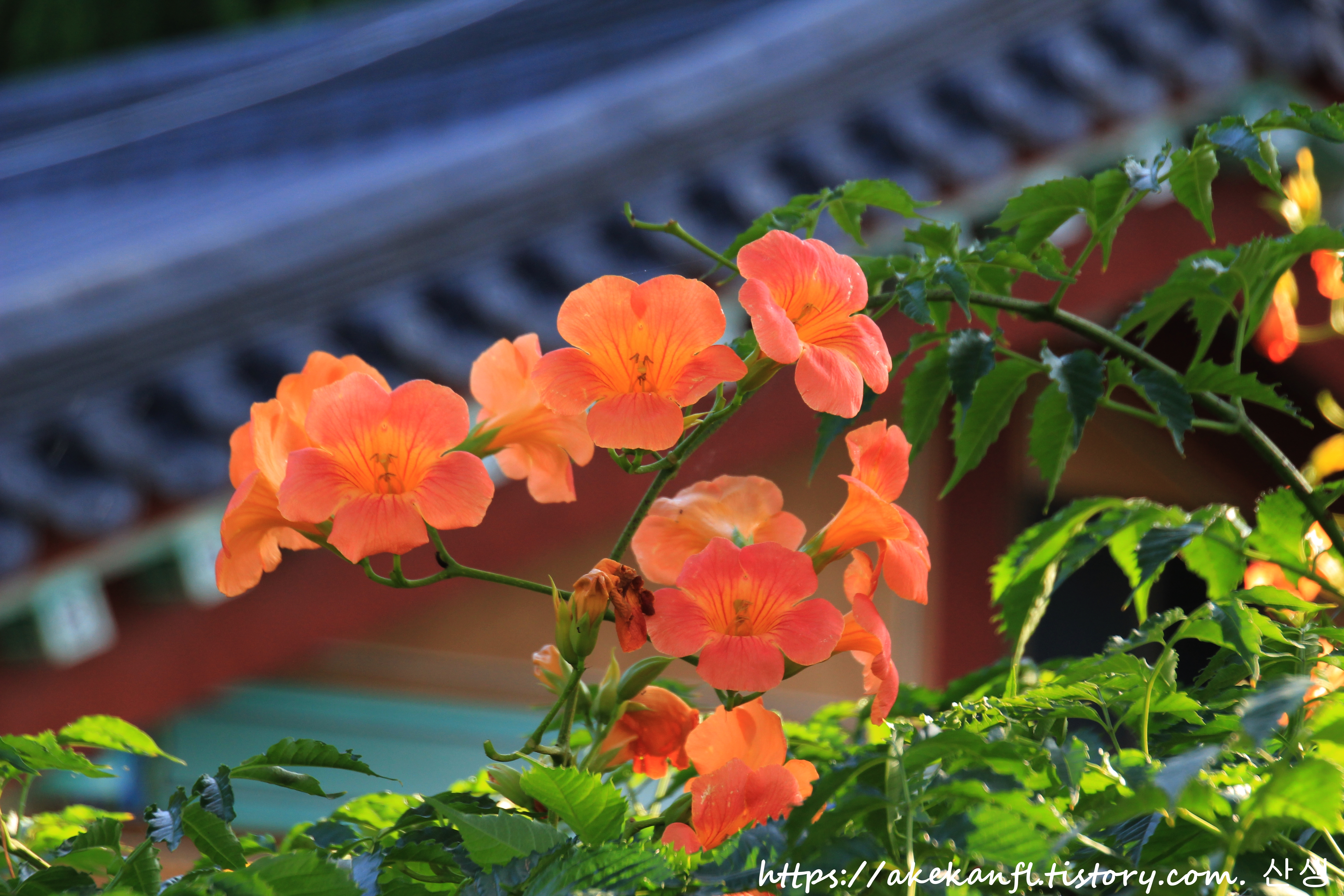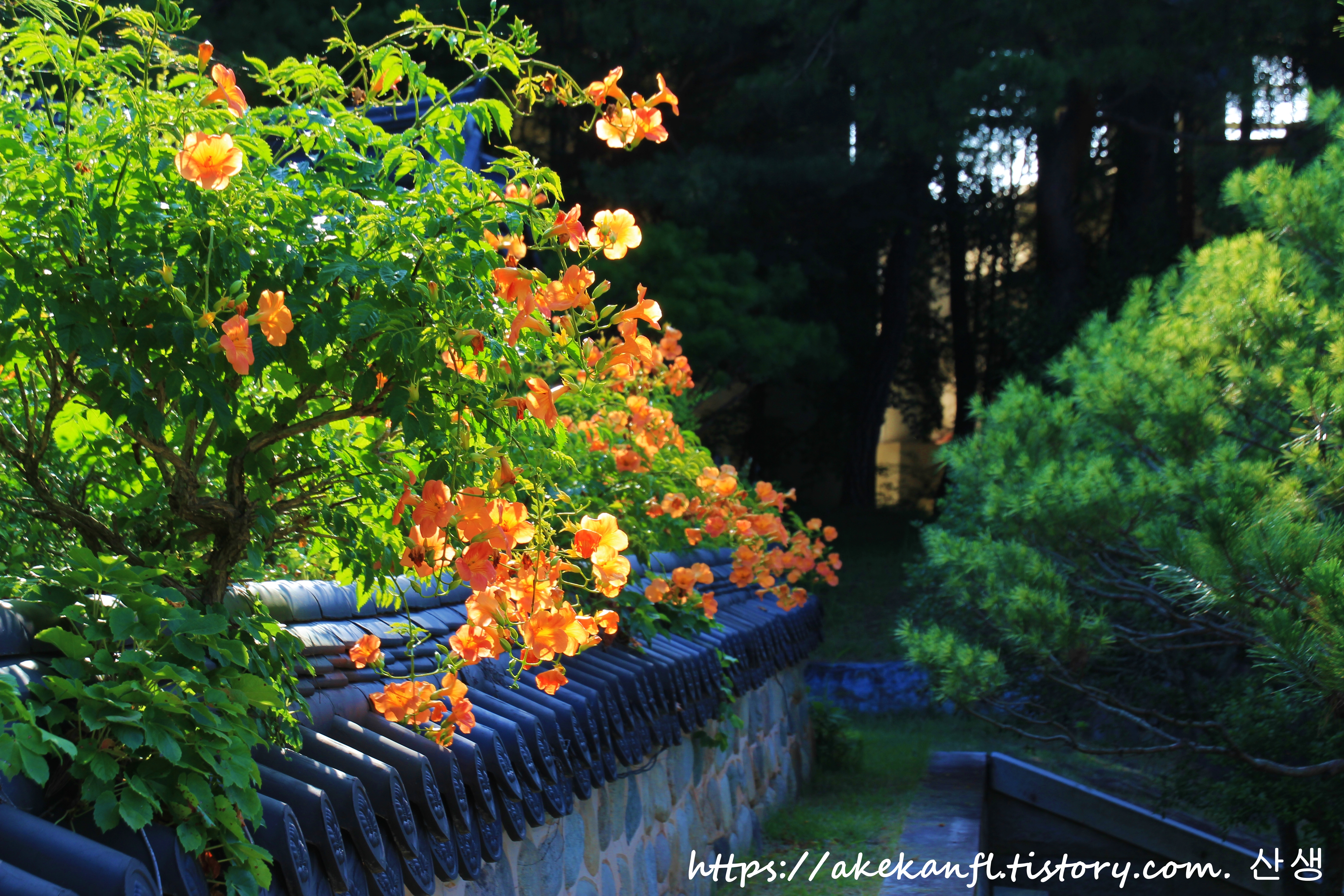 기와 담장과 어우러진 능소화를 당겨 담고...