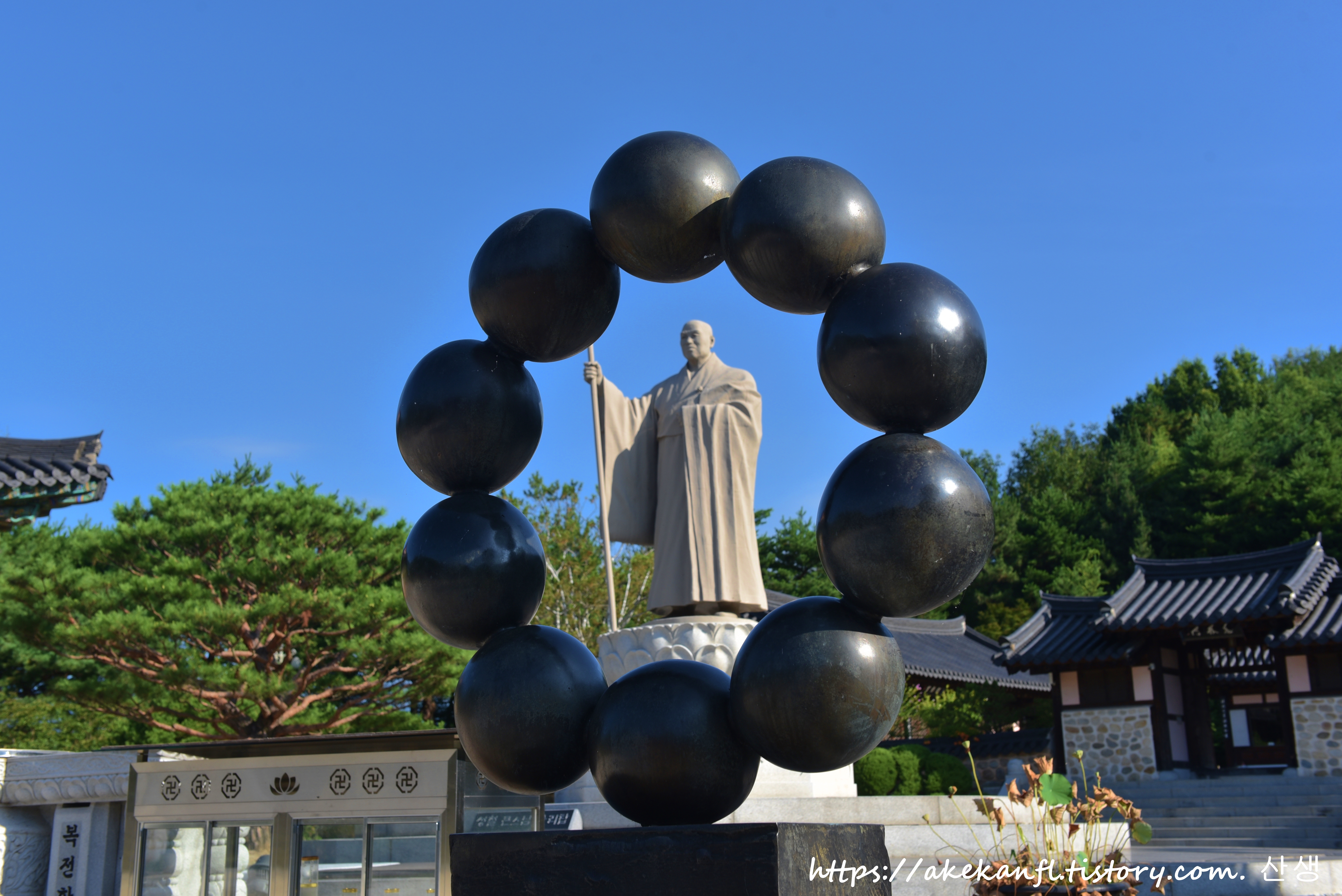 동상 앞 염주 속에 스님 동상을 넣어 담고...ㅋ