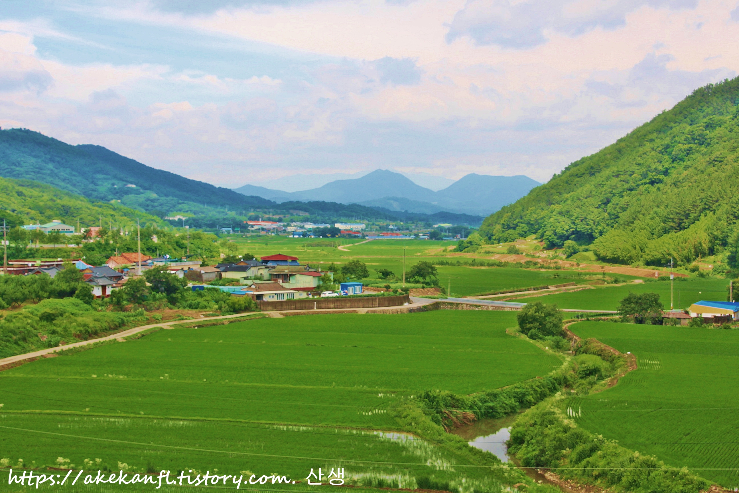 그 뒤로 멀리 진주의 명산 월아산이 조망된다