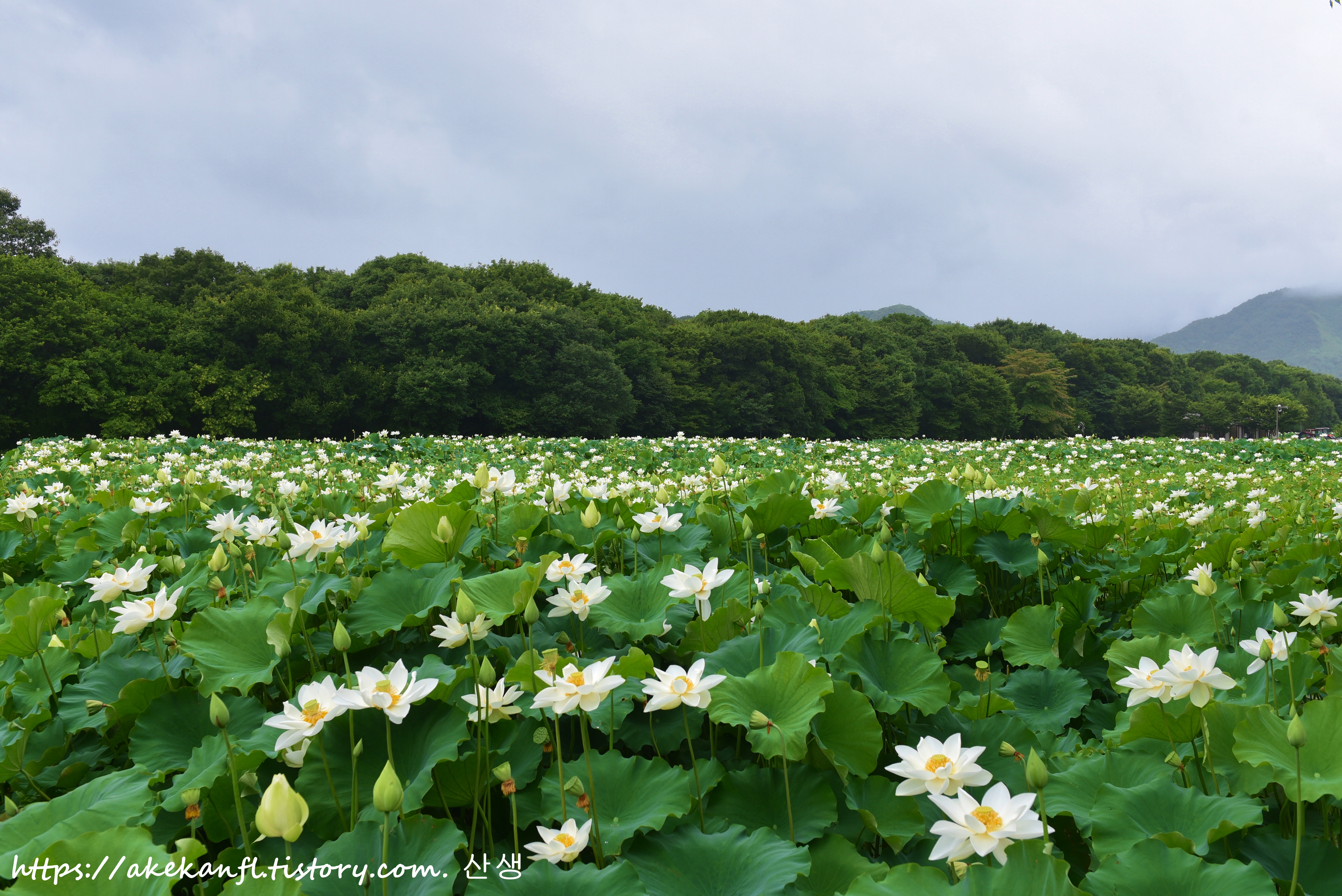 한창 절정인 백련 꽃밭을 담고...