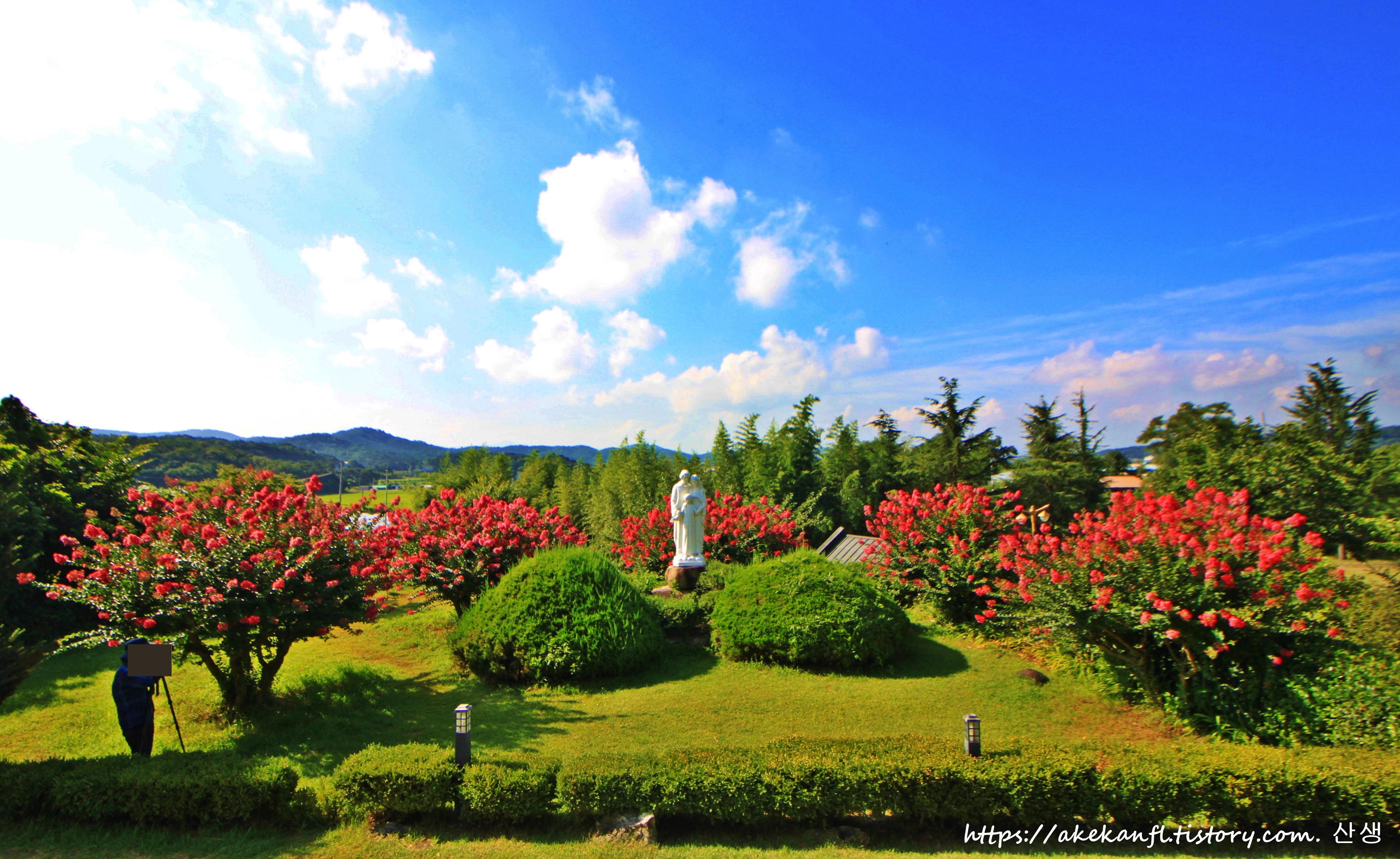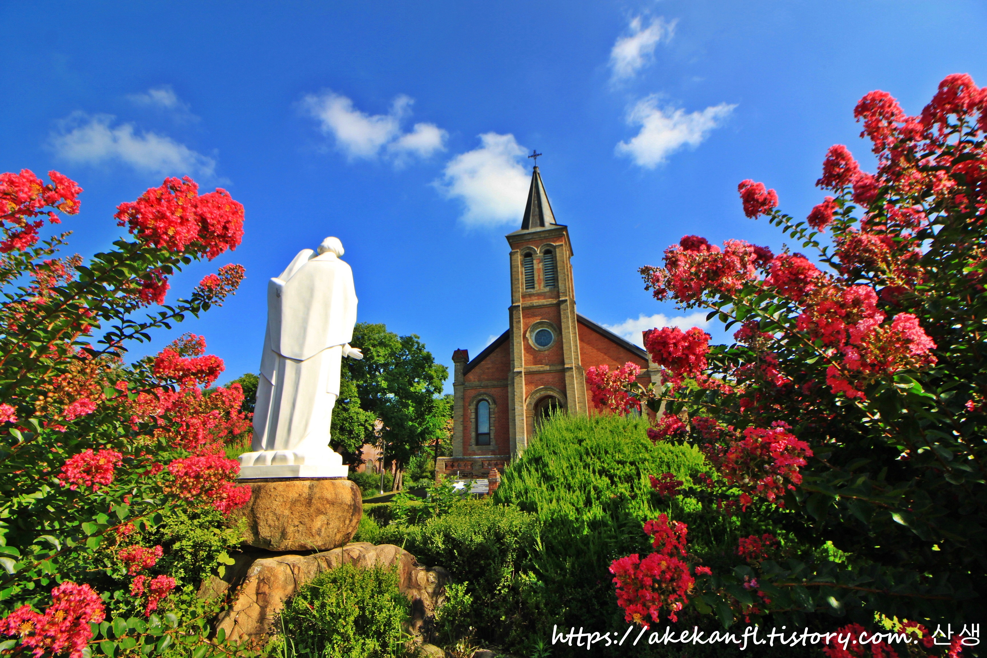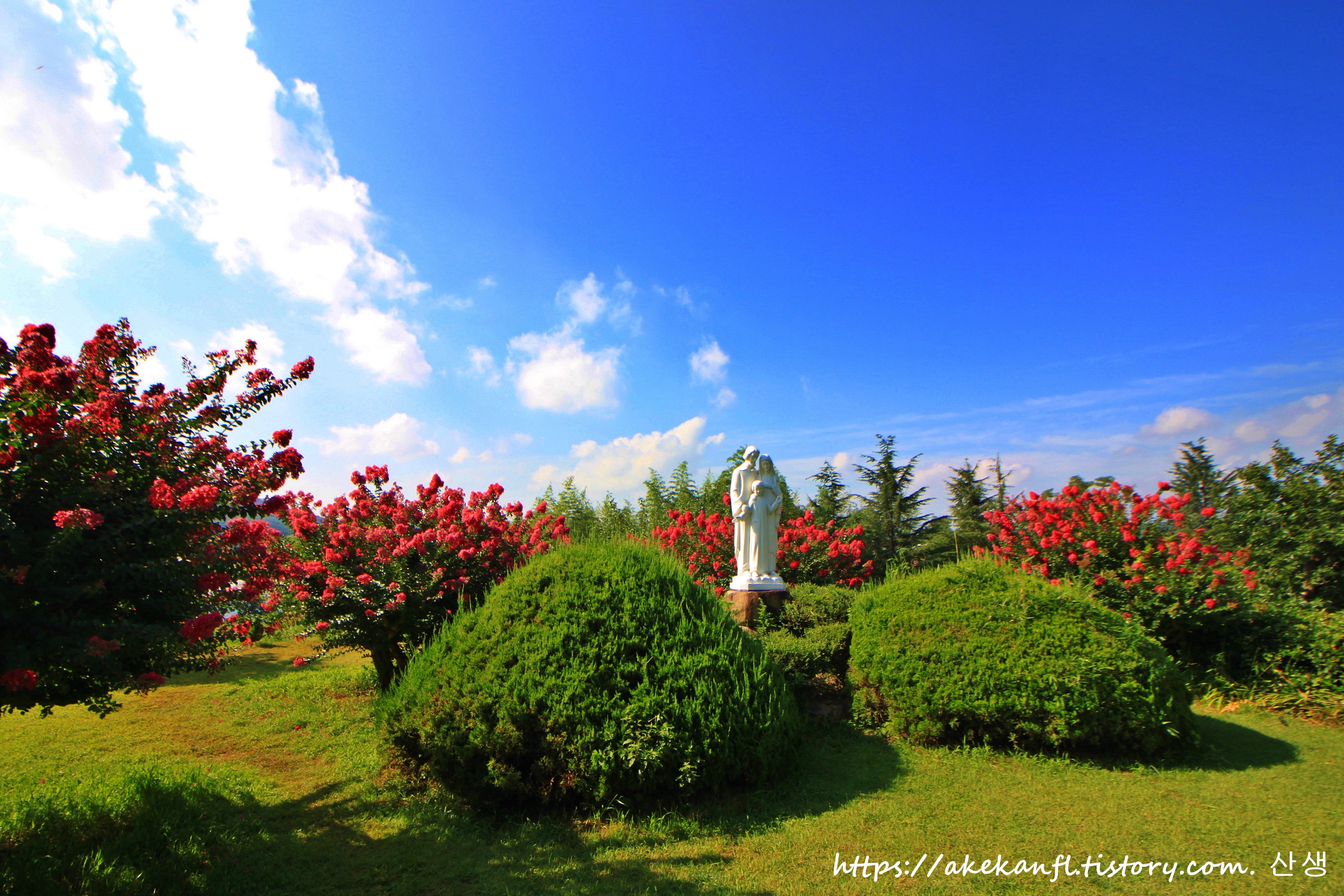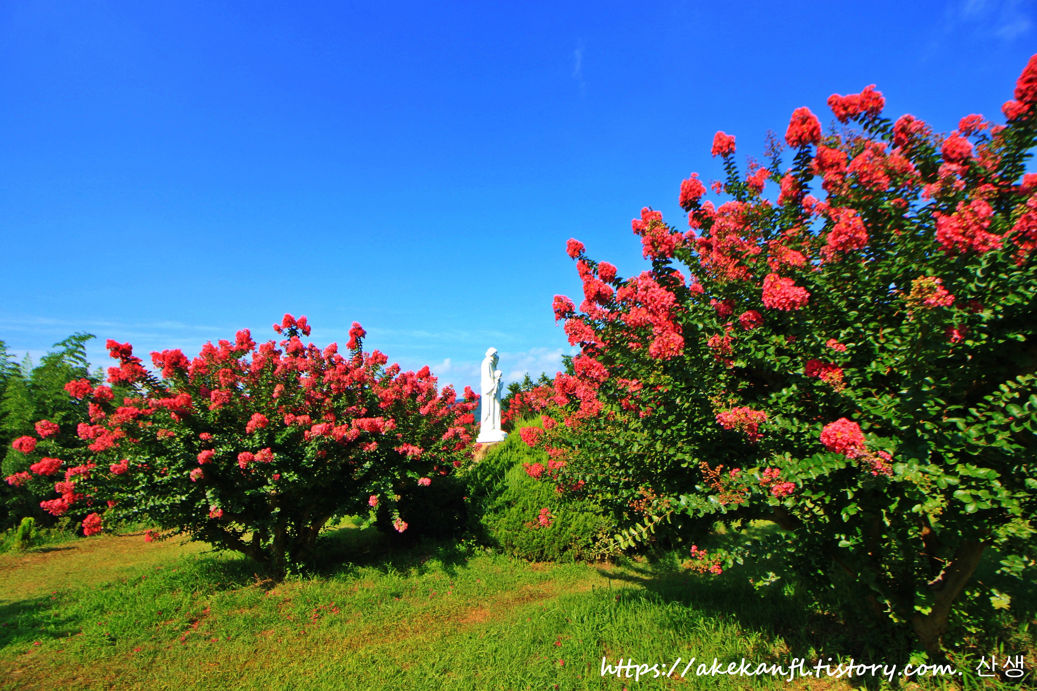 입구에서 바라본 성당 쪽 배롱나무 풍광