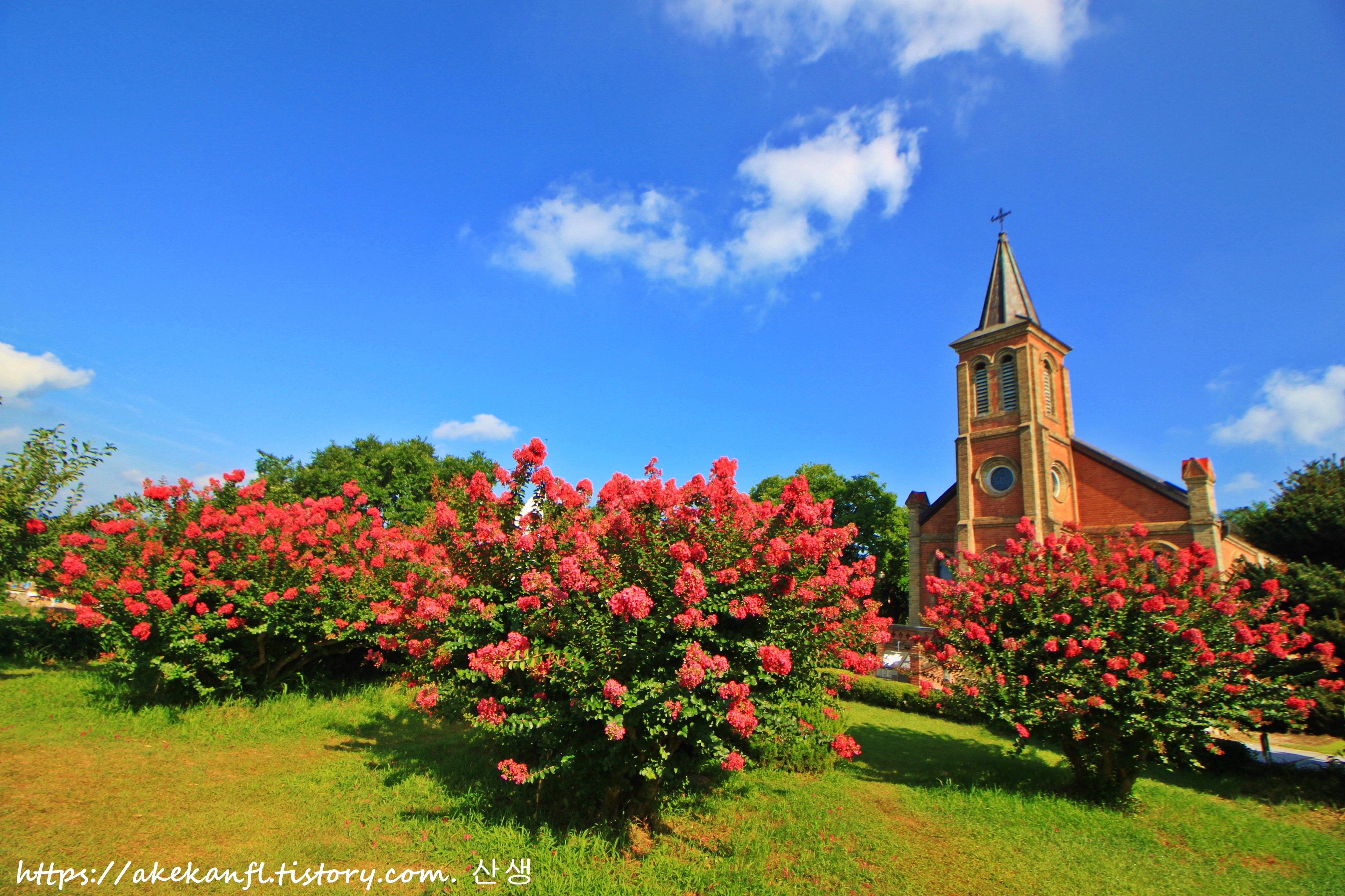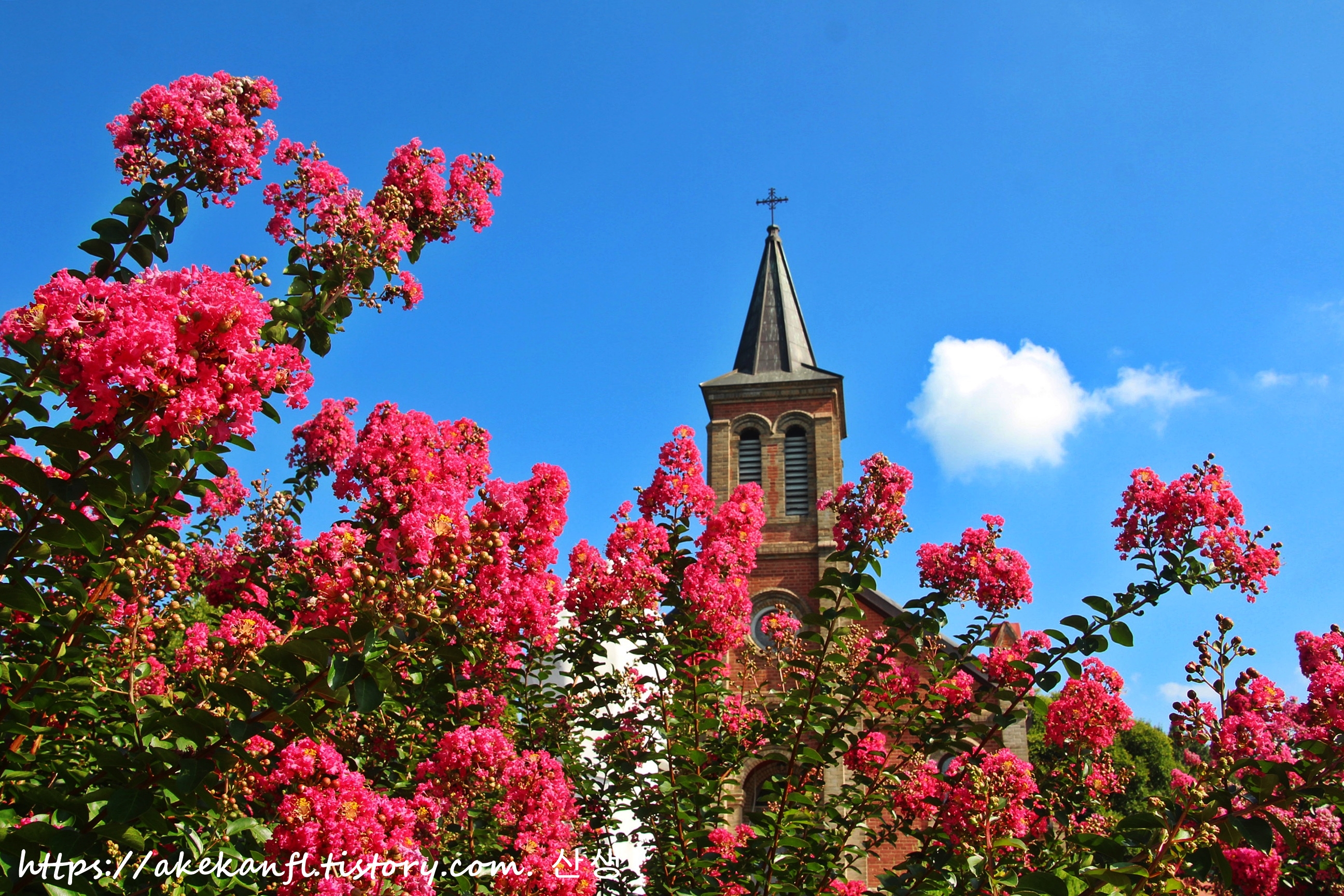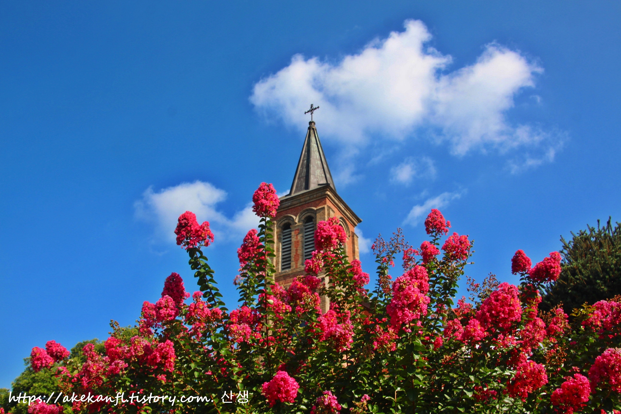 배롱나무와 어우러진 성당 쪽을 당겨 담고....