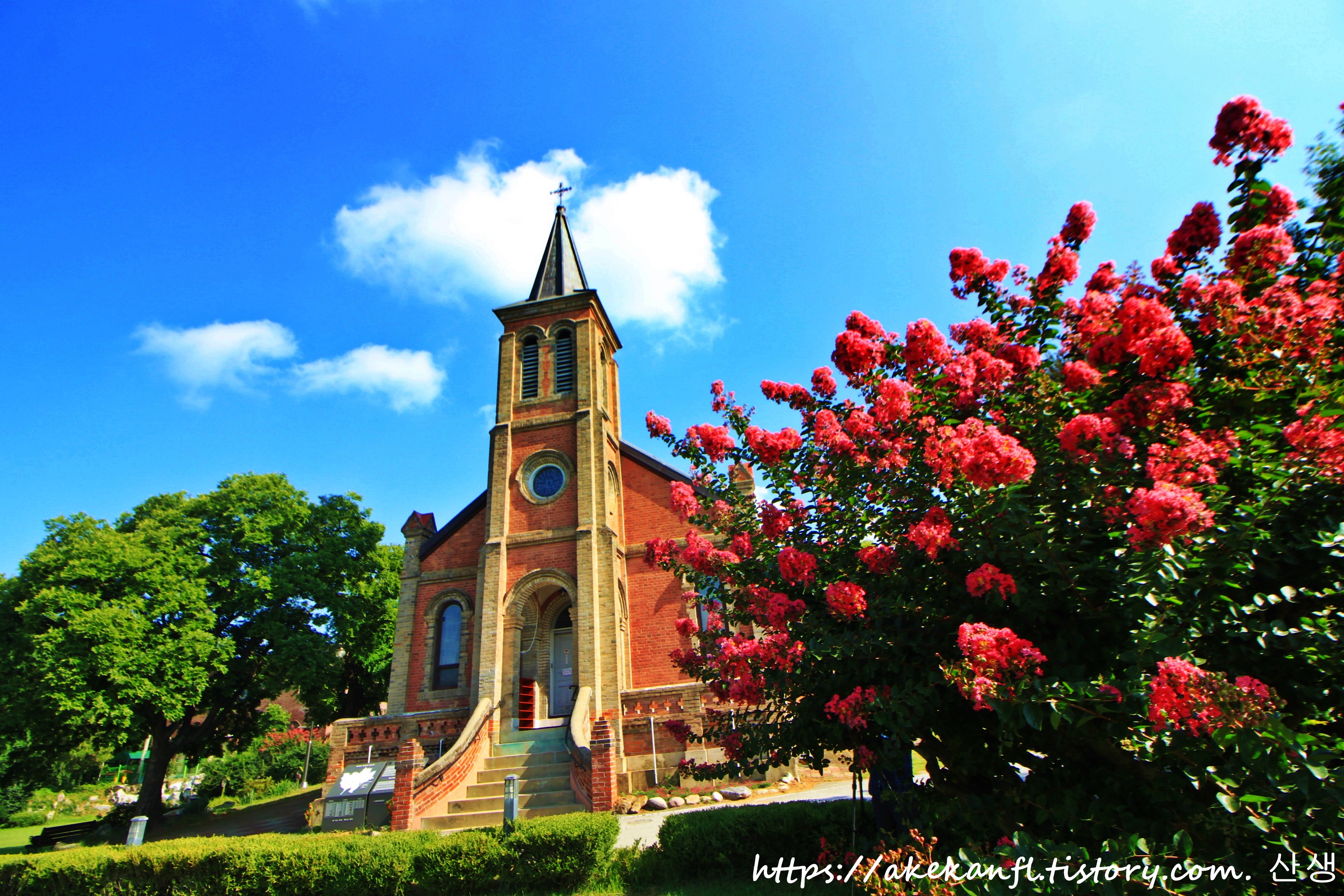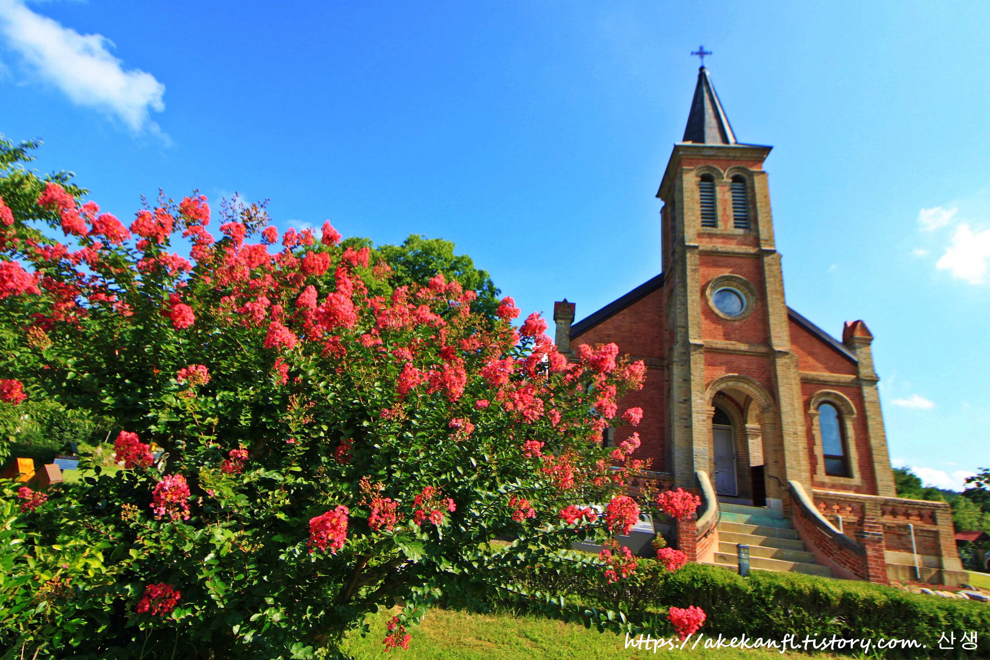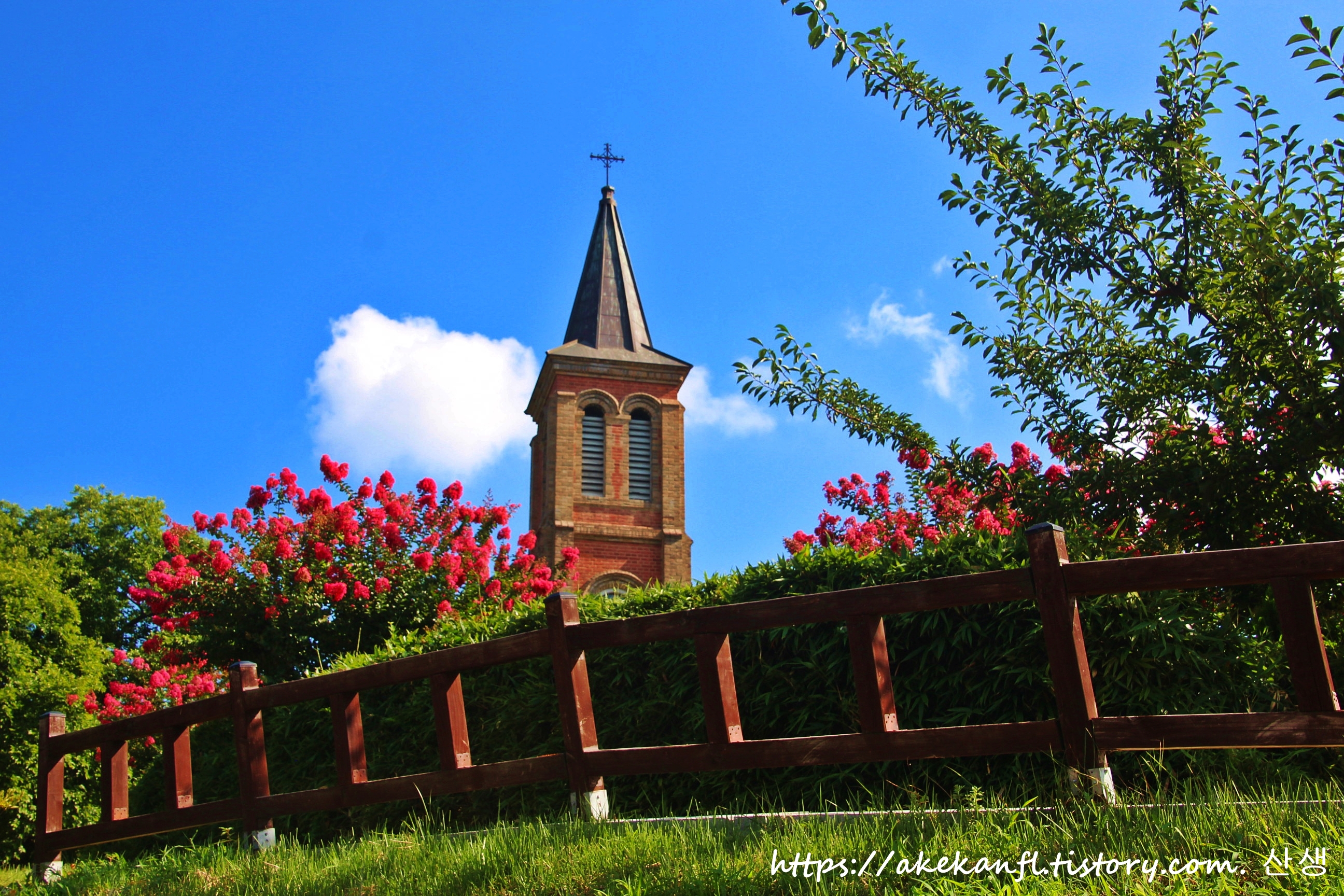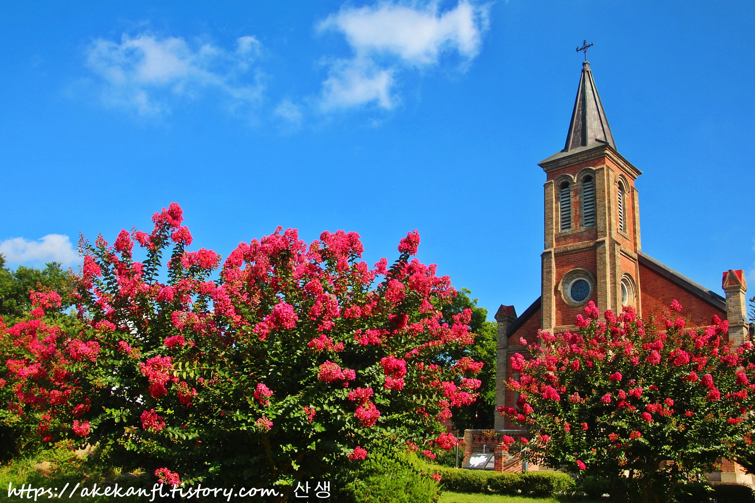 배롱나무와 어우러진 성당 쪽을 당겨 담고....