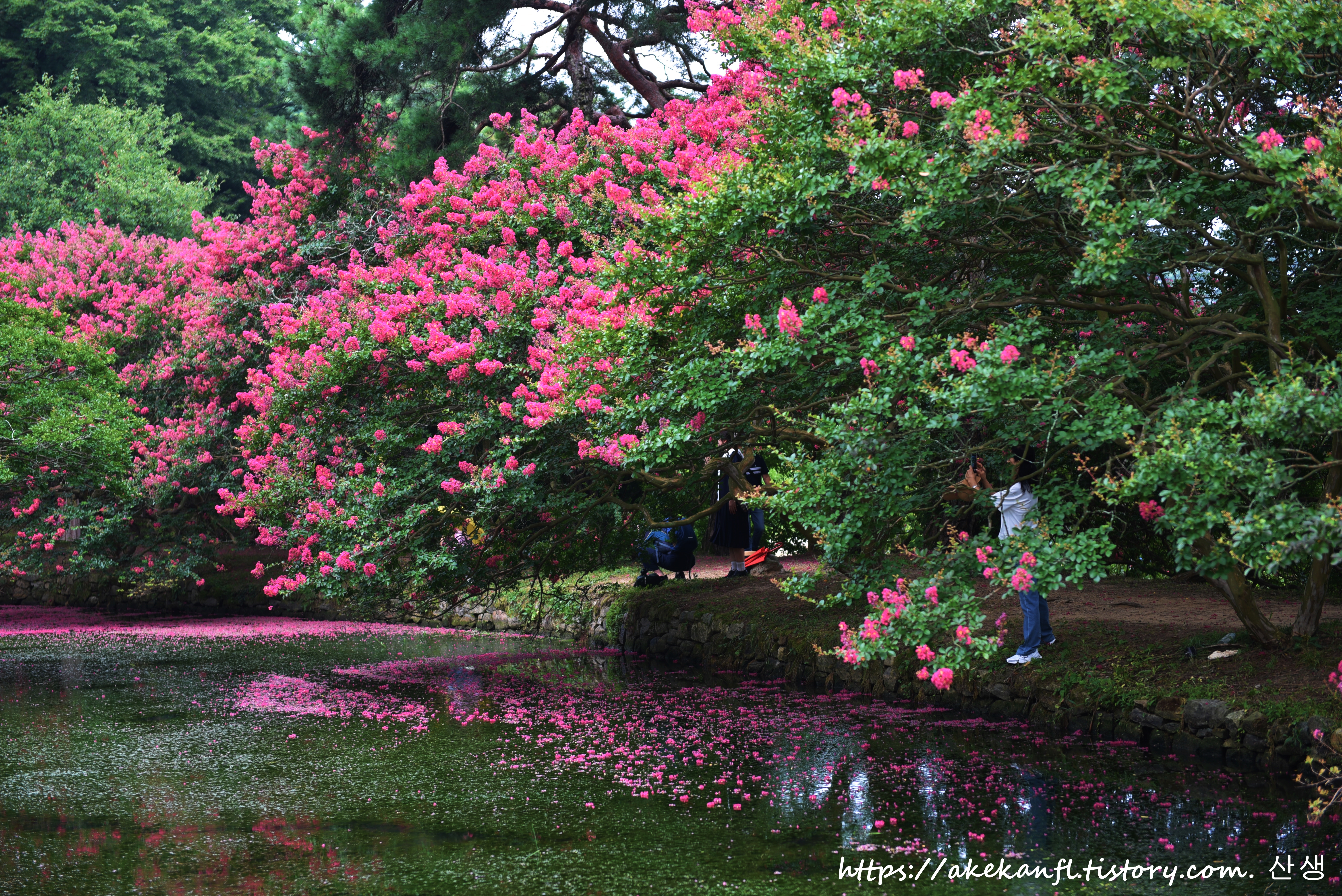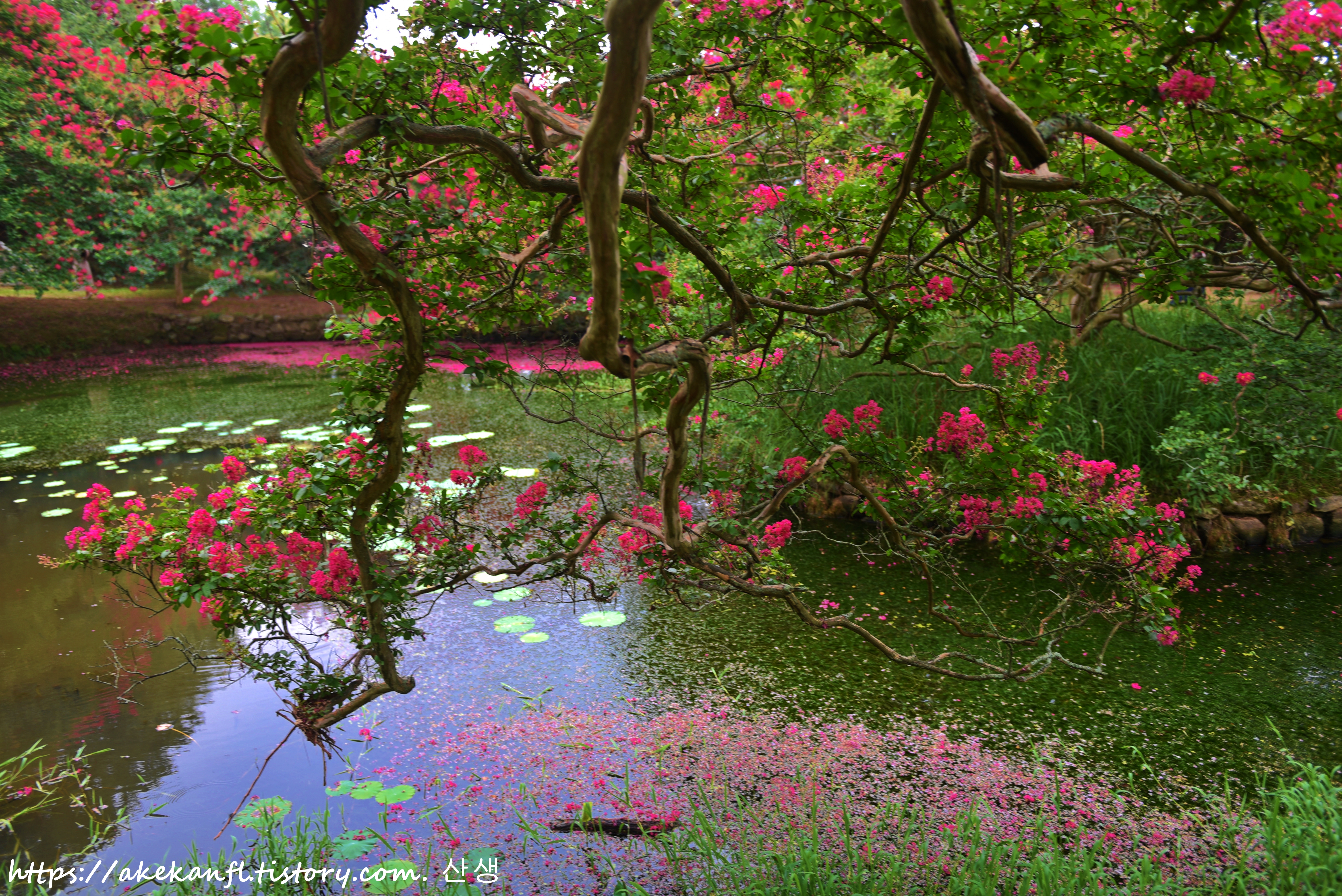 배롱나무와 붉게 물든 연못을 당겨 담고...