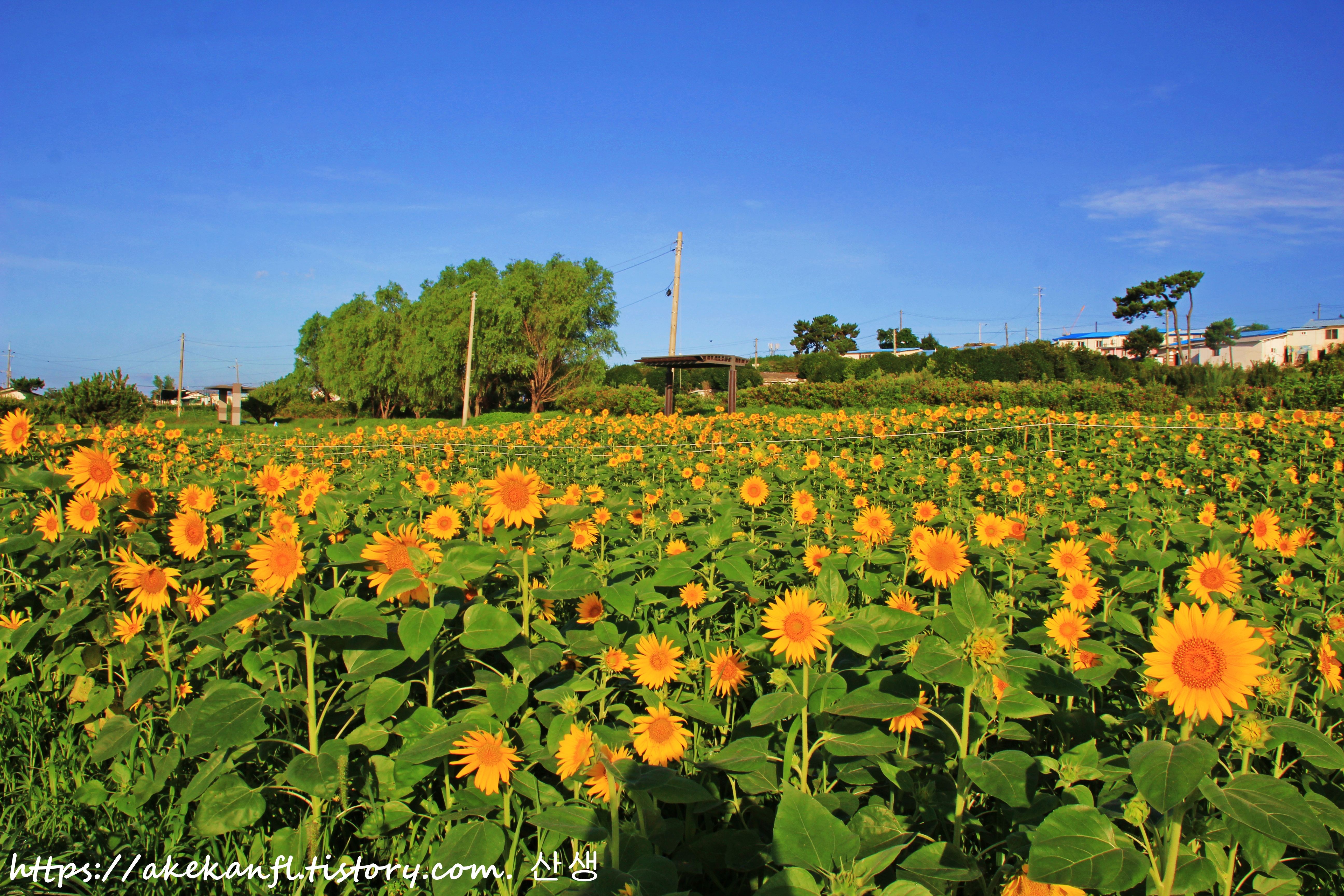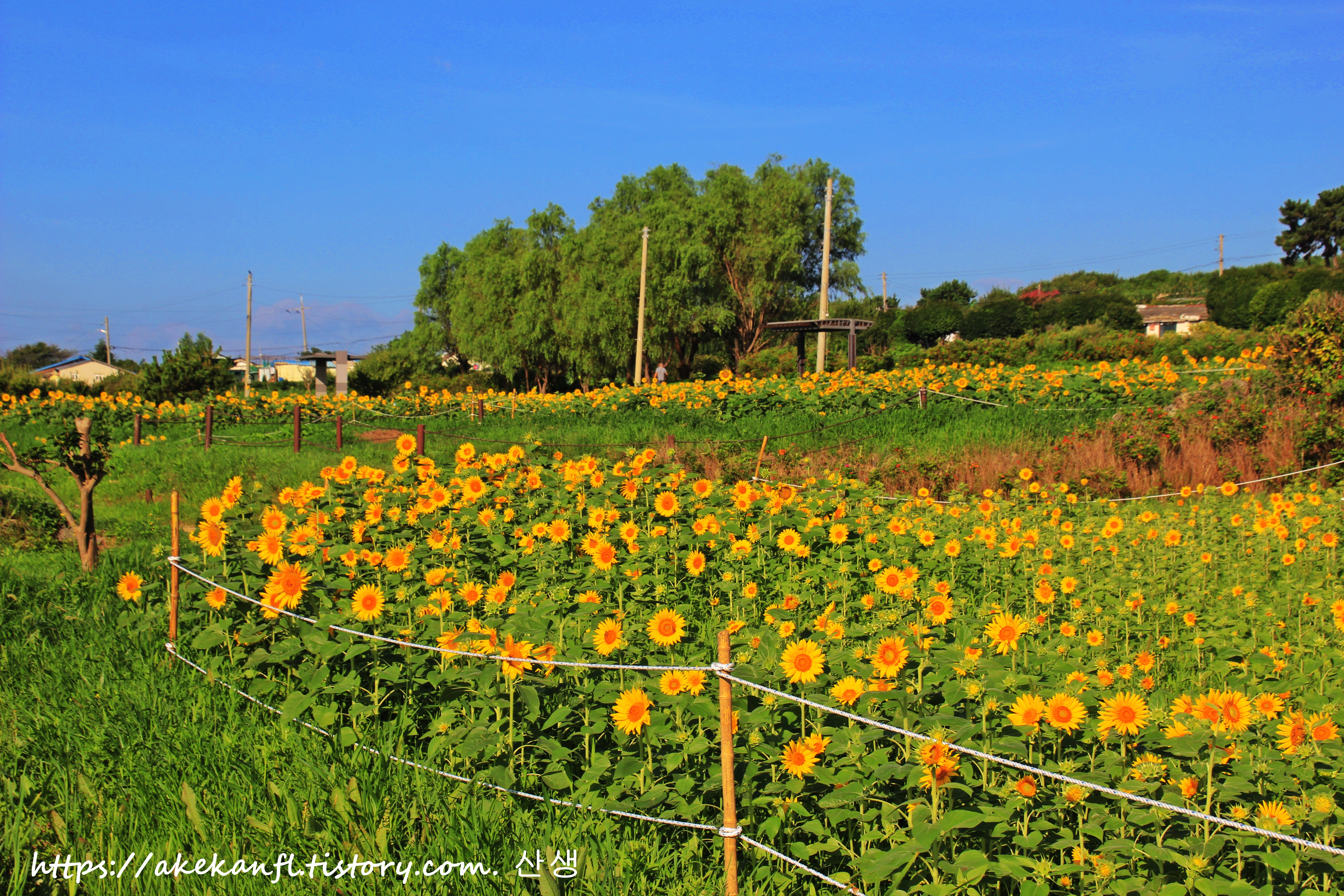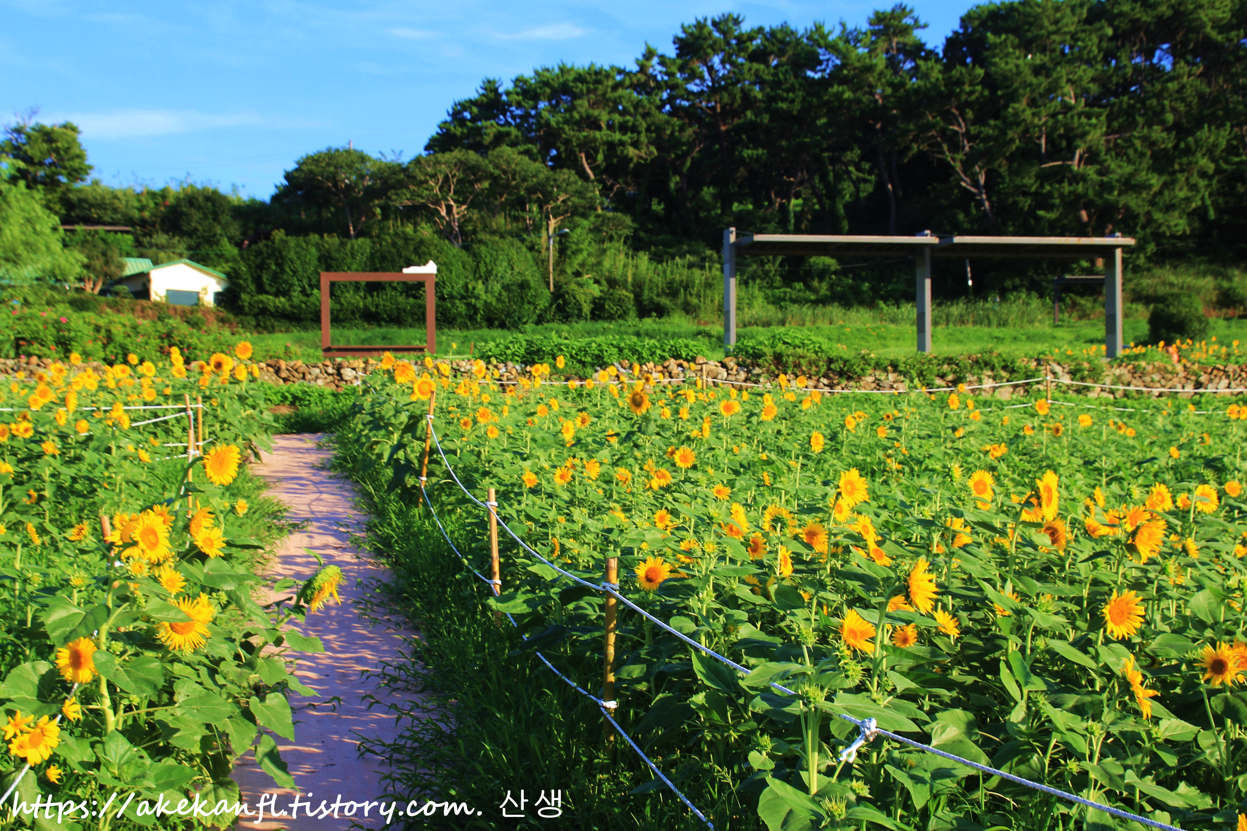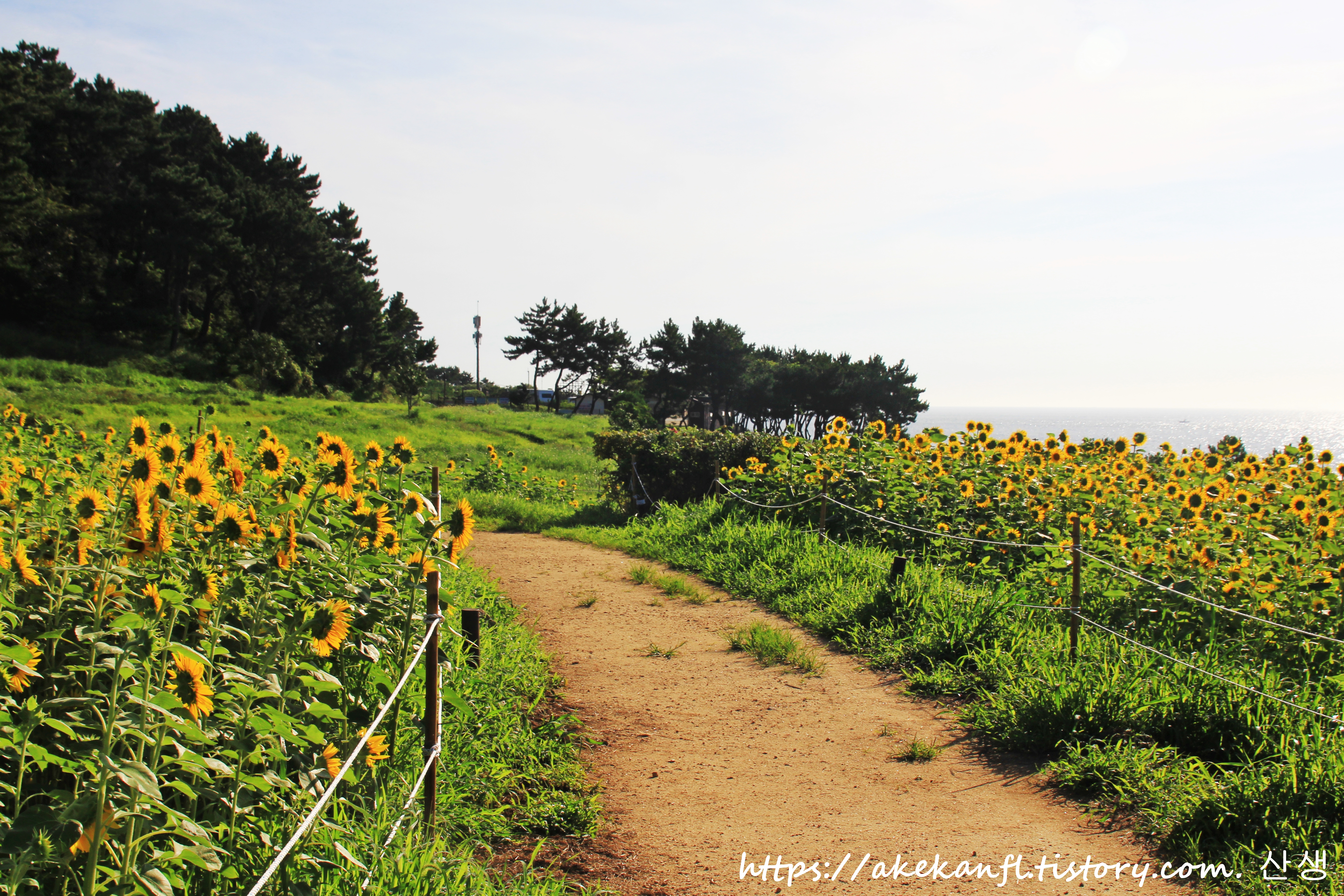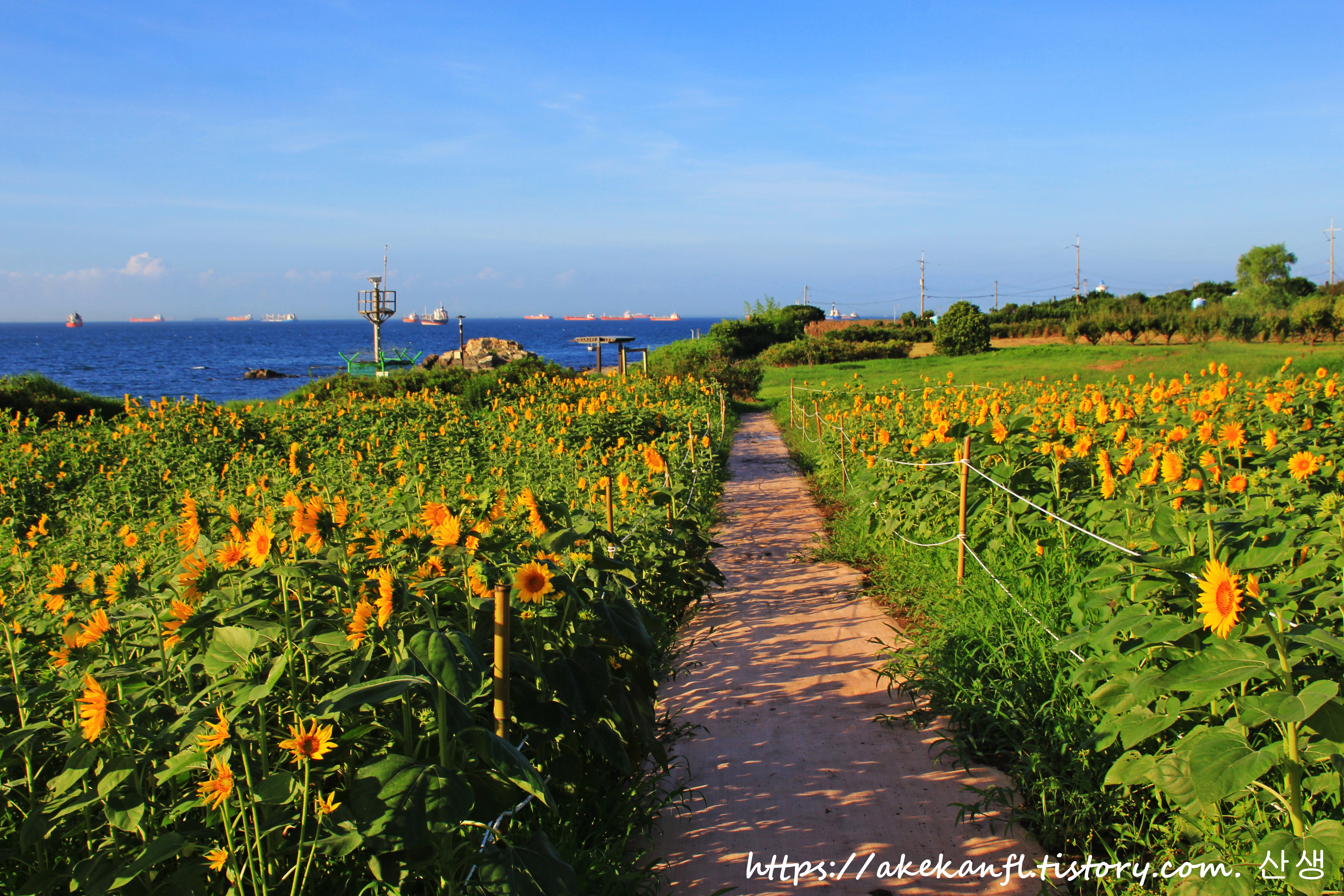 해바라기 꽃밭 끝쪽의 산책로 풍광