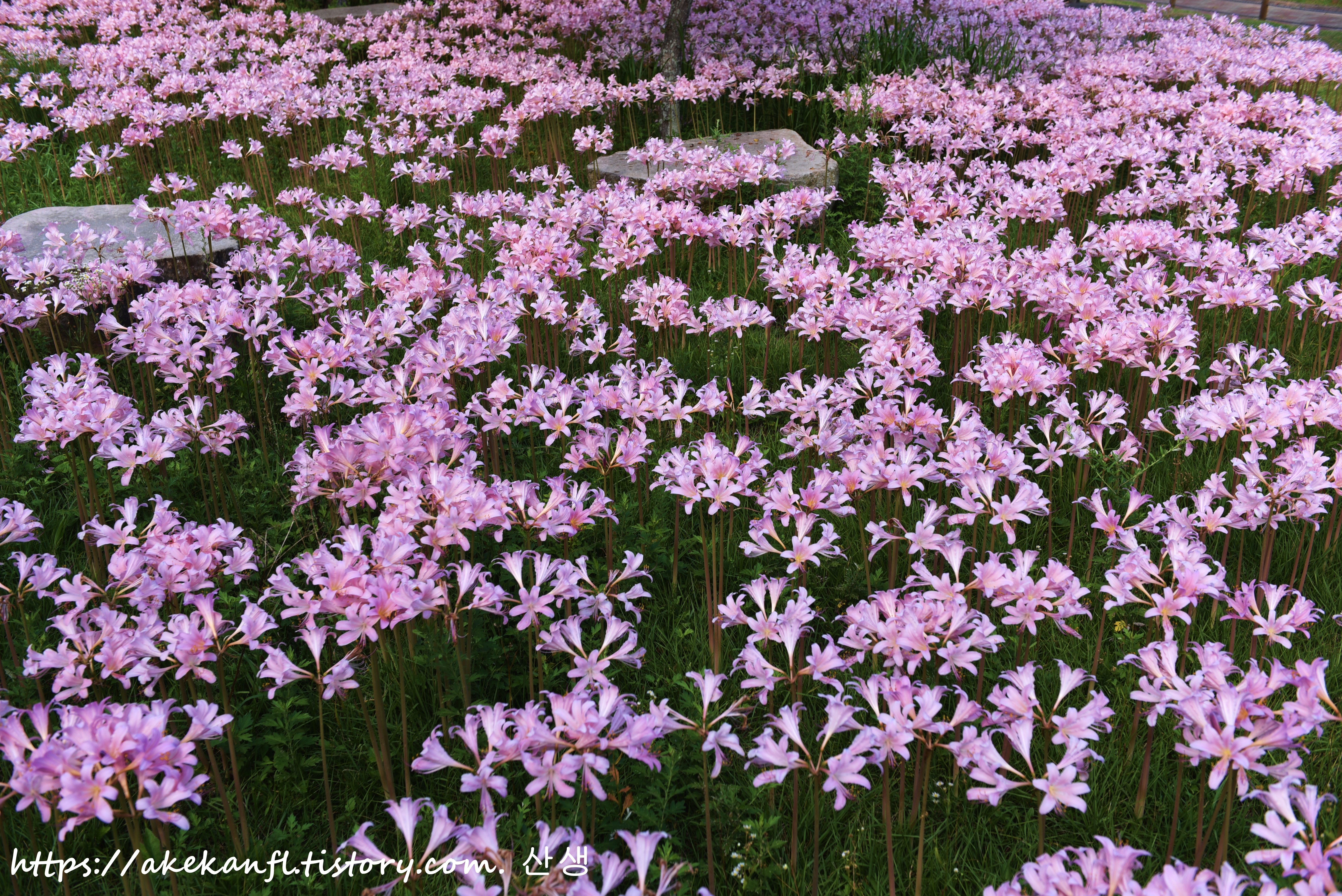 진분홍 상사화 꽃밭을 당겨 담고...