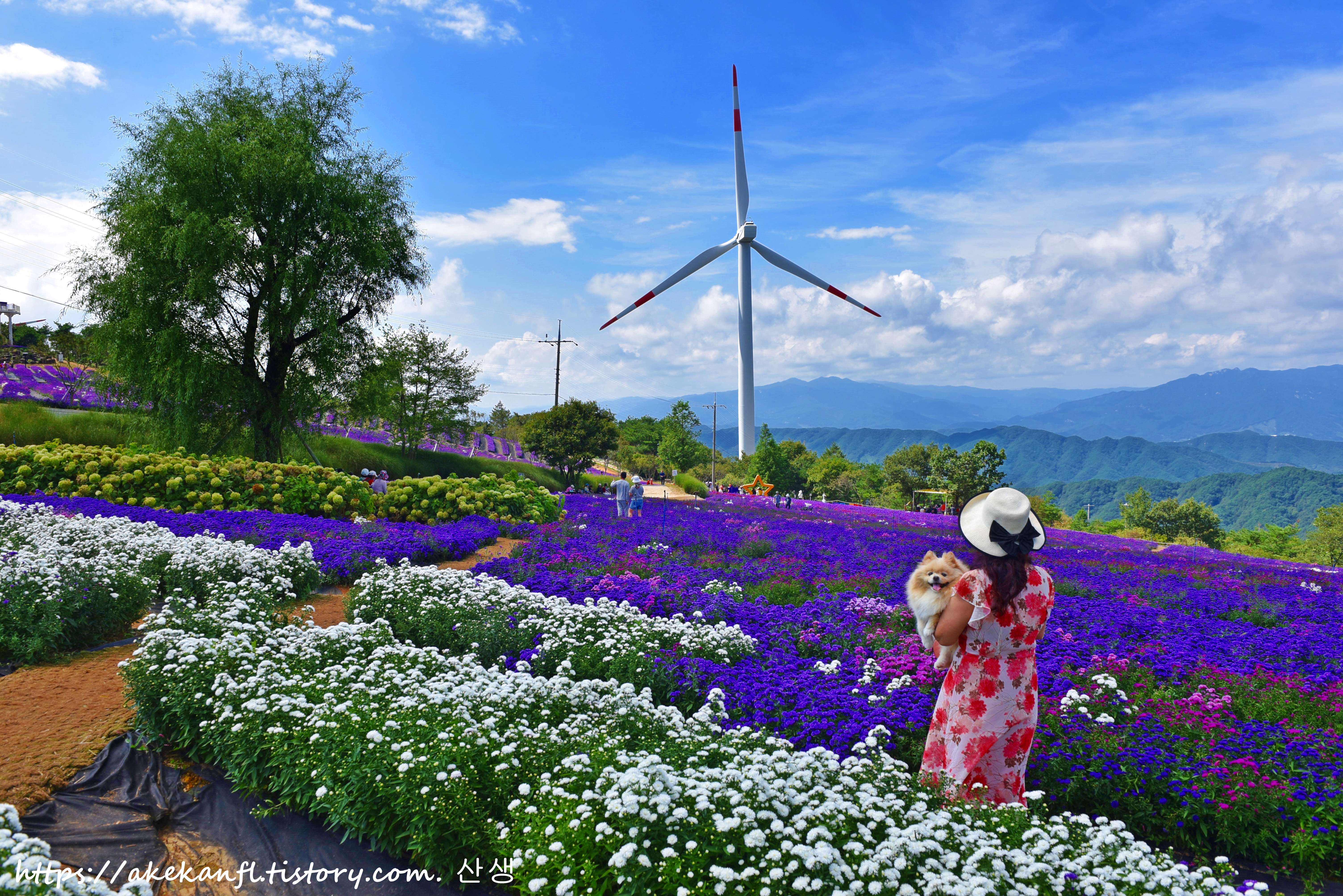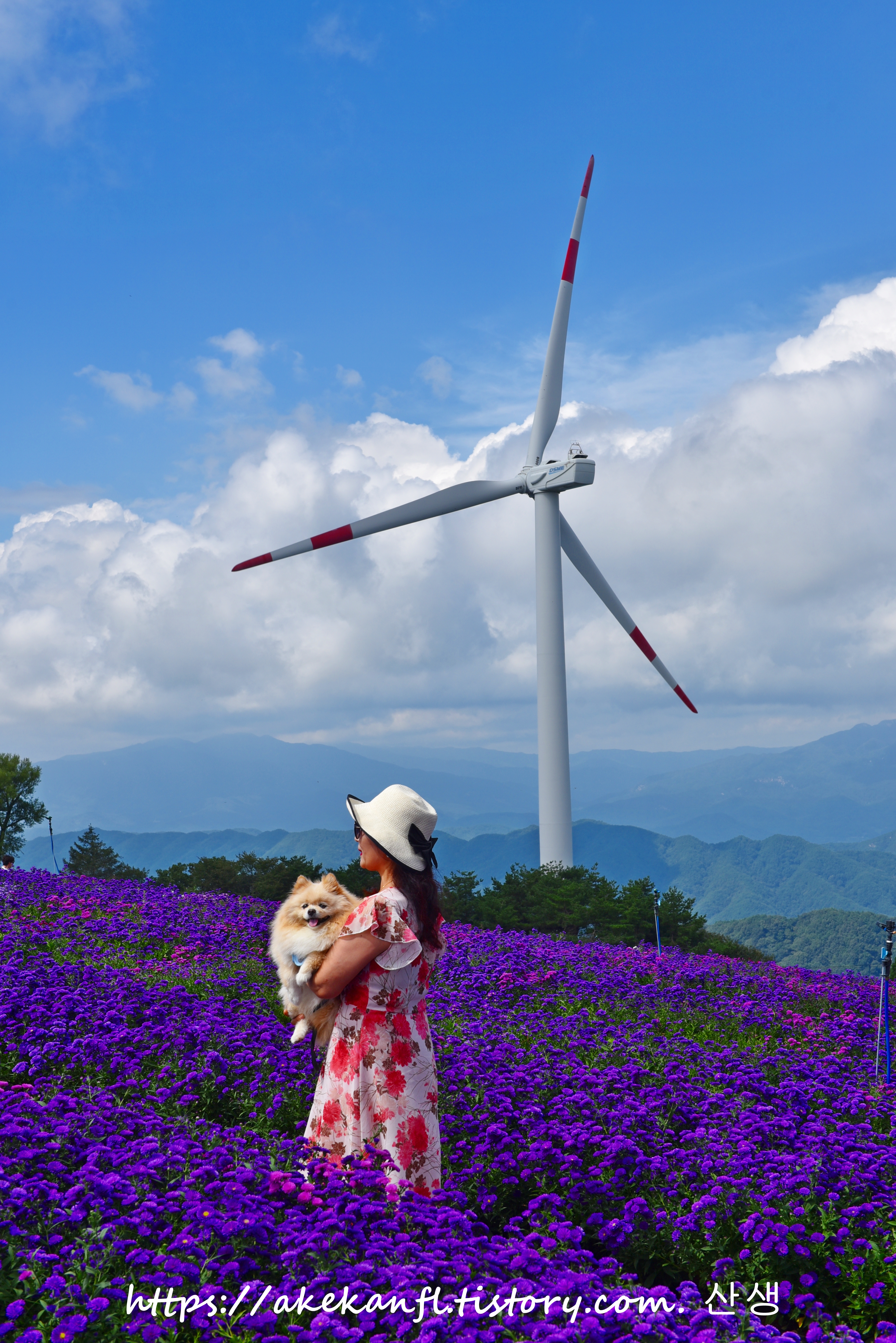 풍차와 어우러진 꽃밭을 당겨 담고...