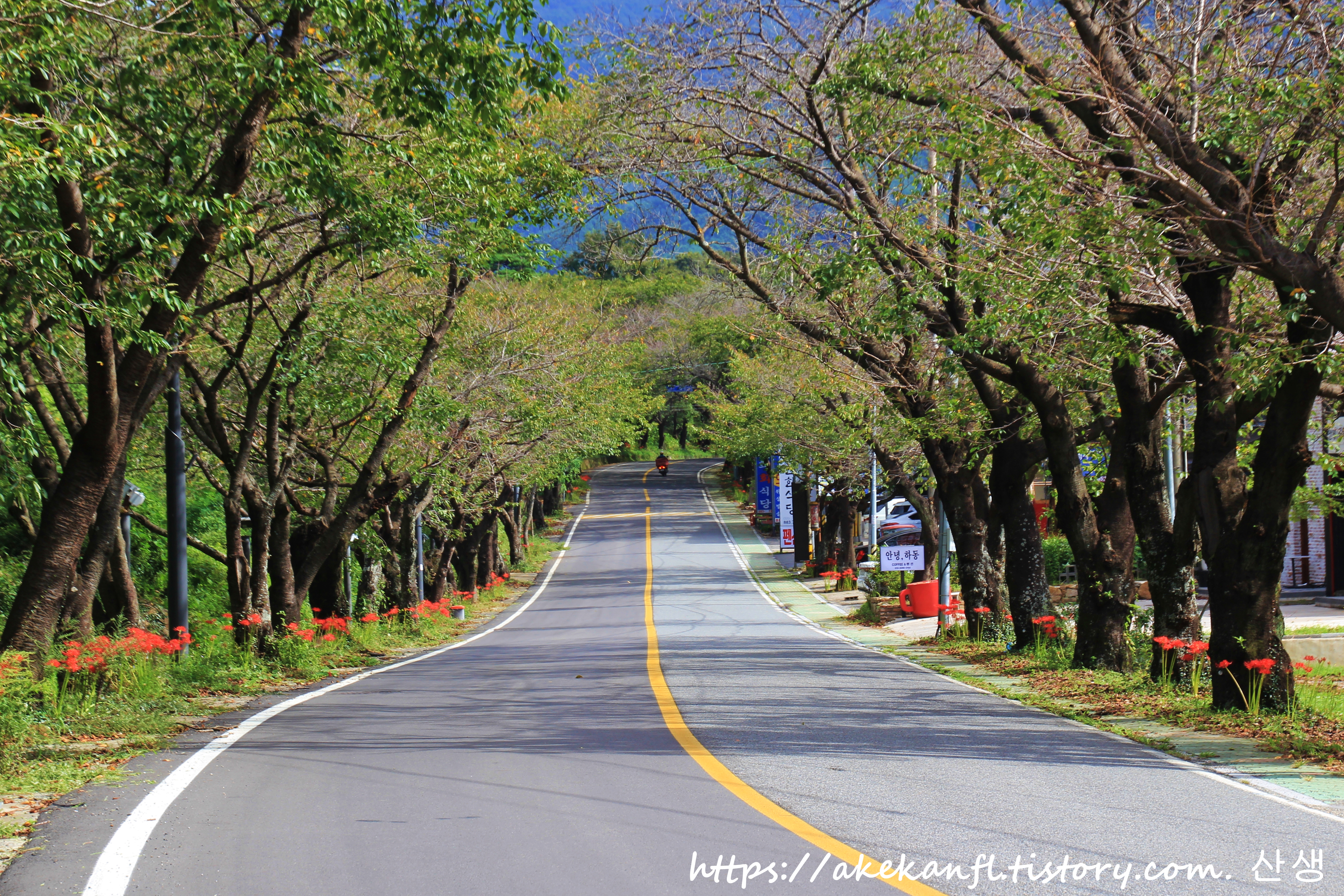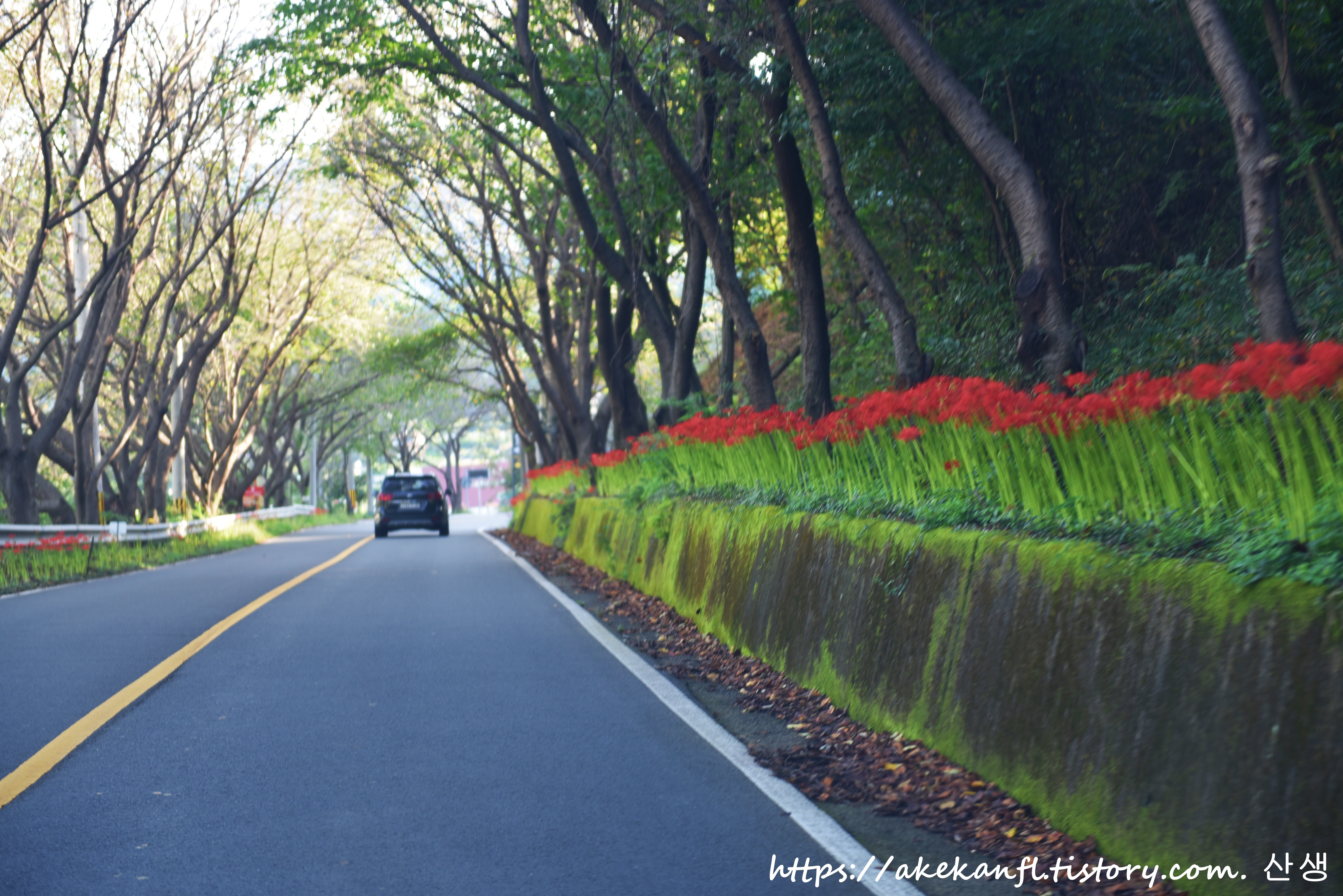 도로 양쪽으로 꽃무릇이 핀