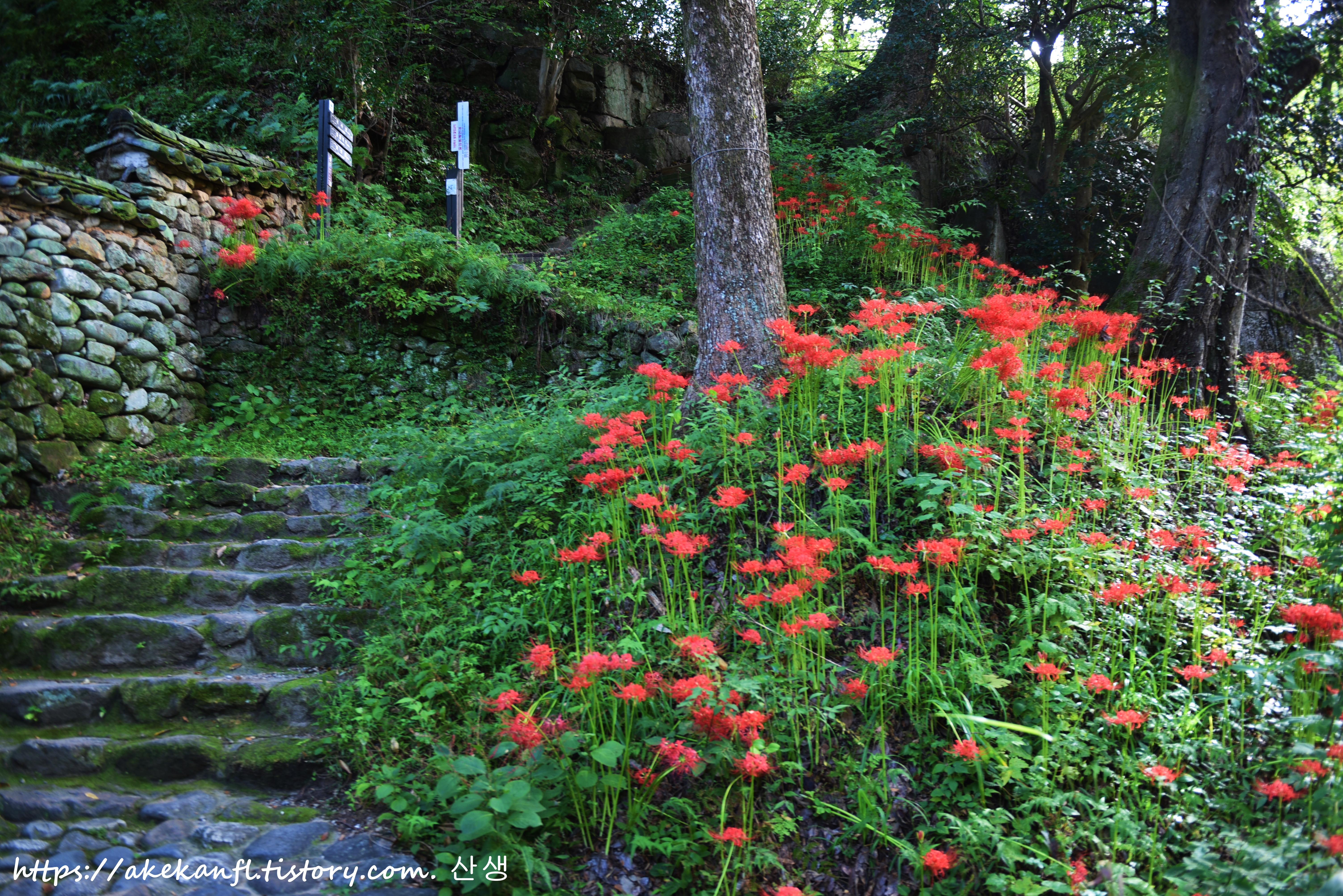 계단 쪽에서 꽃무릇과 어우러진