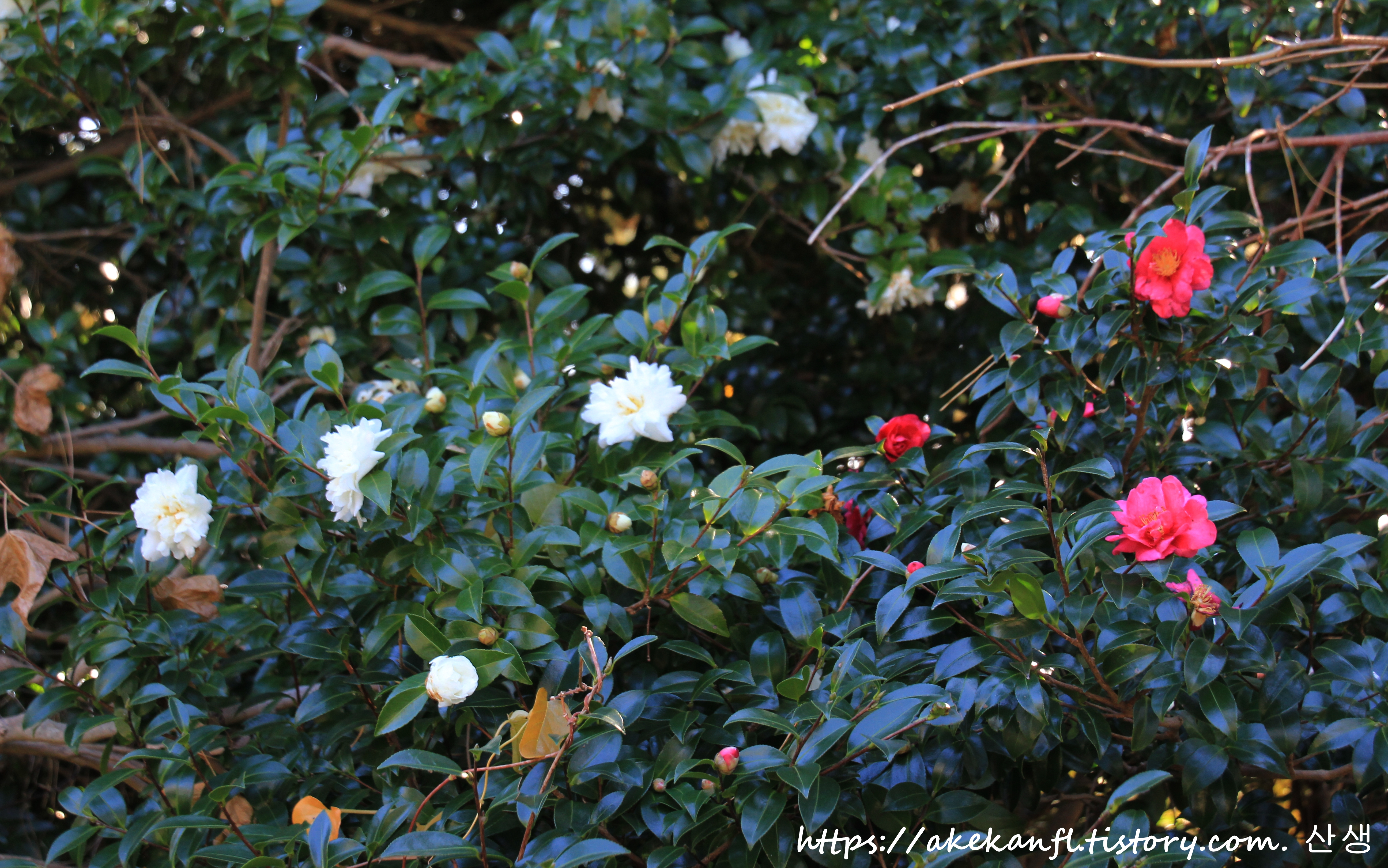 하얀 동백과 붉은 동백꽃을 당겨 담고....