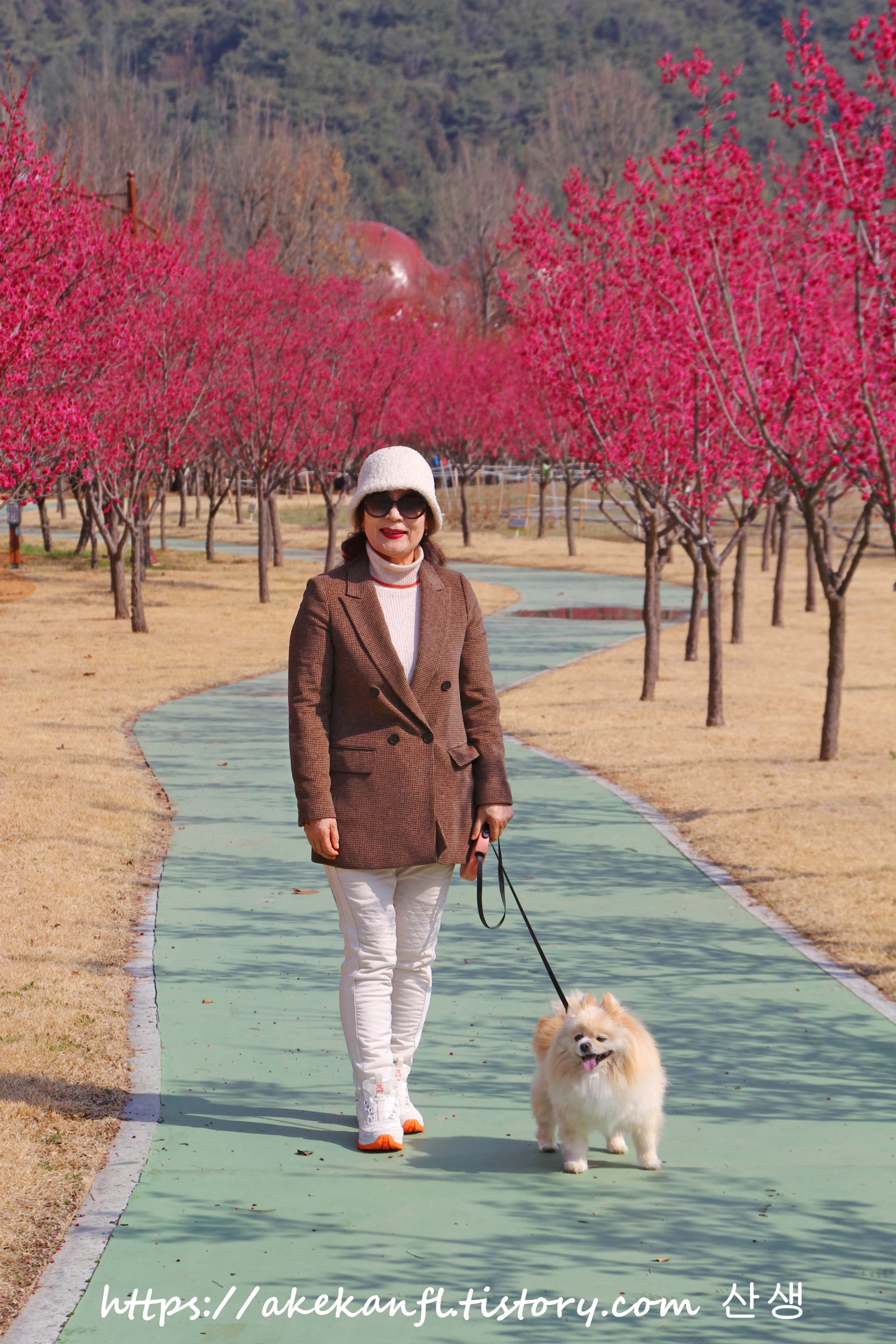 멀리 전망타워와 홍매 꽃길을 더 당겨 담고...