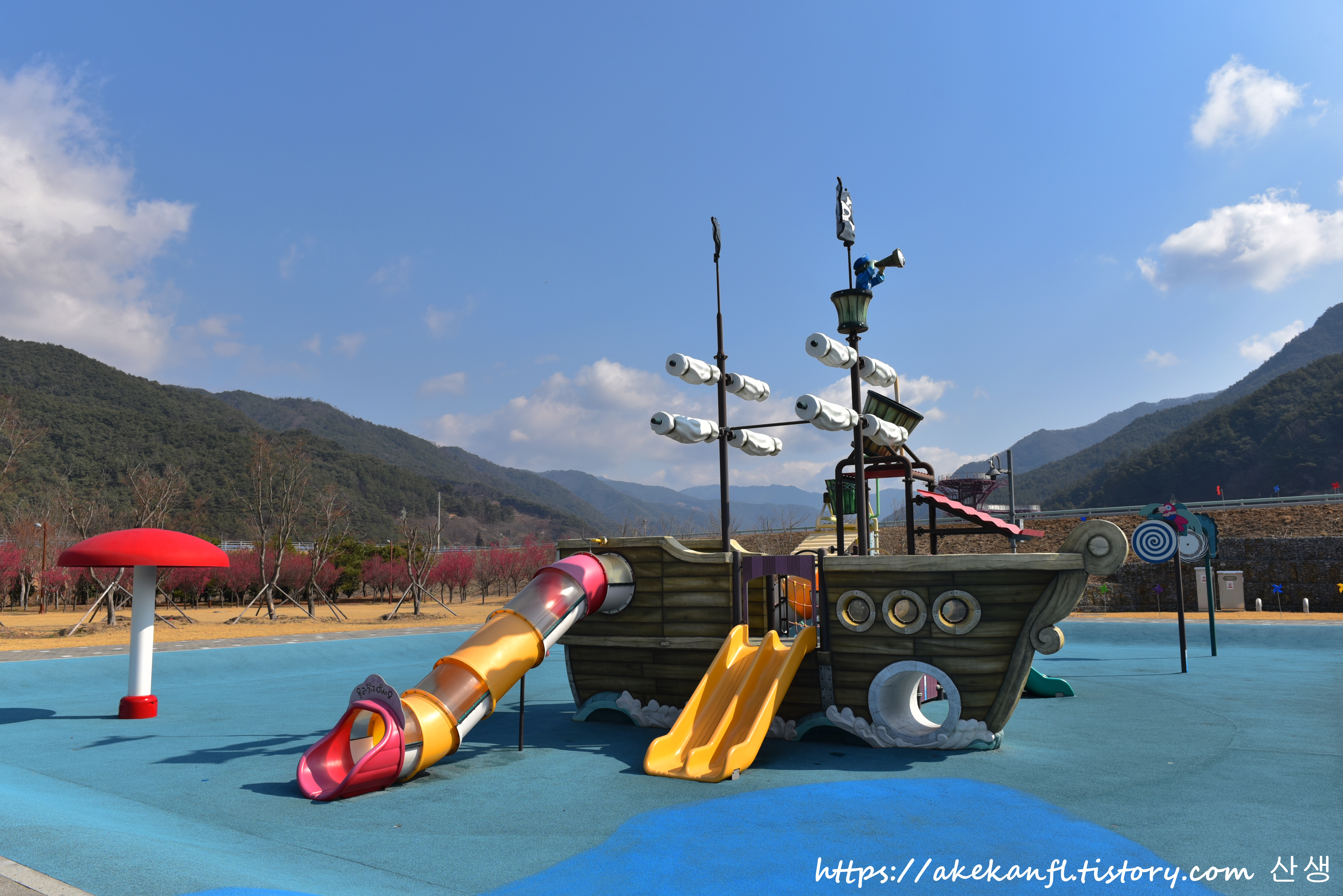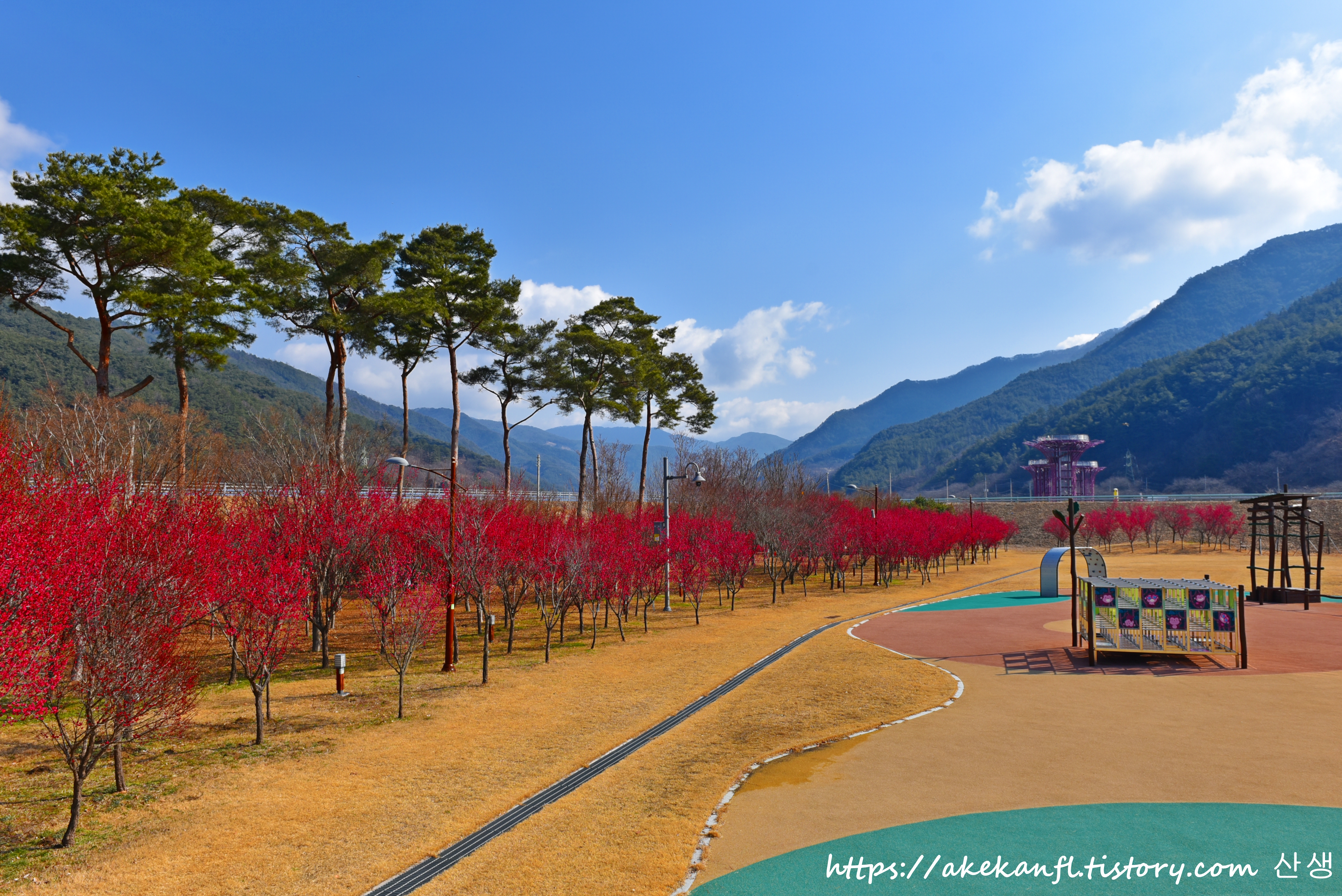 놀이시설 언덕에서 홍매 꽃길을 배경으로...