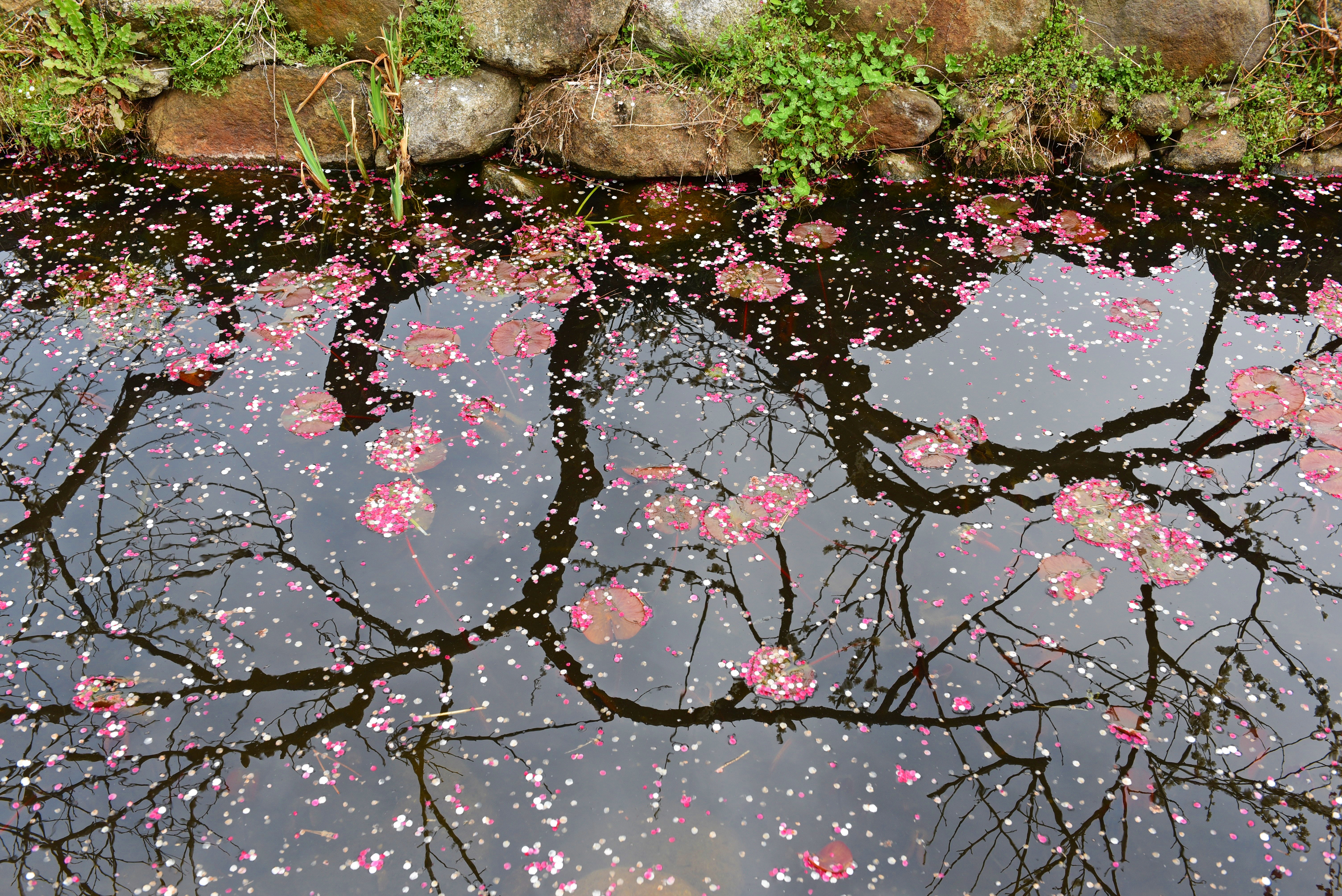 물 위에 떨어진 분홍빛 꽃잎이