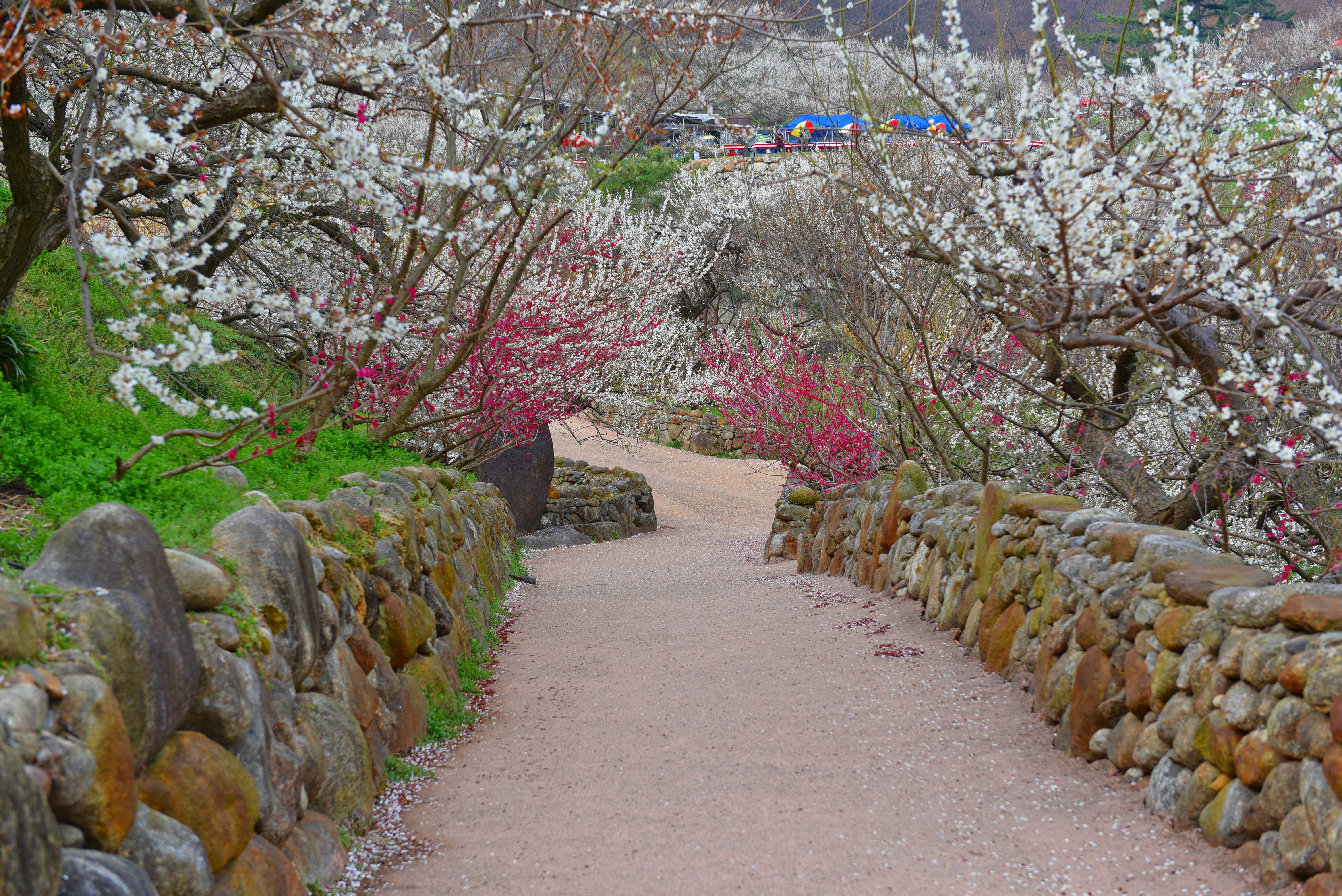 농원 노점상 앞 매화꽃길은