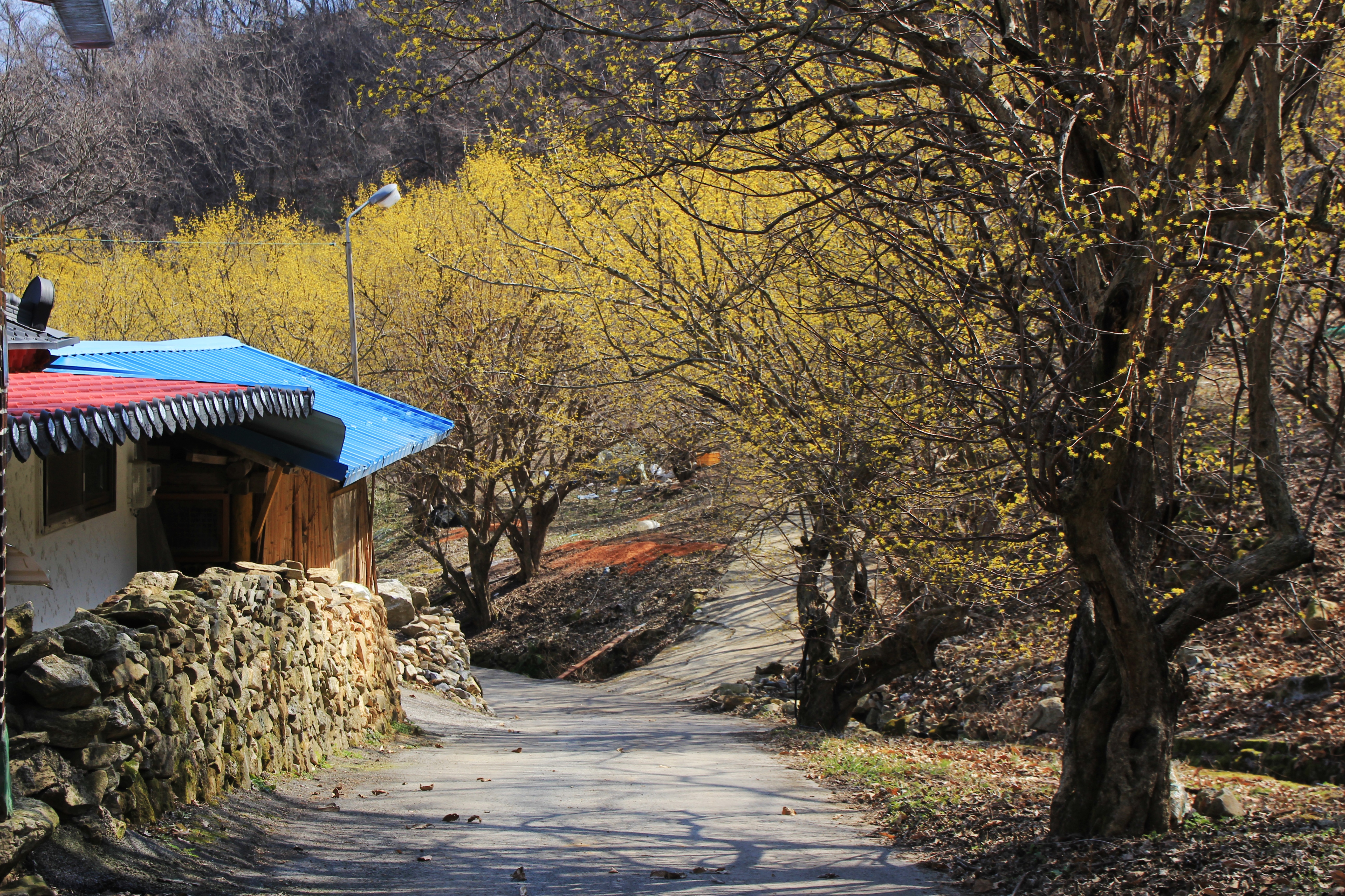 언덕길의 활짝 핀 산수유꽃을 당겨 담고....