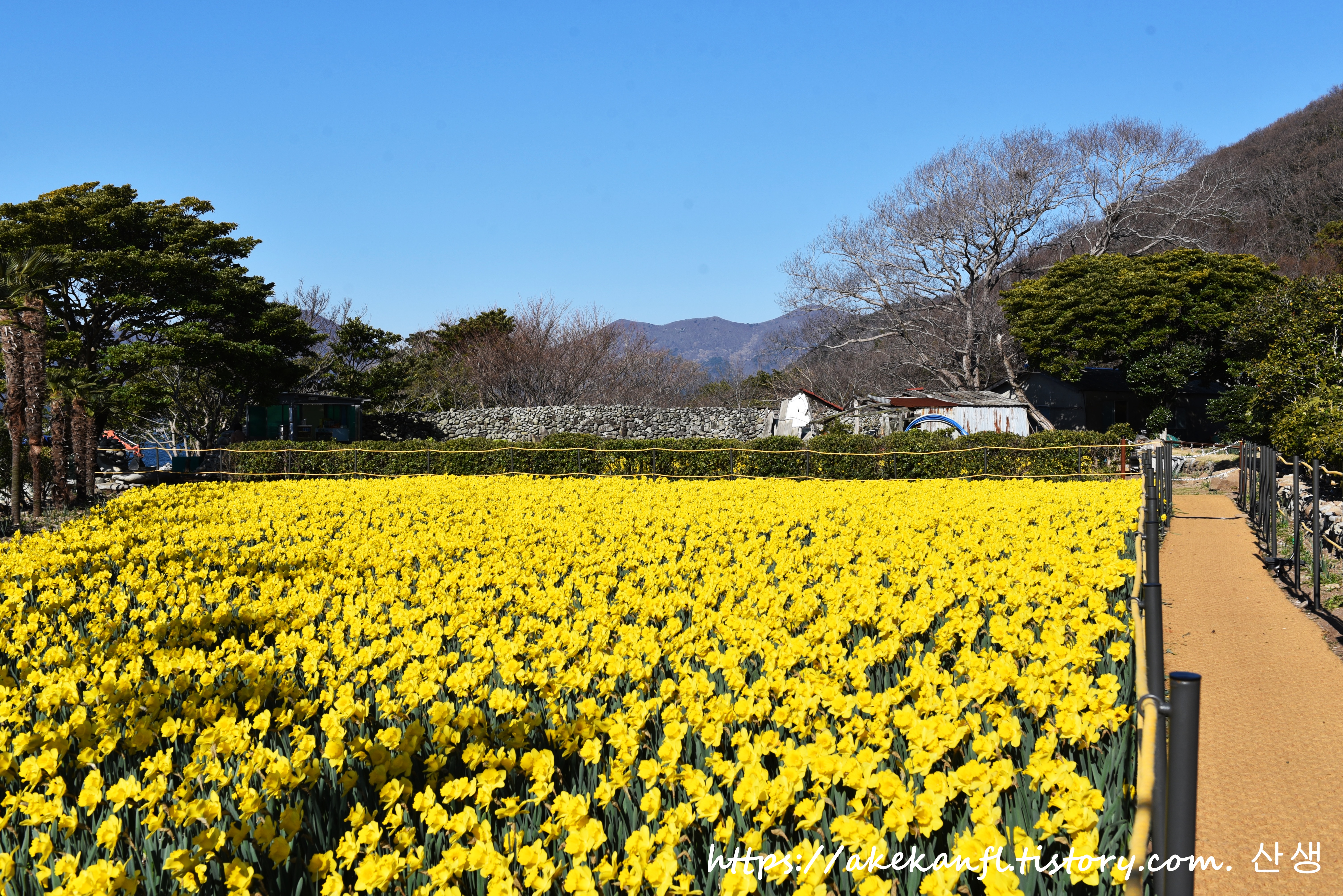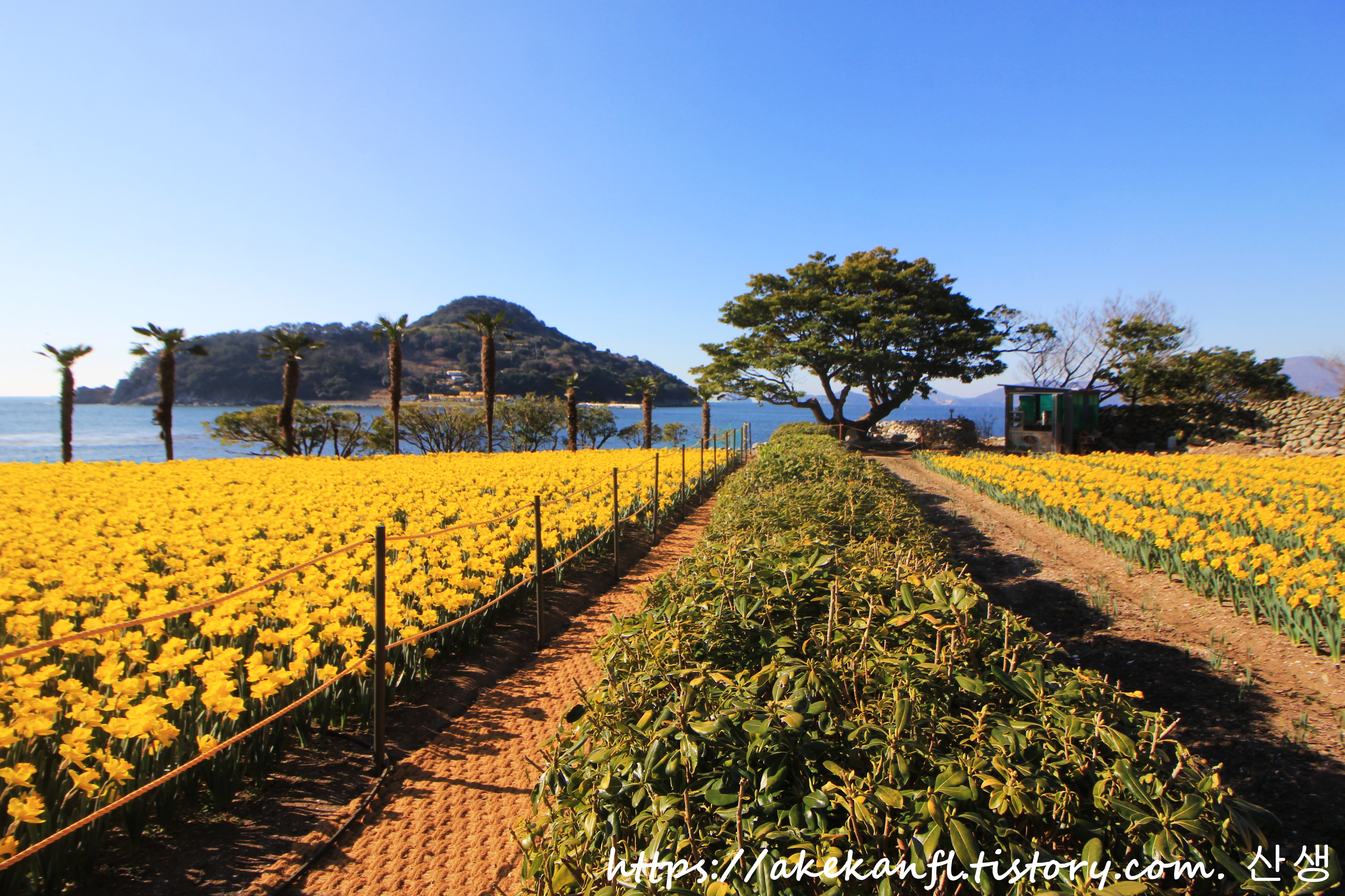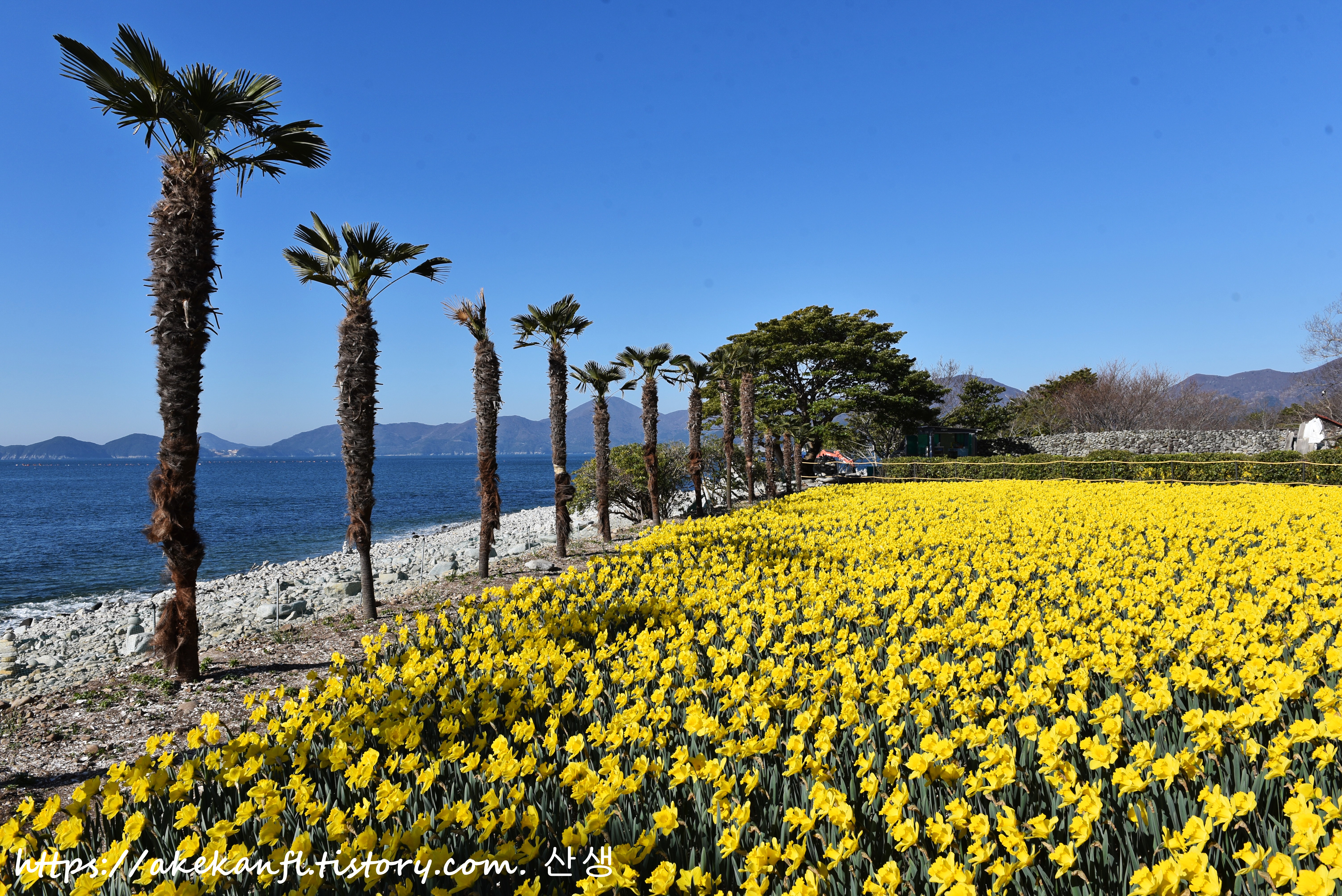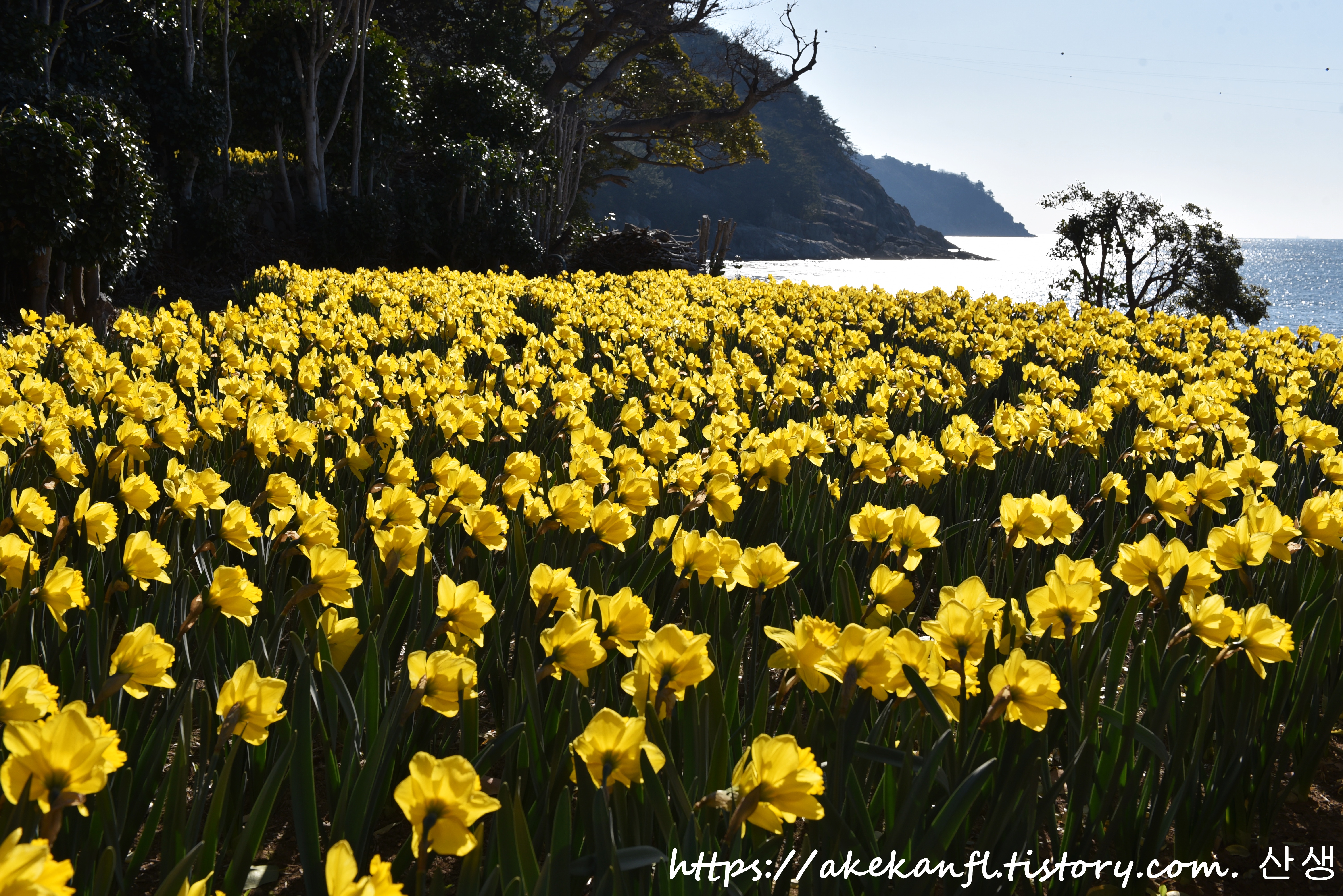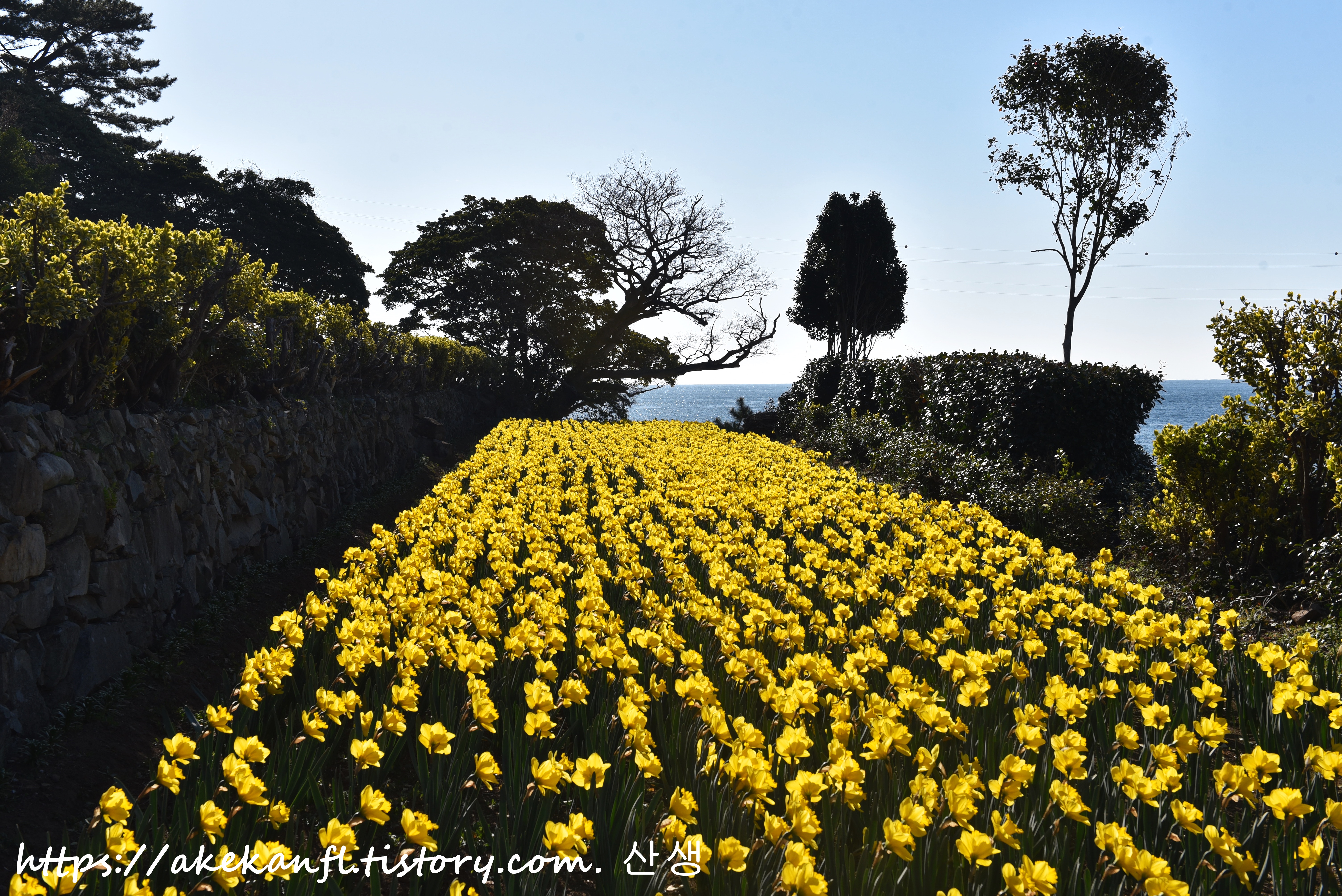 탐방로 해안 쪽의 수선화 꽃밭도 담고...