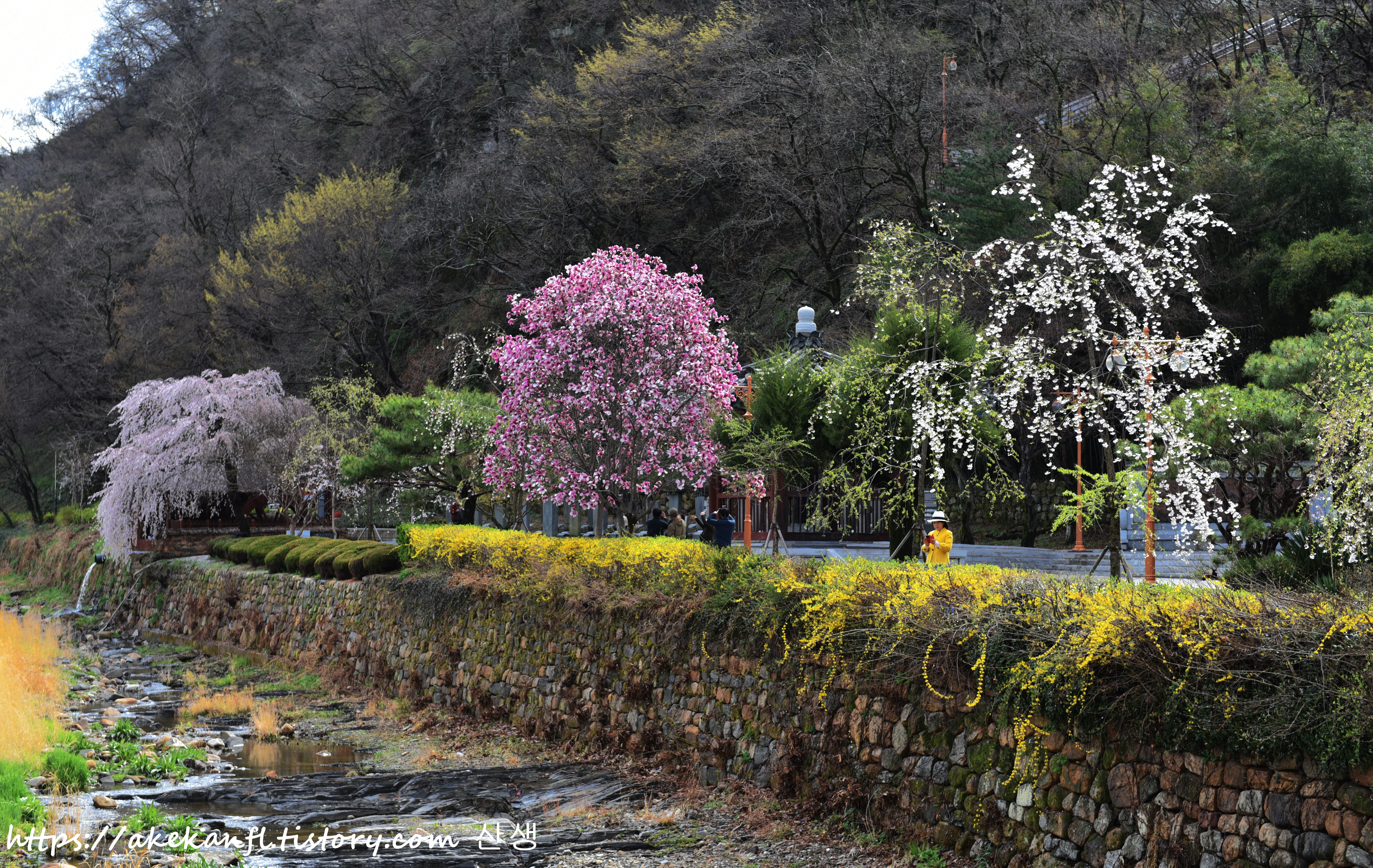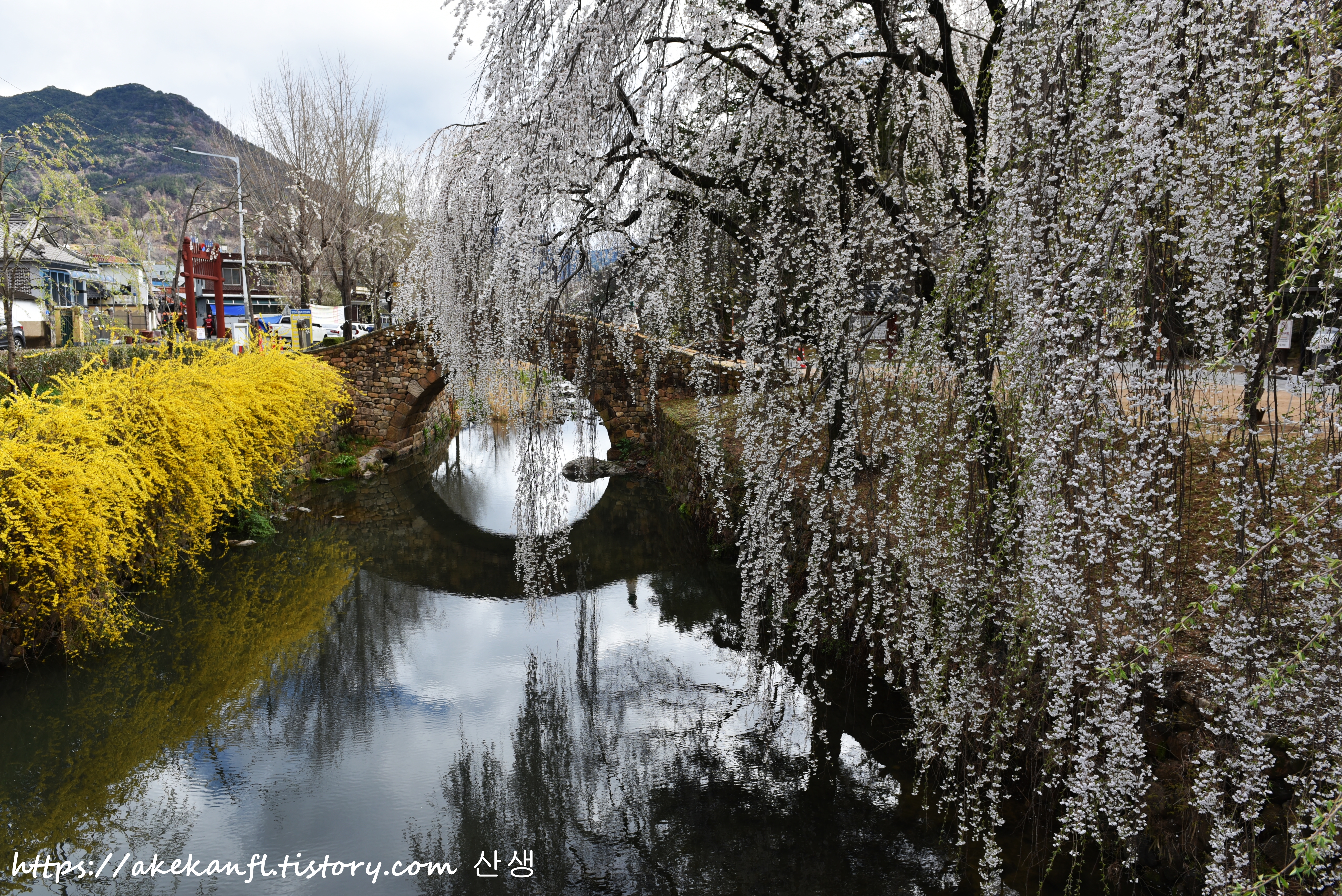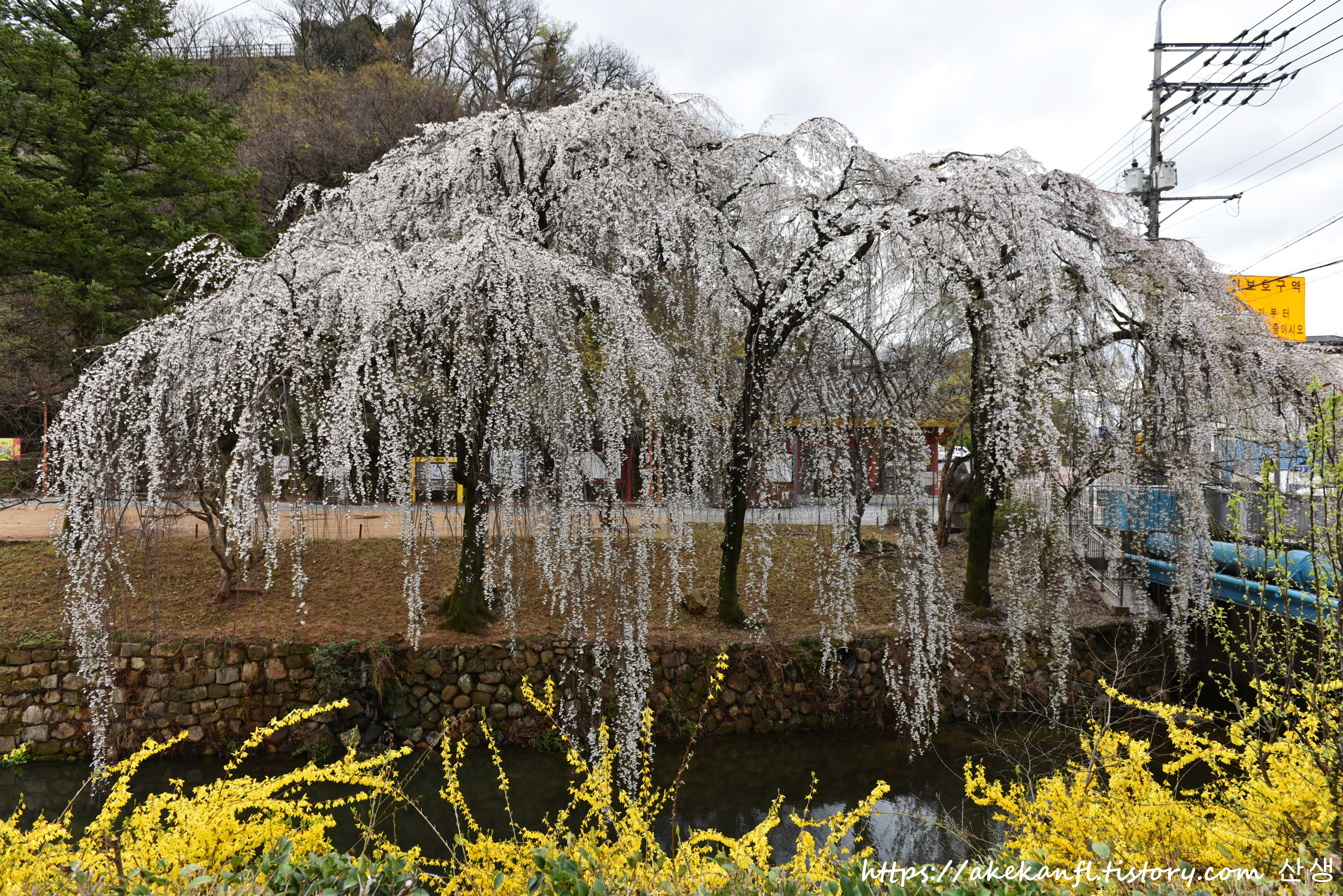 노란 개나리와 하얀 수양벚꽃이 어우러진