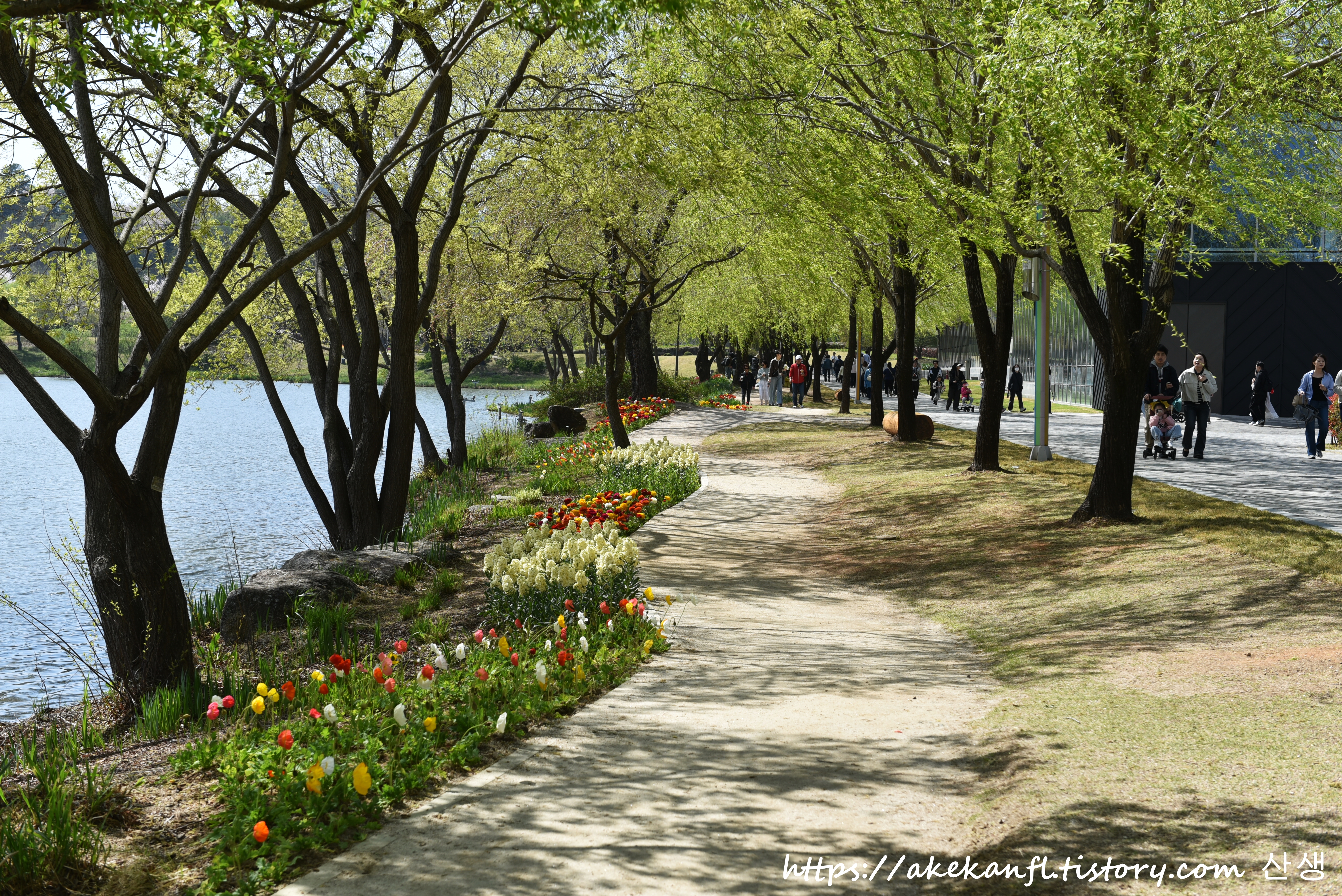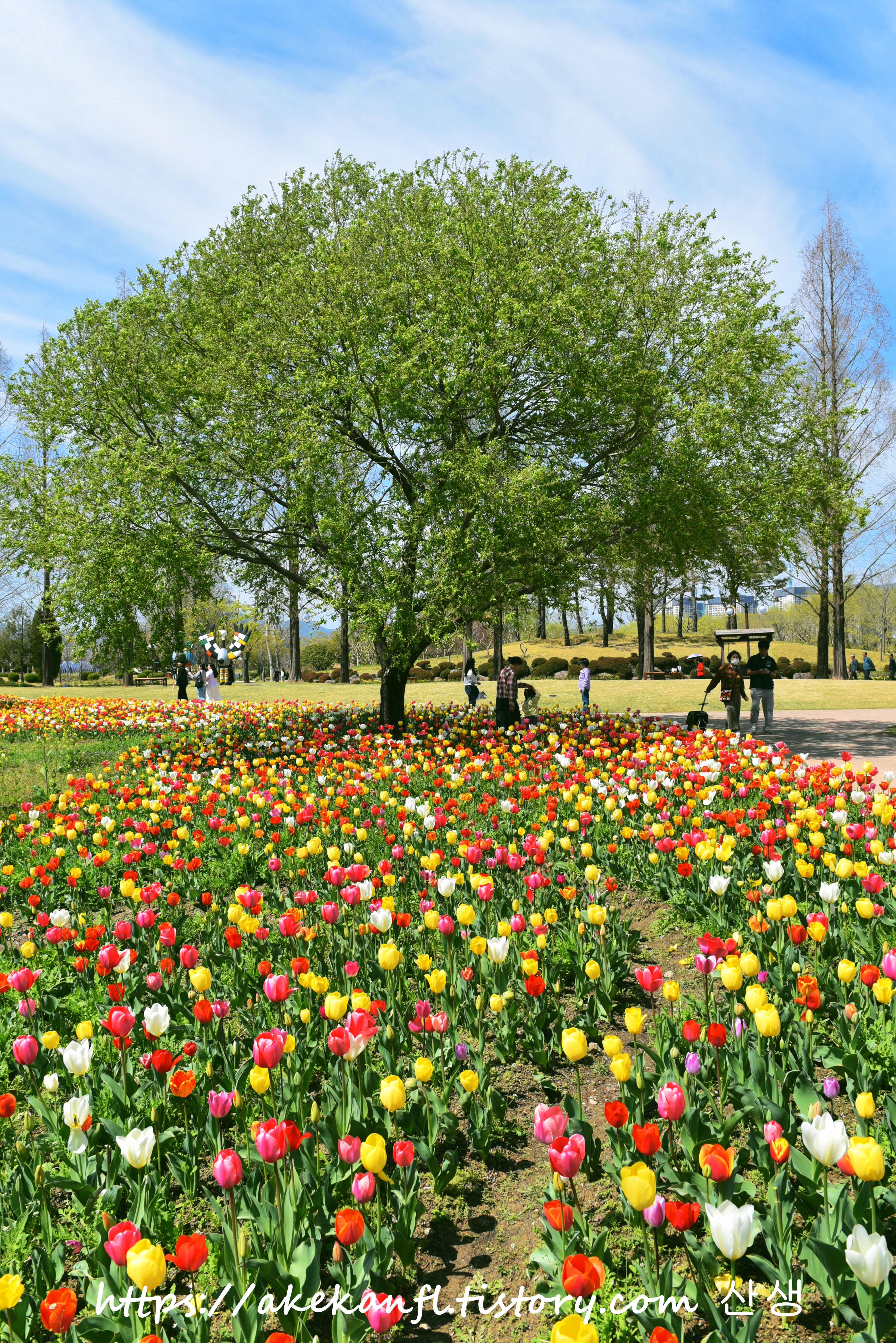 수양버드나무 쪽 튤립꽃밭을 크게 담아본다