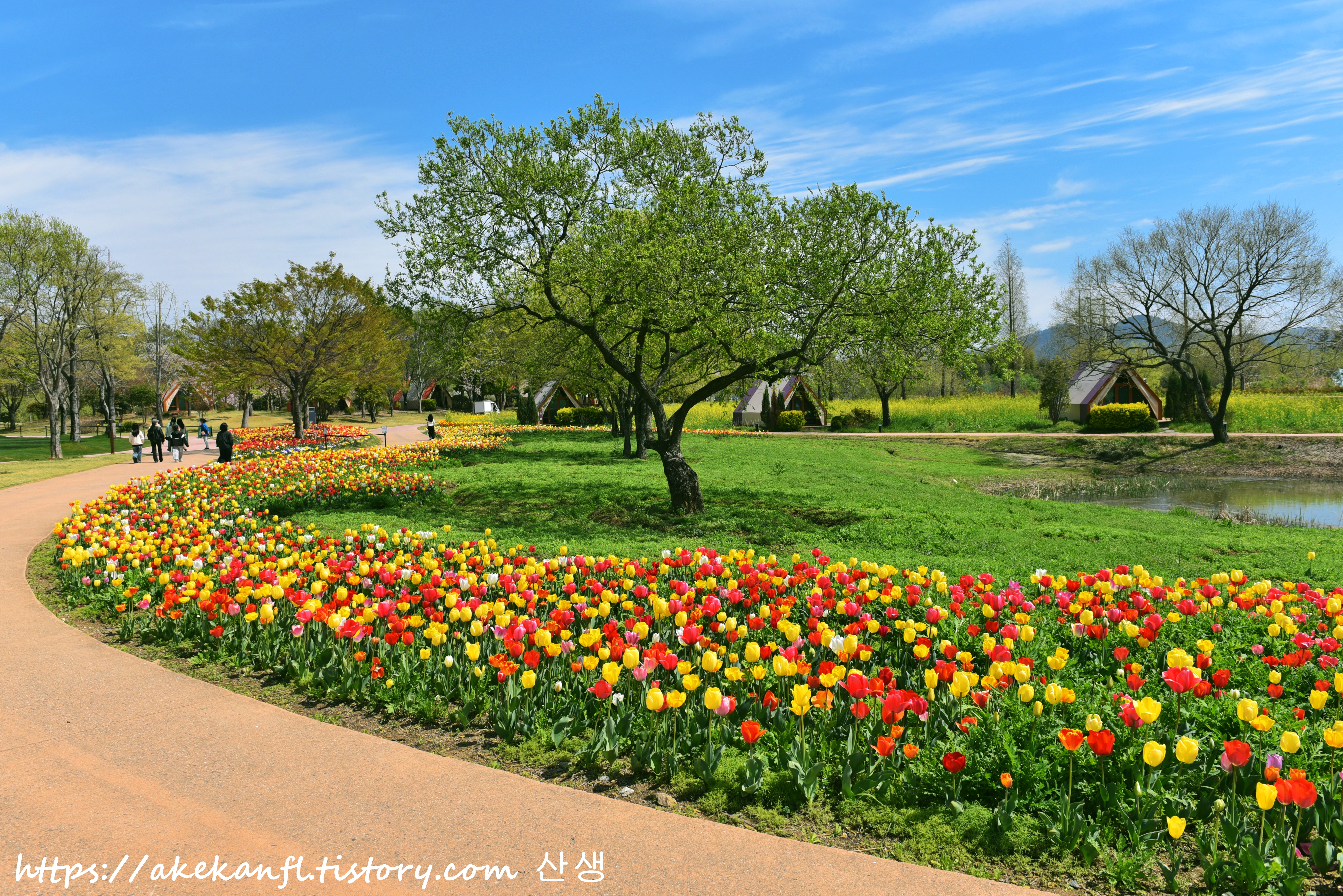 연초록 숲과 눈부신 튤립꽃밭의 조화